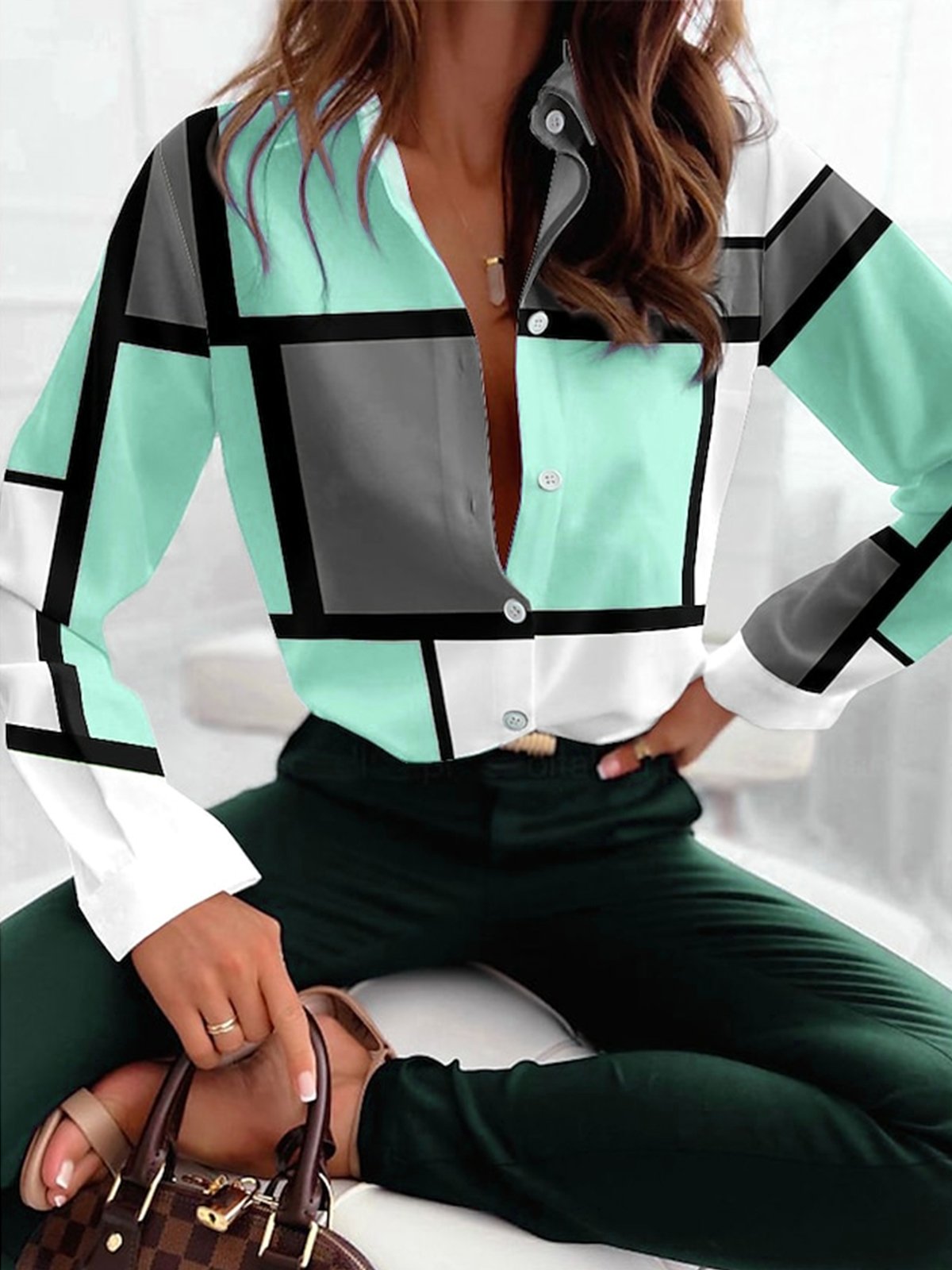 Fashion Long Sleeve Shirt Collar Geometric Loose Regular Shirt - Pink / S is backordered and will ship as soon as it is back in stock.