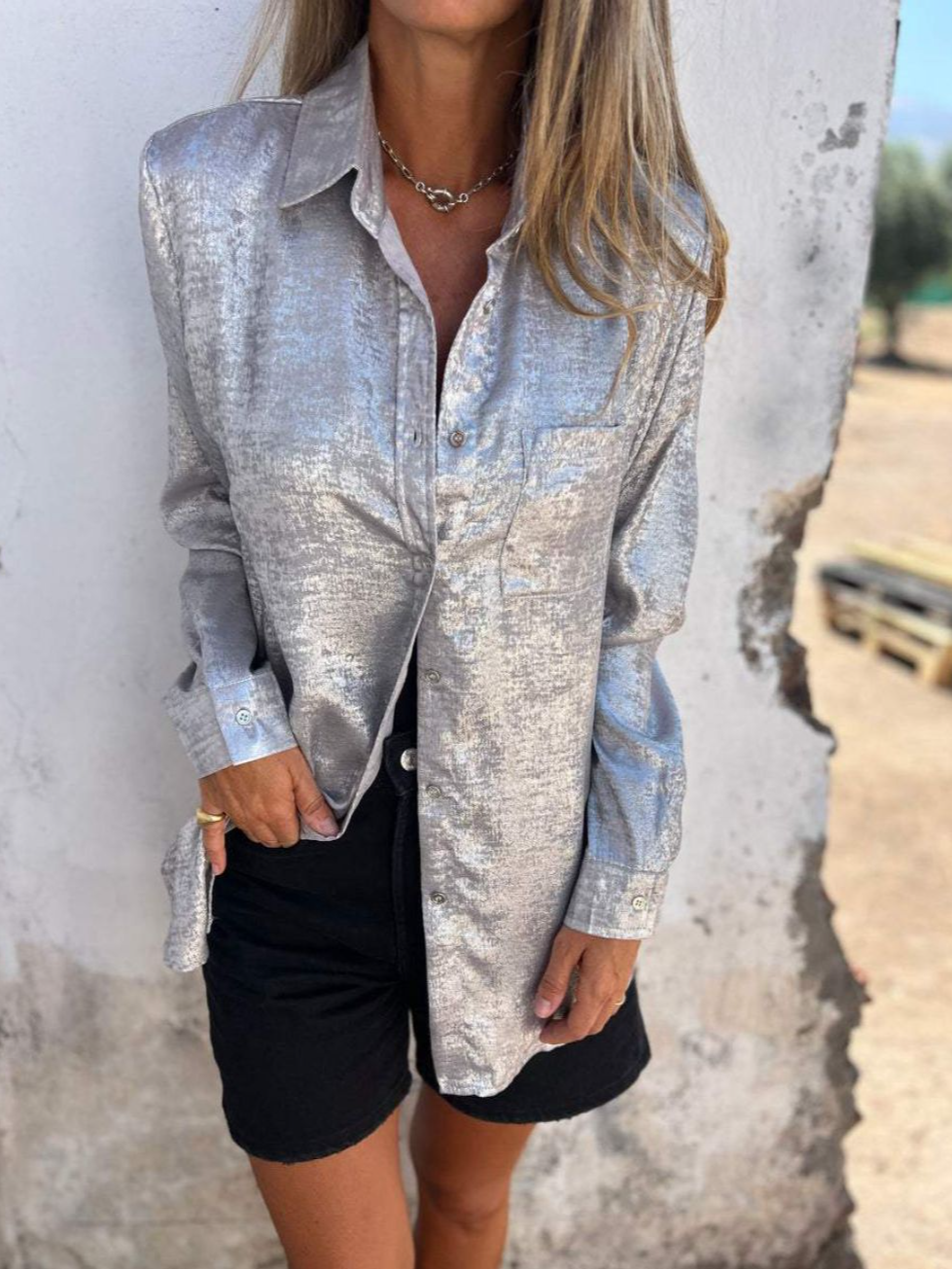 Fashion Long Sleeve Shirt Collar Plain Loose Regular Shirt - Silver / S is backordered and will ship as soon as it is back in stock.