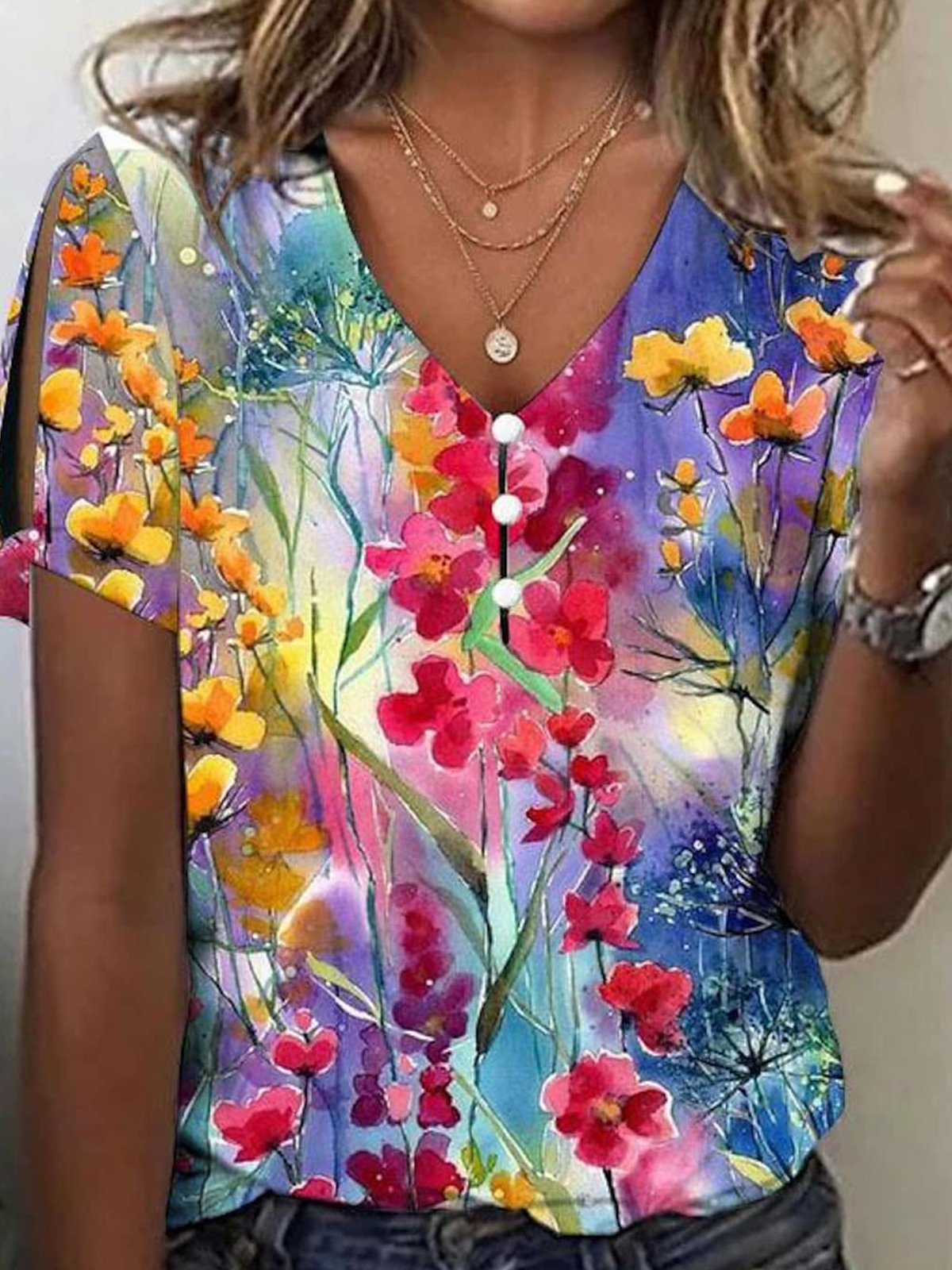 Fashion V Neck Short Sleeve Floral Casual Regular Blouses - Blue / S is backordered and will ship as soon as it is back in stock.