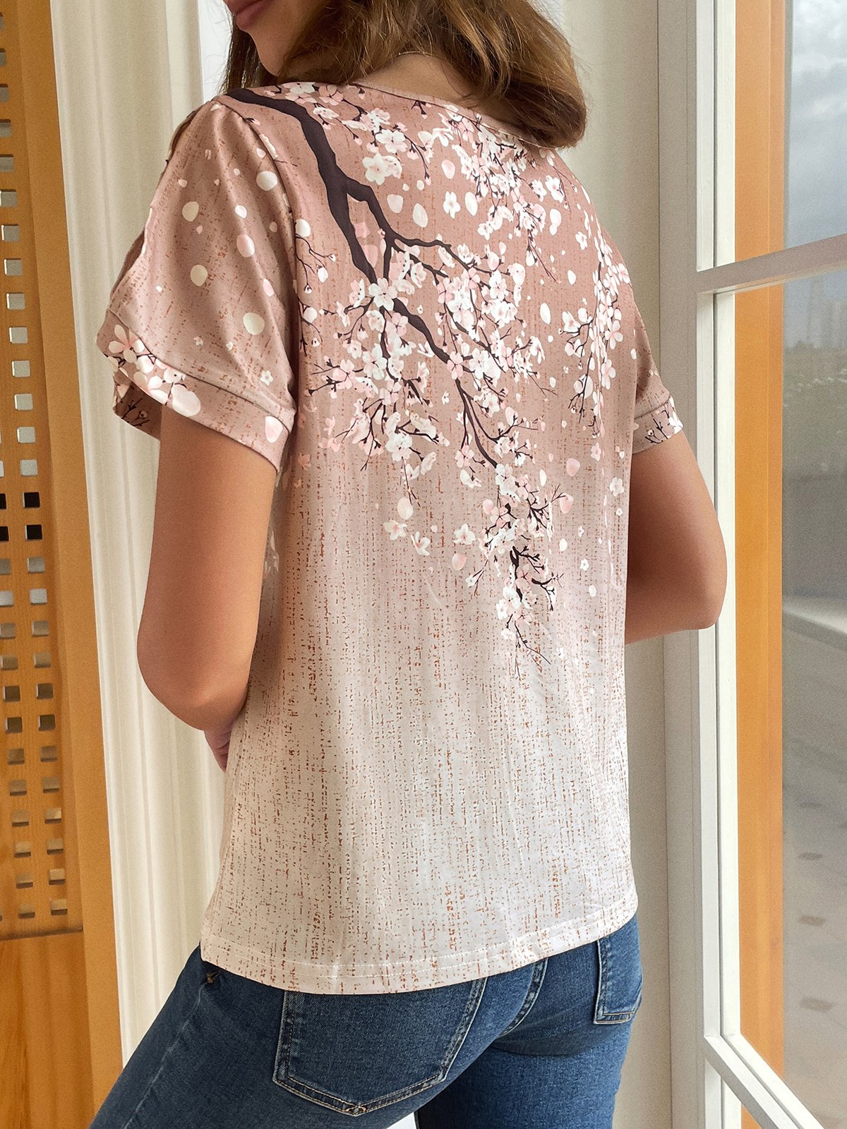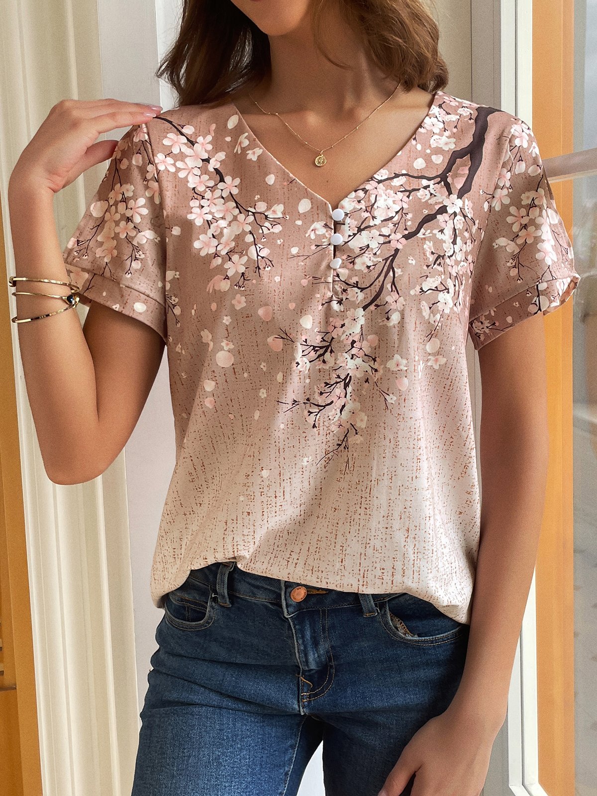 Fashion V Neck Short Sleeve Floral Loose Regular Blouse - Khaki / S is backordered and will ship as soon as it is back in stock.