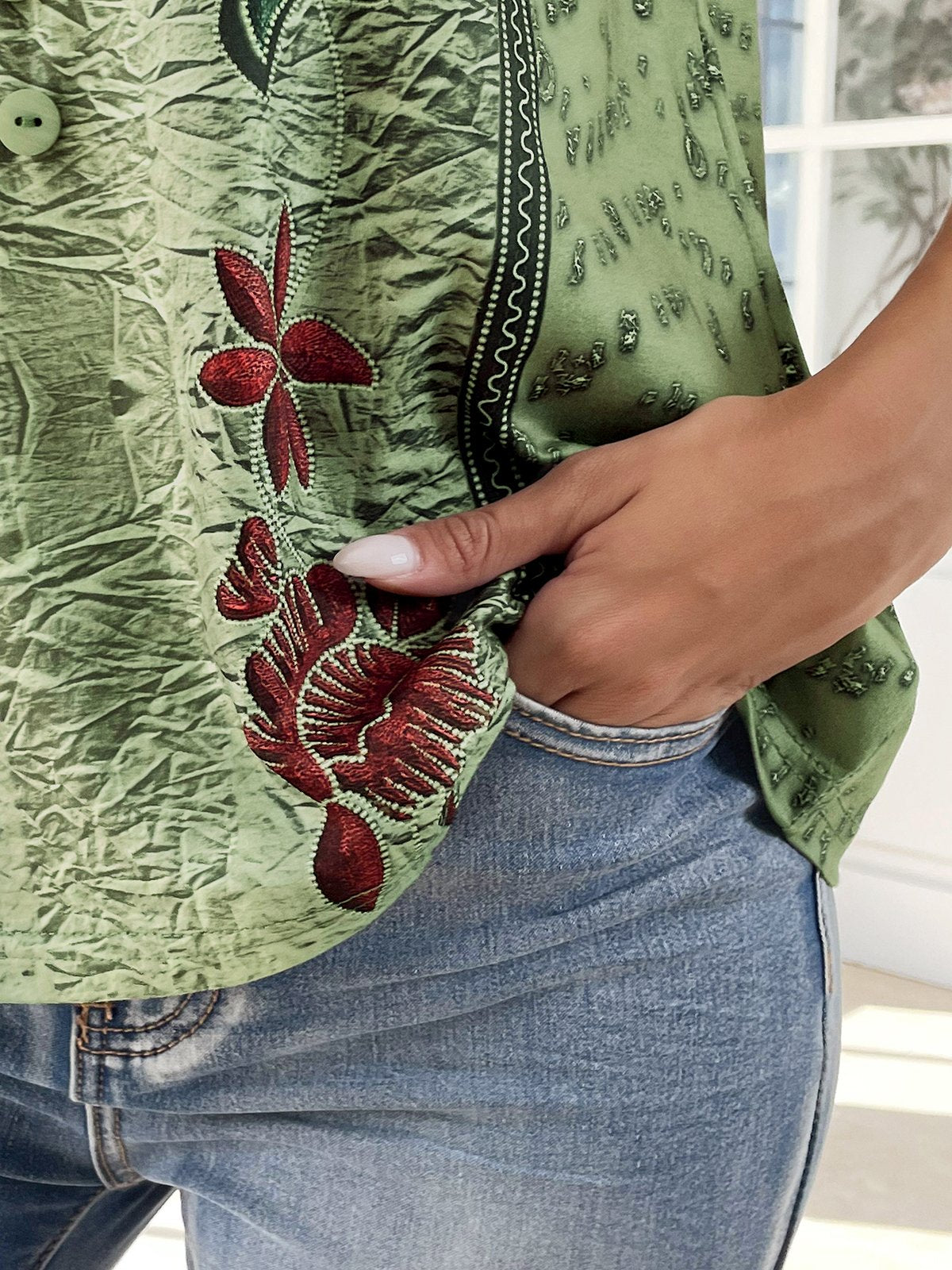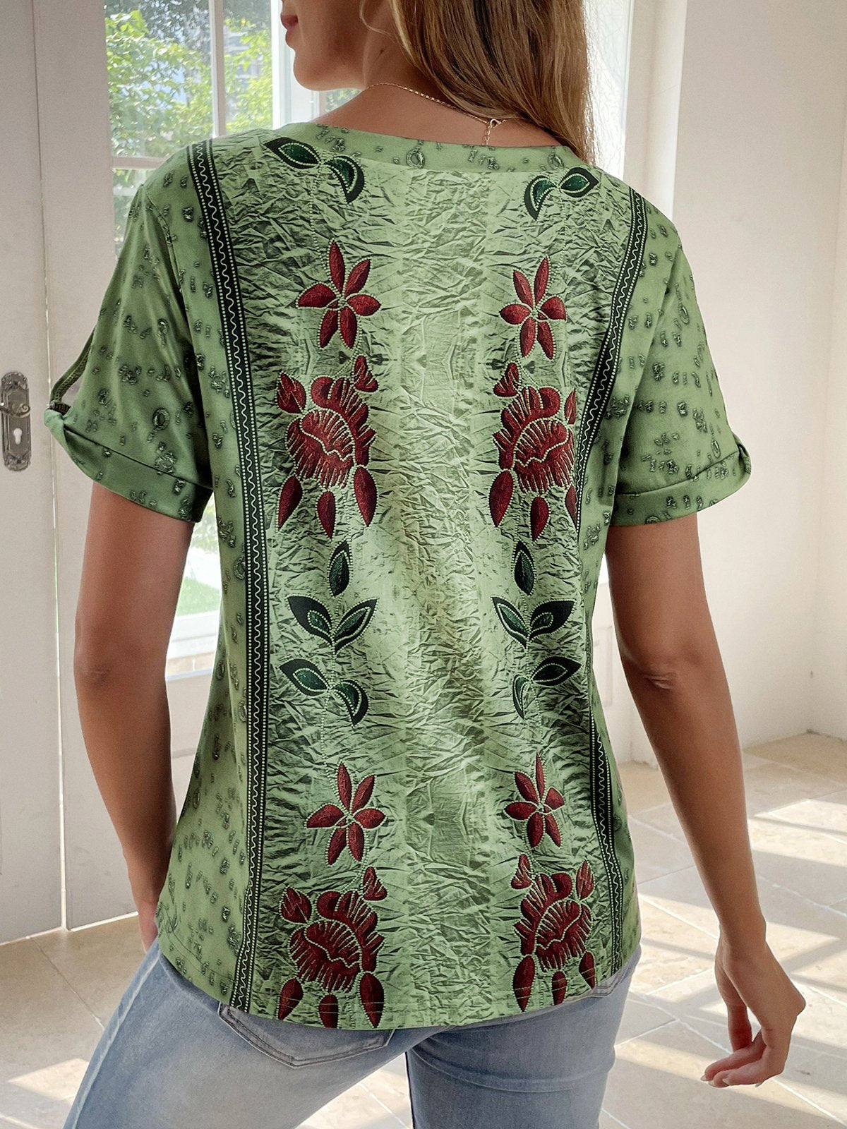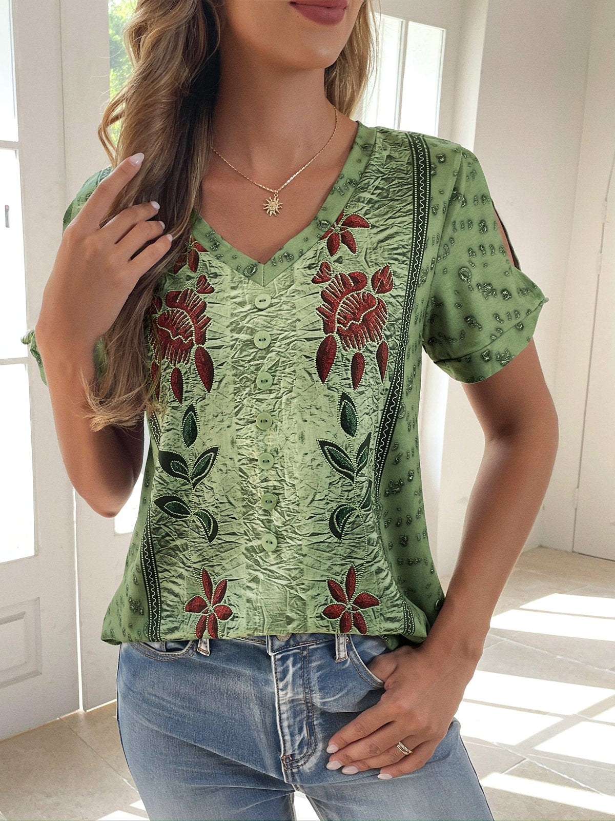 Fashion V Neck Short Sleeve Floral Loose Regular Blouse - Green / S is backordered and will ship as soon as it is back in stock.