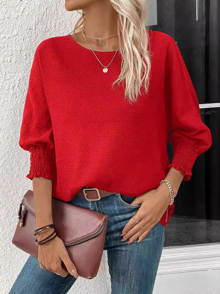 Loose 3/4 Sleeve Crew Neck Plain Fashion Regular Blouse - Red / S is backordered and will ship as soon as it is back in stock.
