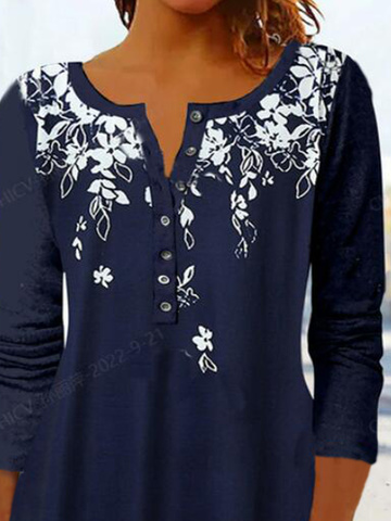 Loose Crew Neck Long Sleeve Floral Fashion Regular Blouses - Navy Blue / S is backordered and will ship as soon as it is back in stock.