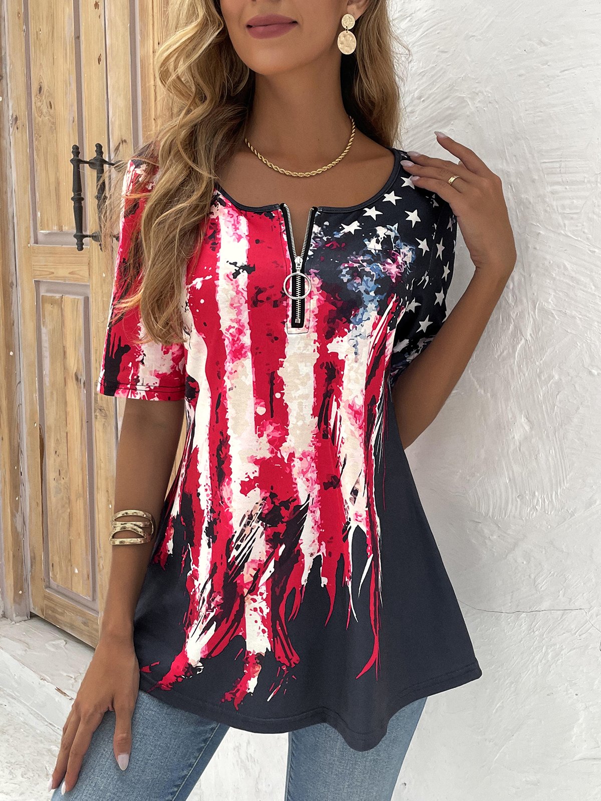 Loose Short Sleeve Crew Neck America Flag Zipper Fashion Mid-Long Blouse - Multicolor / S is backordered and will ship as soon as it is back in stock.