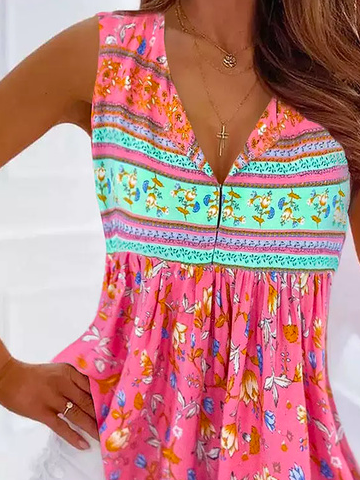 Loose V Neck Sleeveless Floral Vacation Mid-Long Tank Top - Pink / S is backordered and will ship as soon as it is back in stock.