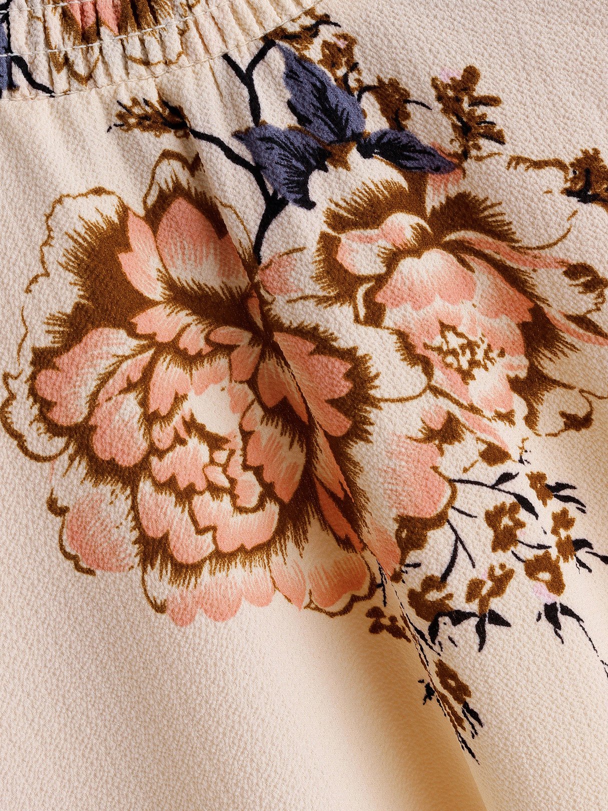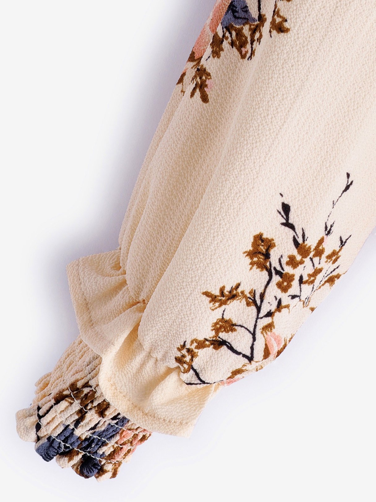 Perkins Collar Floral Print Pleated Long Sleeve Beige Blouses