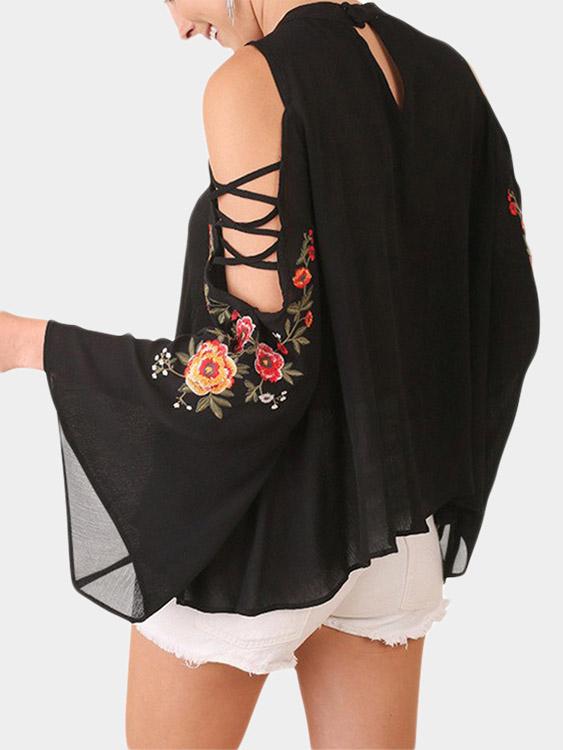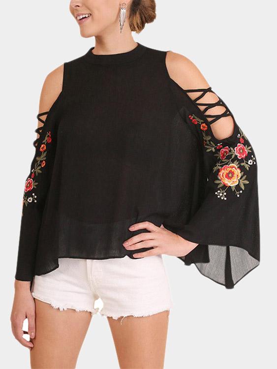Round Neck Cold Shoulder Embroidered Cut Out Long Sleeve Black Top