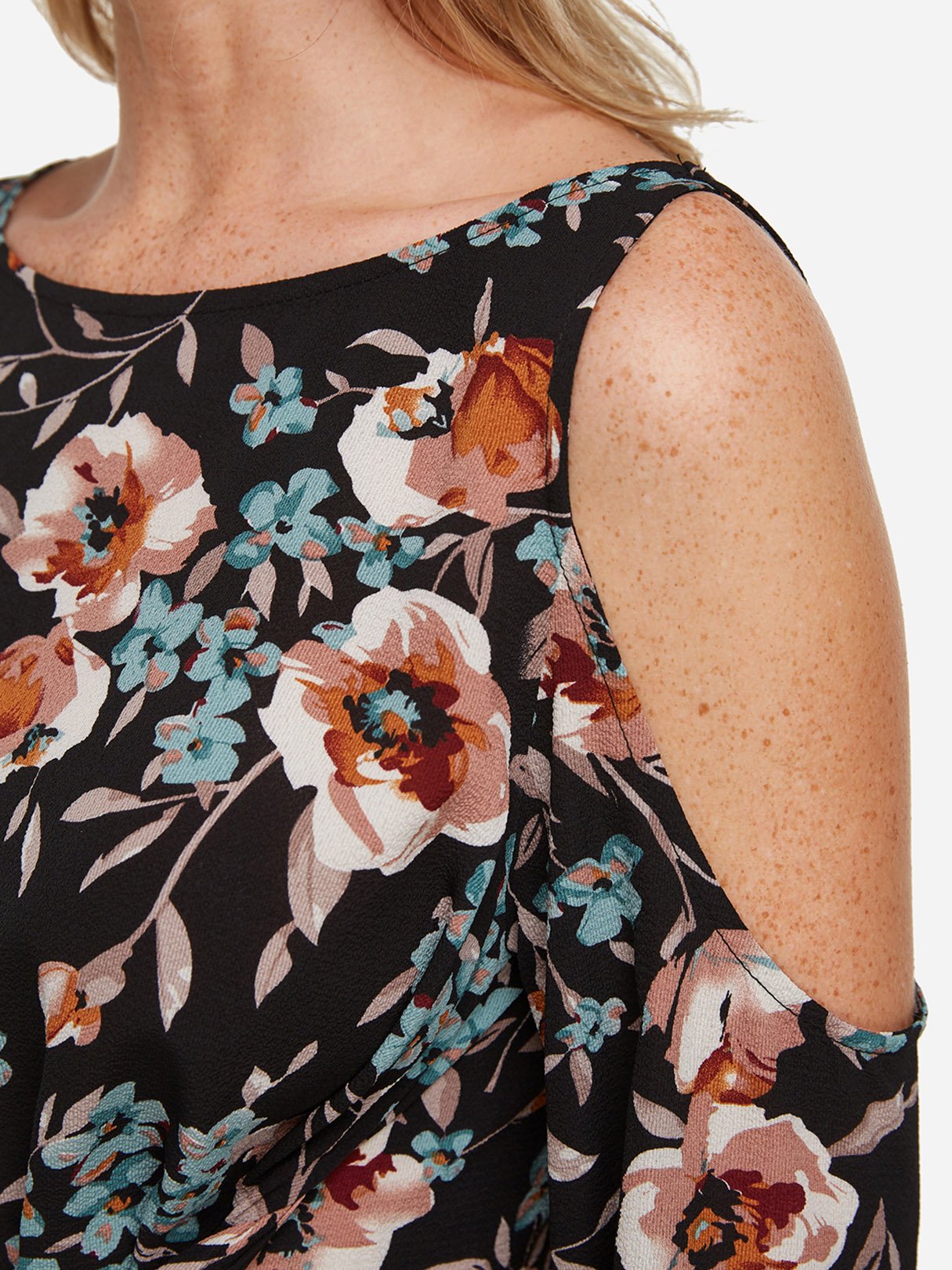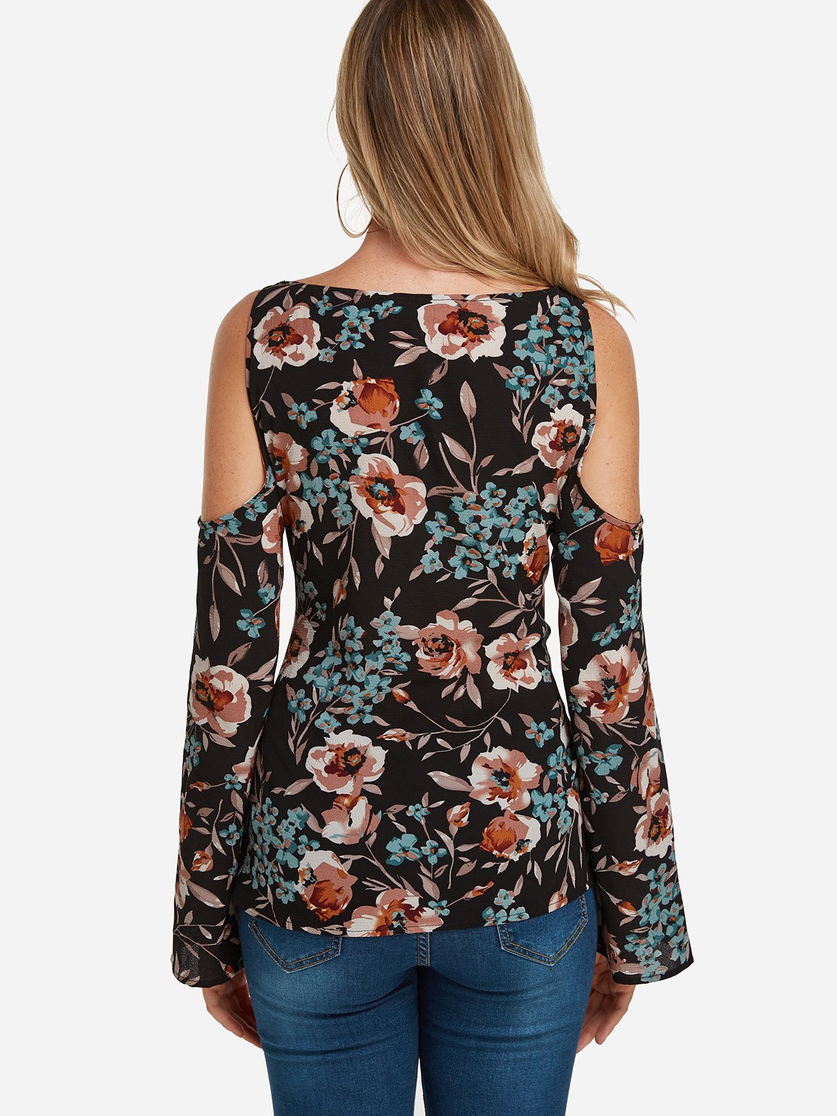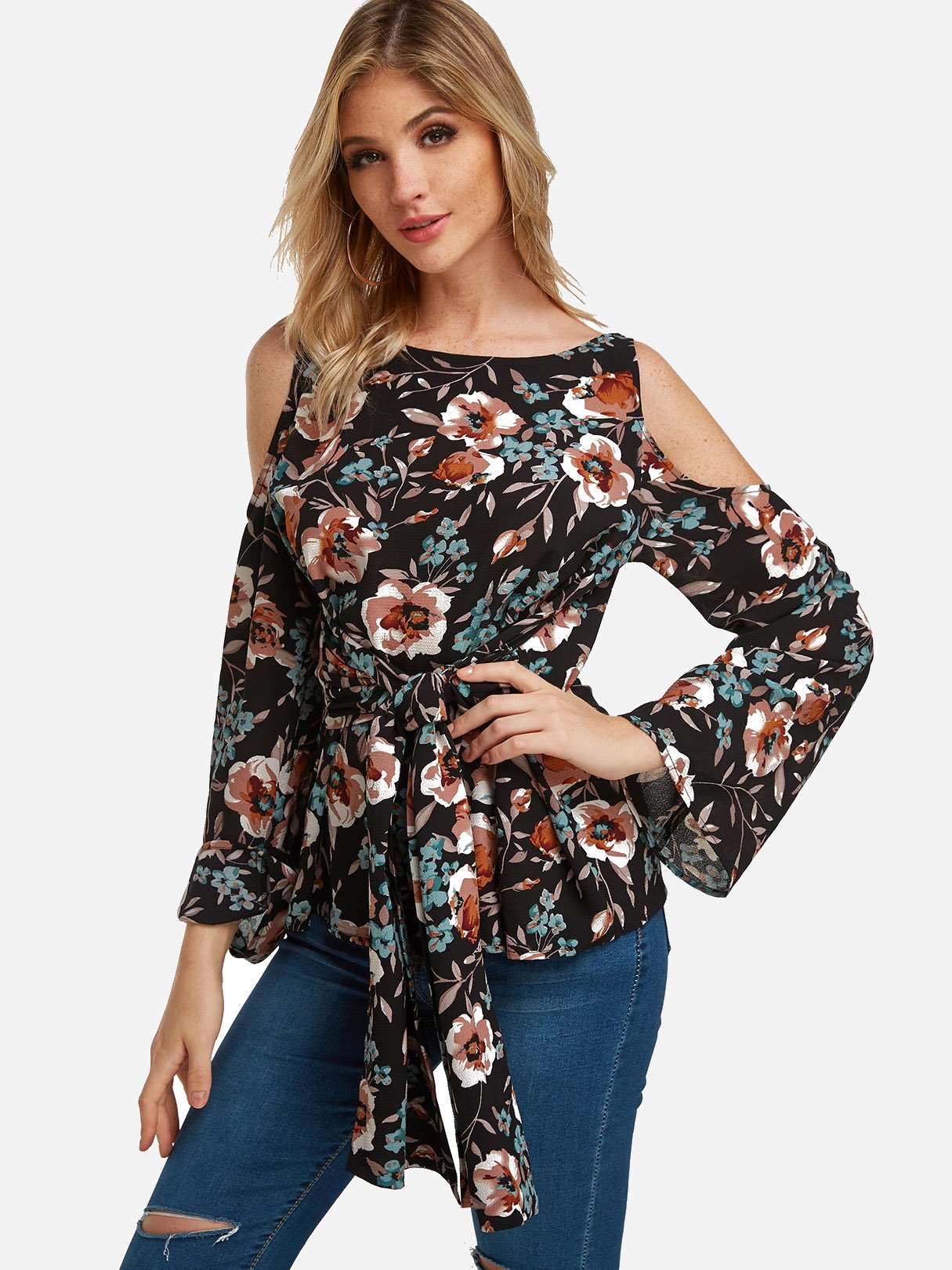 Round Neck Cold Shoulder Floral Print Cut Out Tie-Up Long Sleeve Blouses