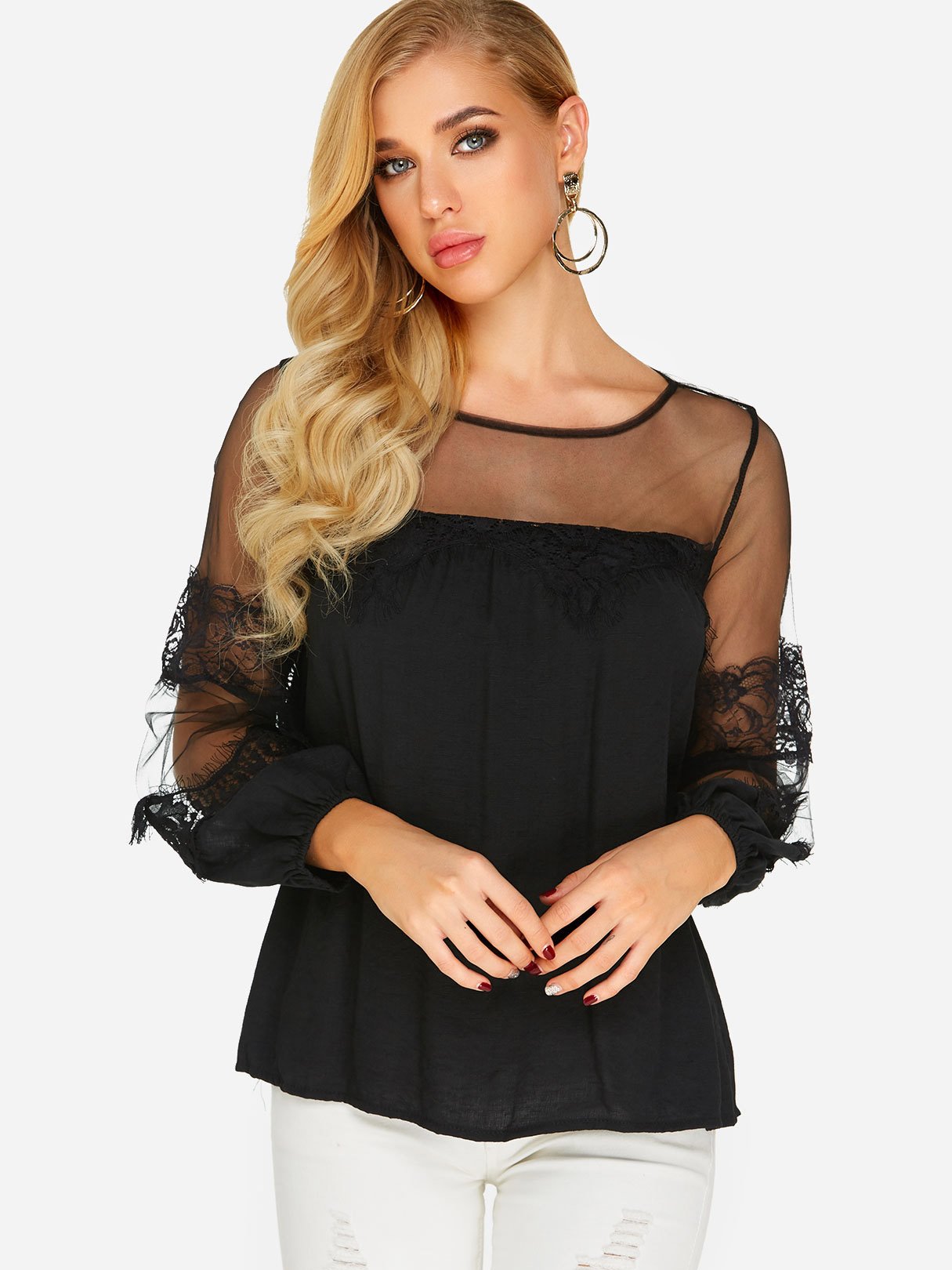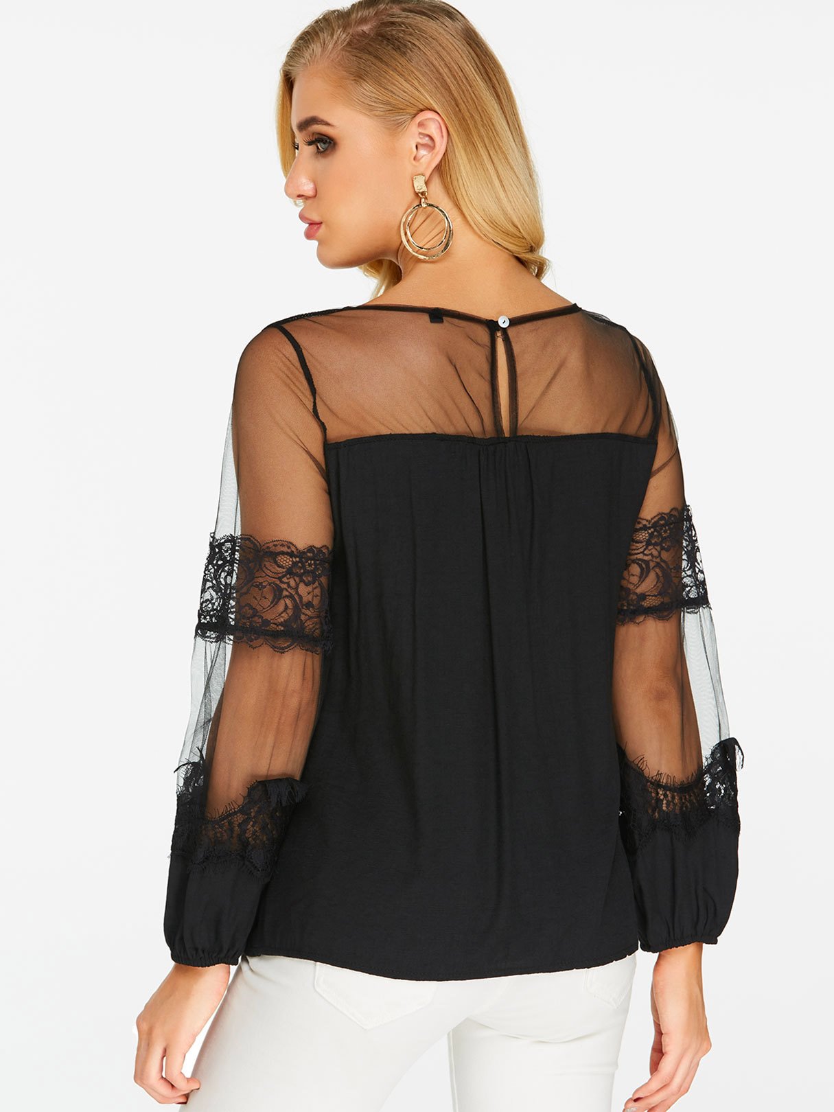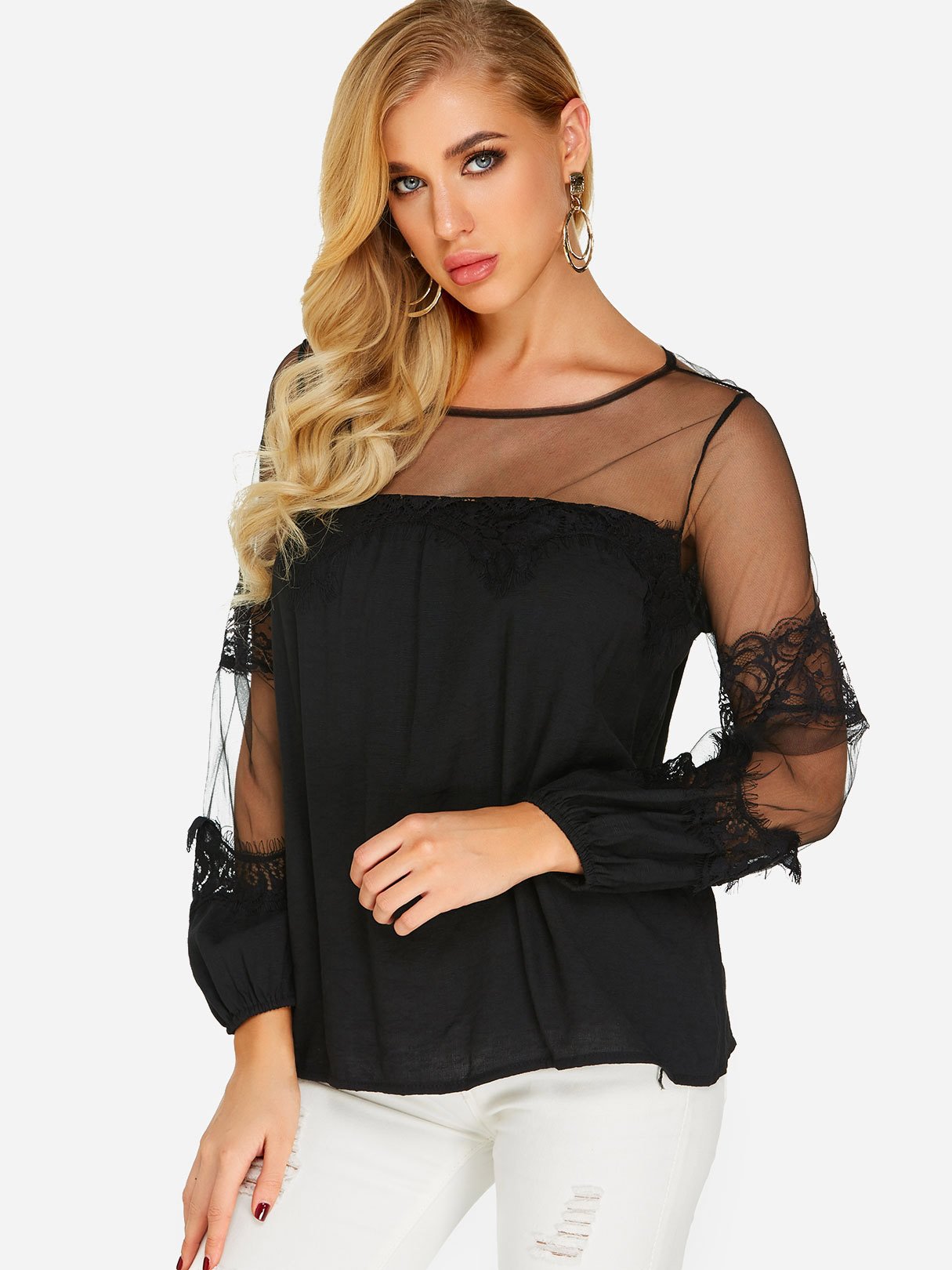 Material:Polyester,OtherNeckline:Round NeckSeason:Spring,SummerSleeves:Long SleevesStyle:Casual StyleDetail:LaceFit:Loose Fit