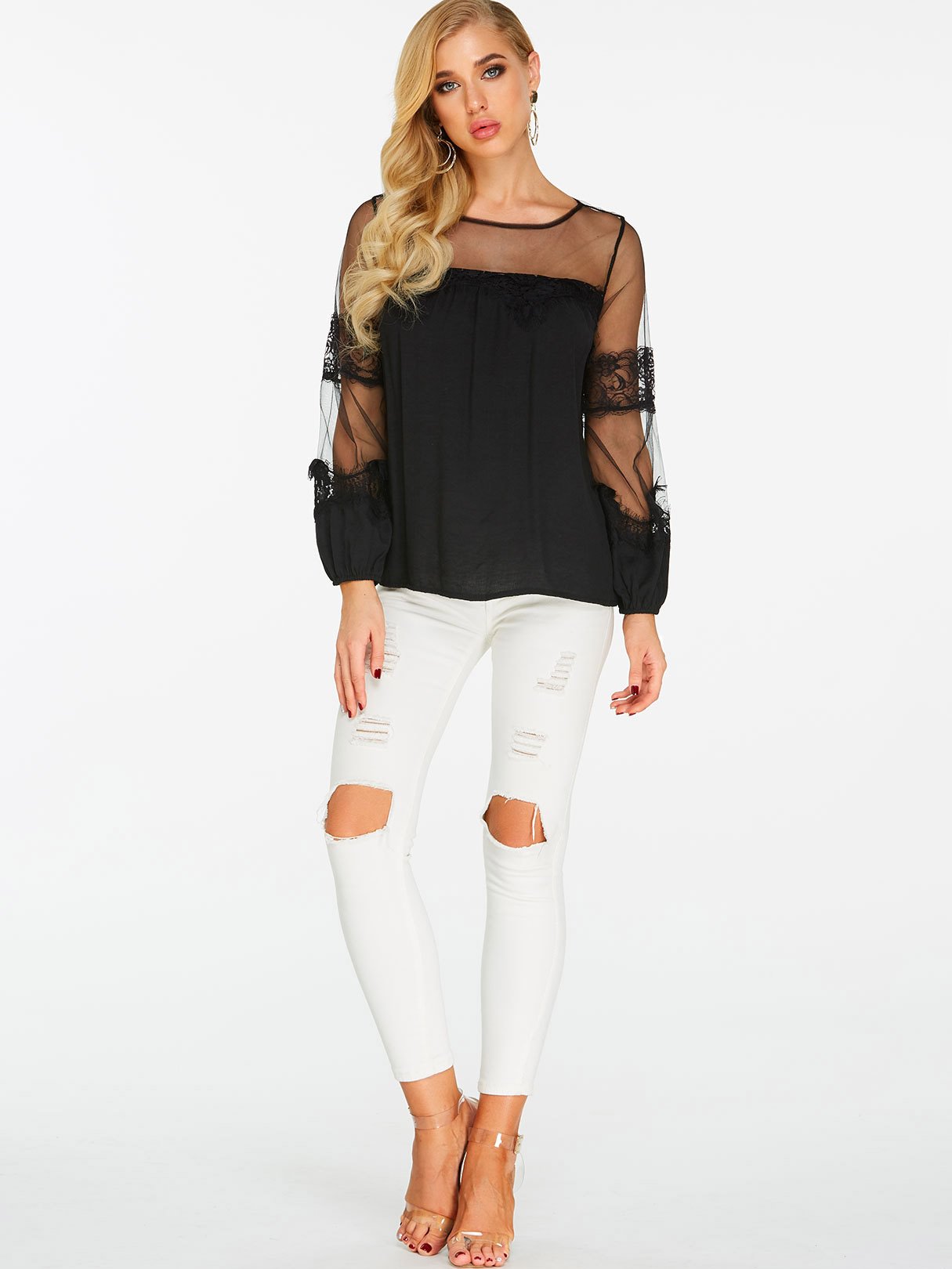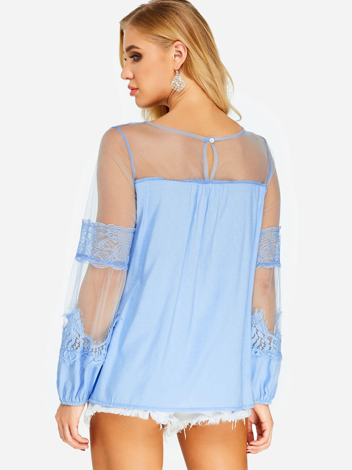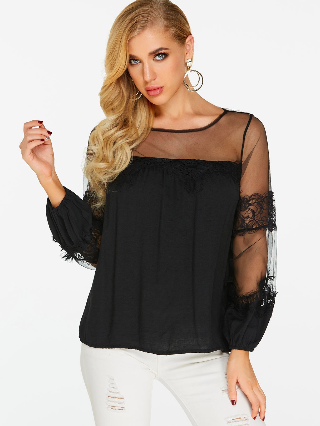 Material:Polyester,OtherNeckline:Round NeckSeason:Spring,SummerSleeves:Long SleevesStyle:Casual StyleDetail:LaceFit:Loose Fit