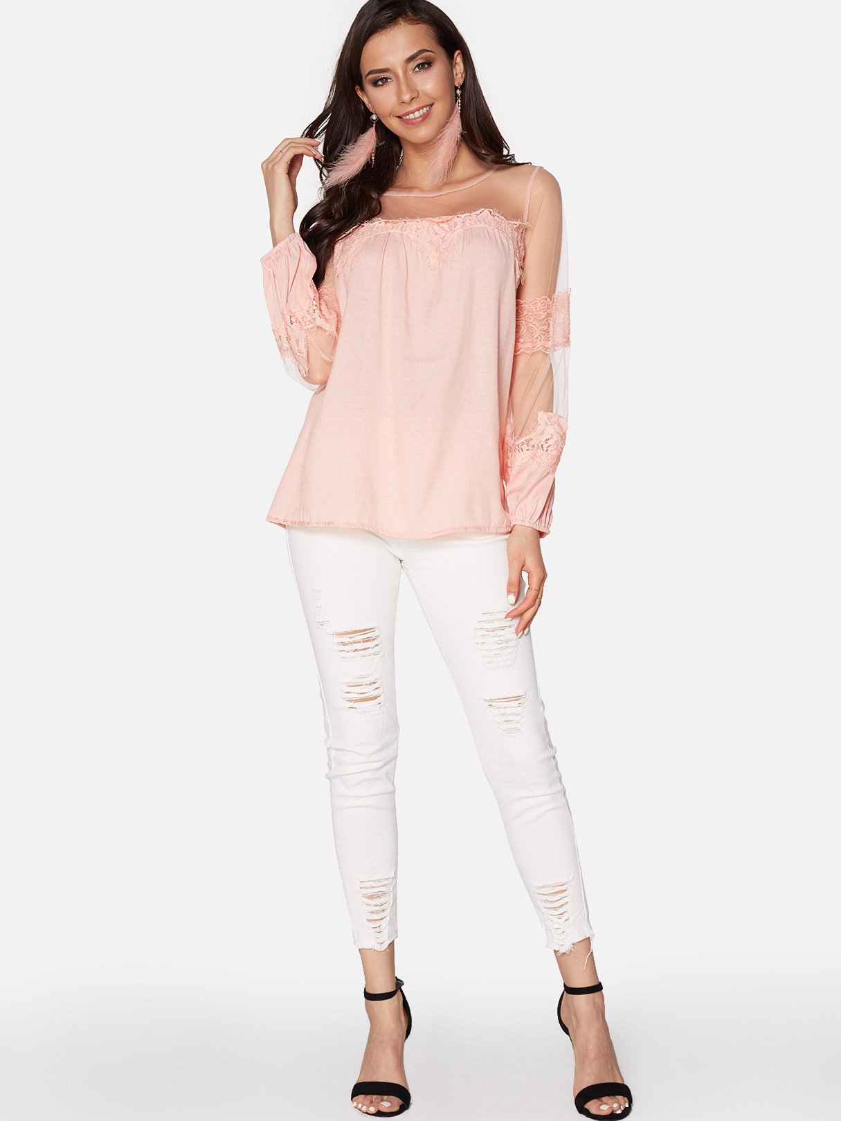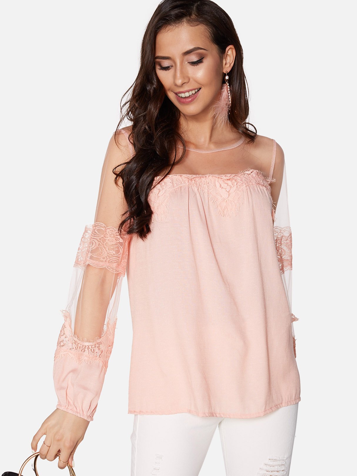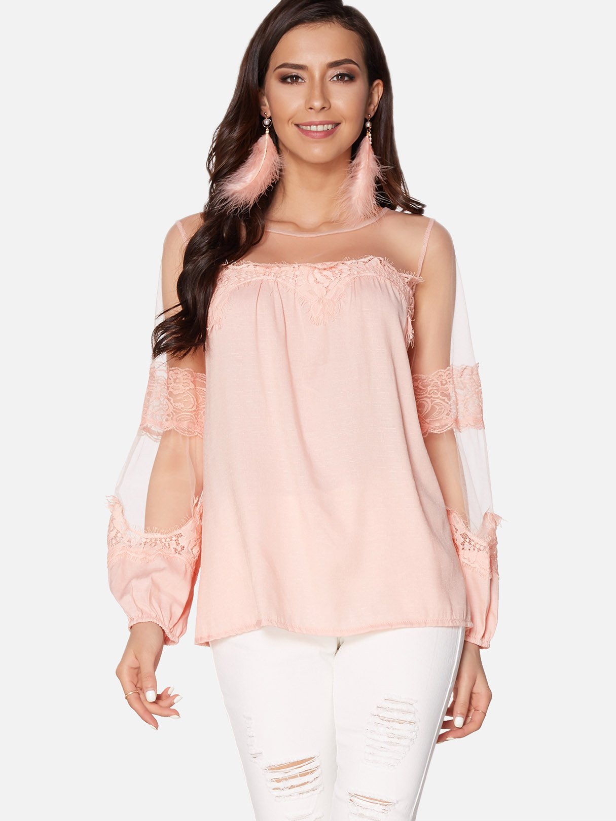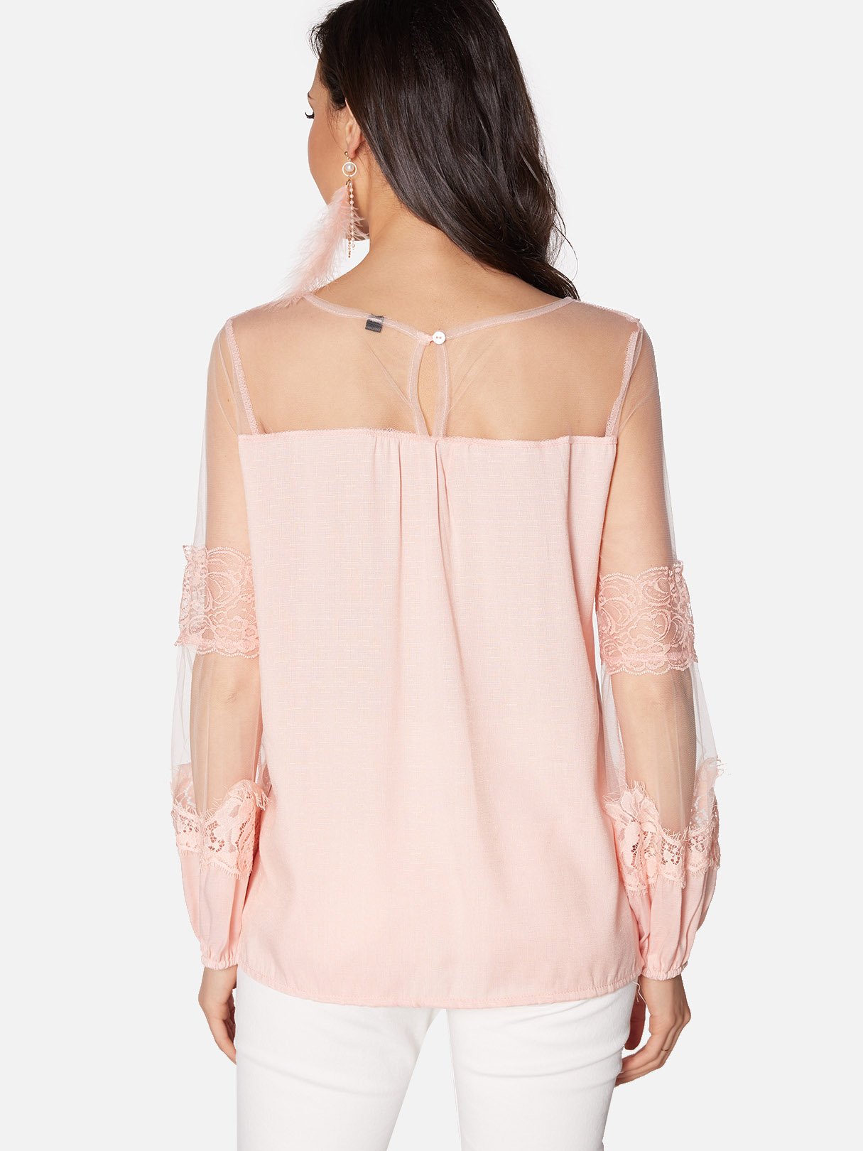 Round Neck Lace Long Sleeve Blouses - Pink / S is backordered and will ship as soon as it is back in stock.