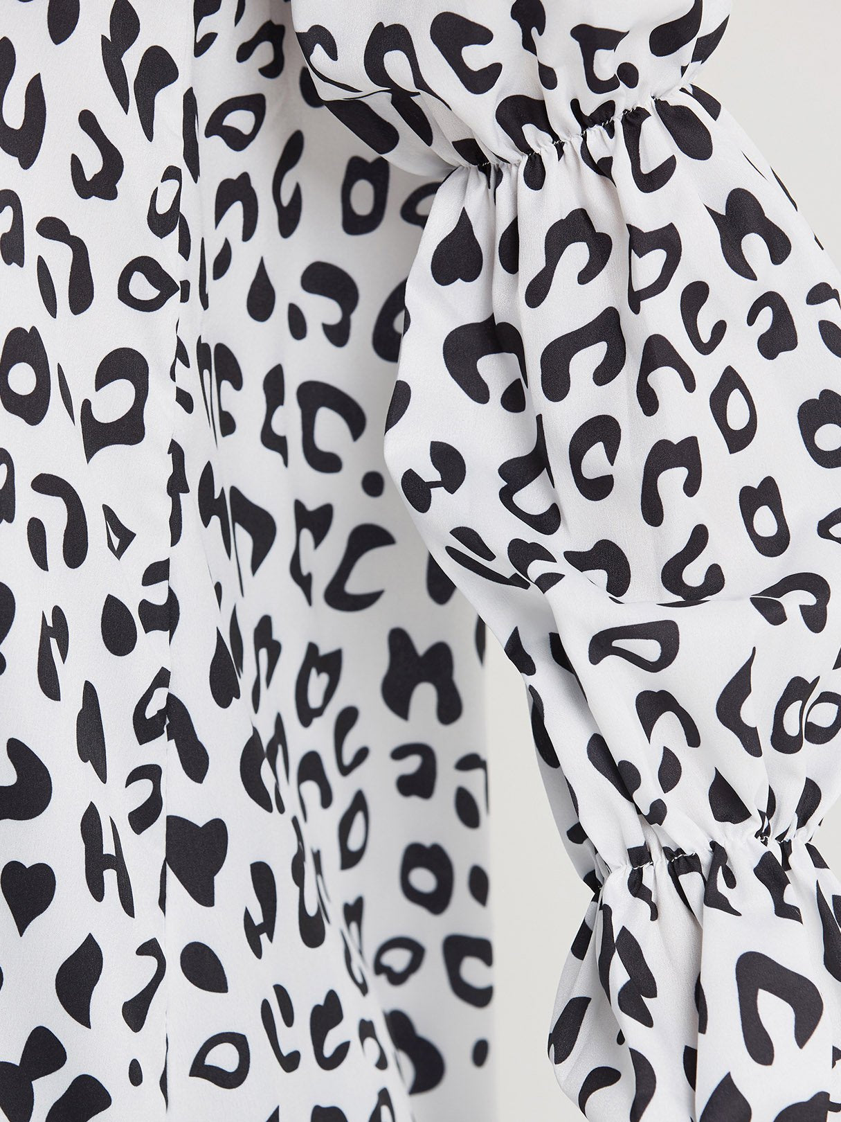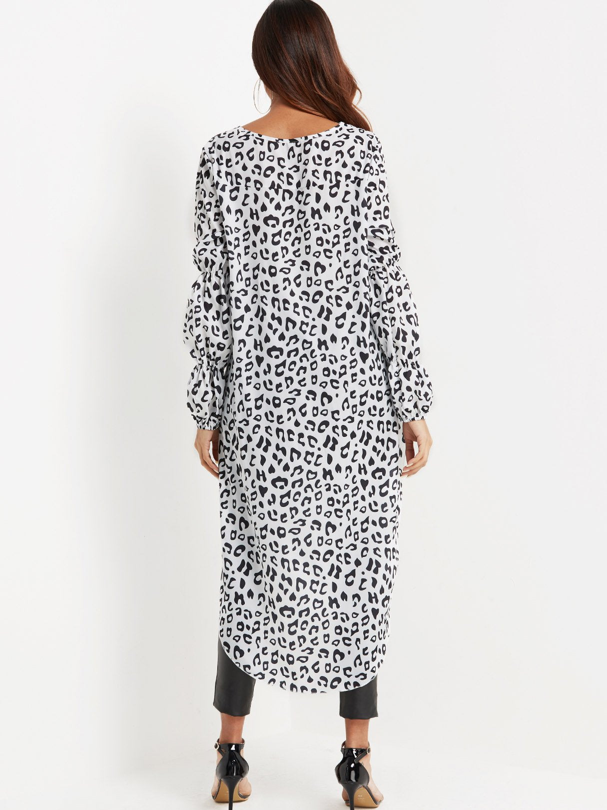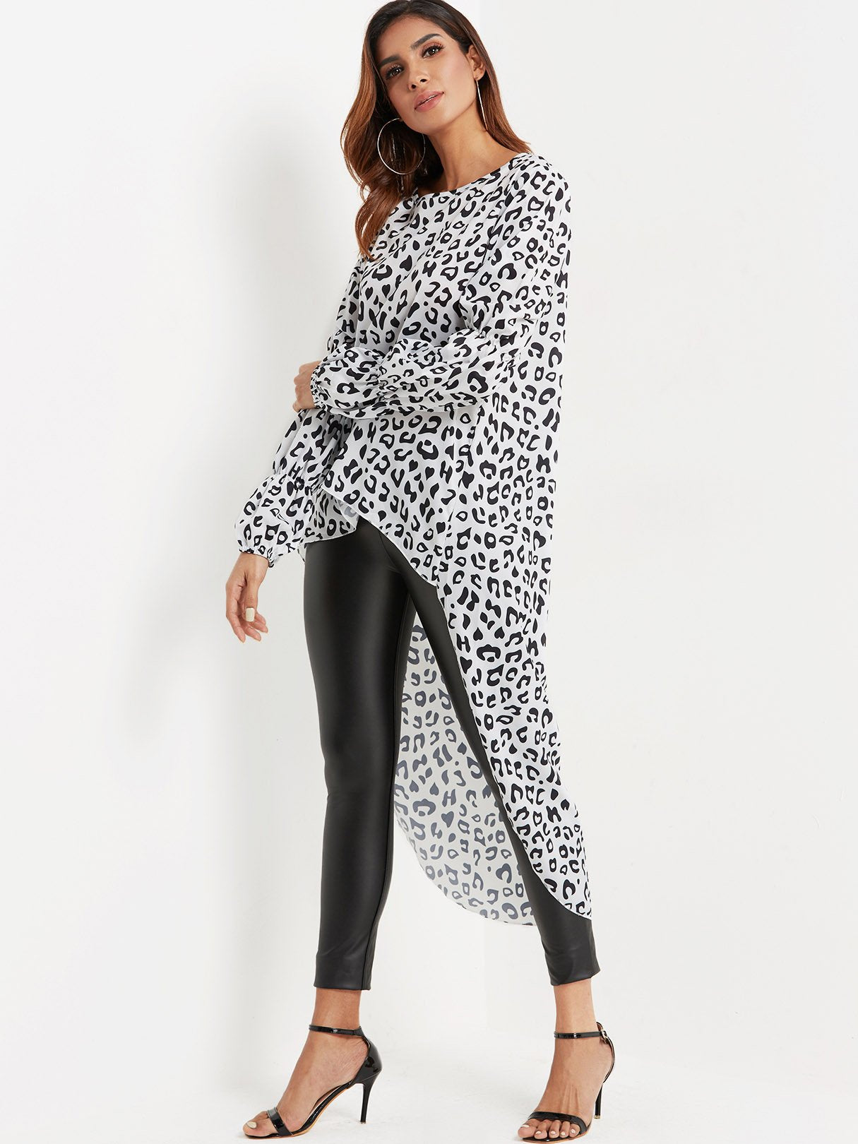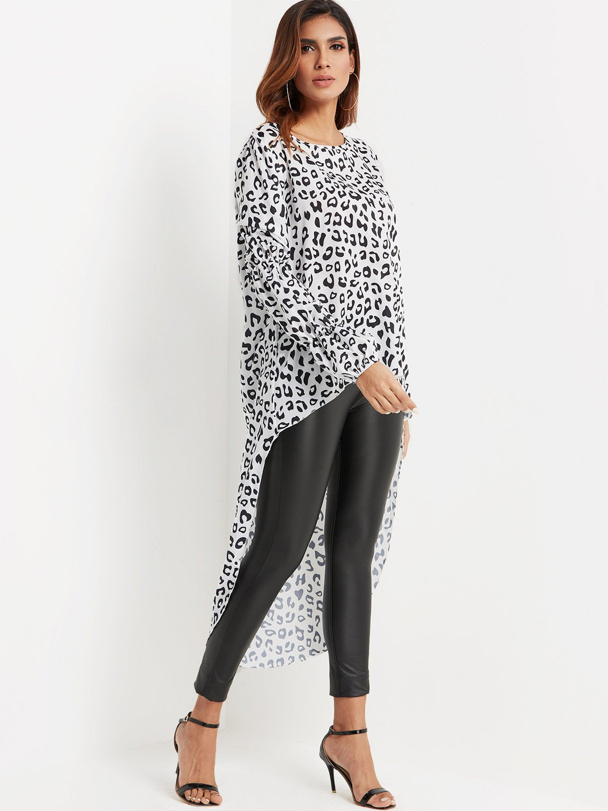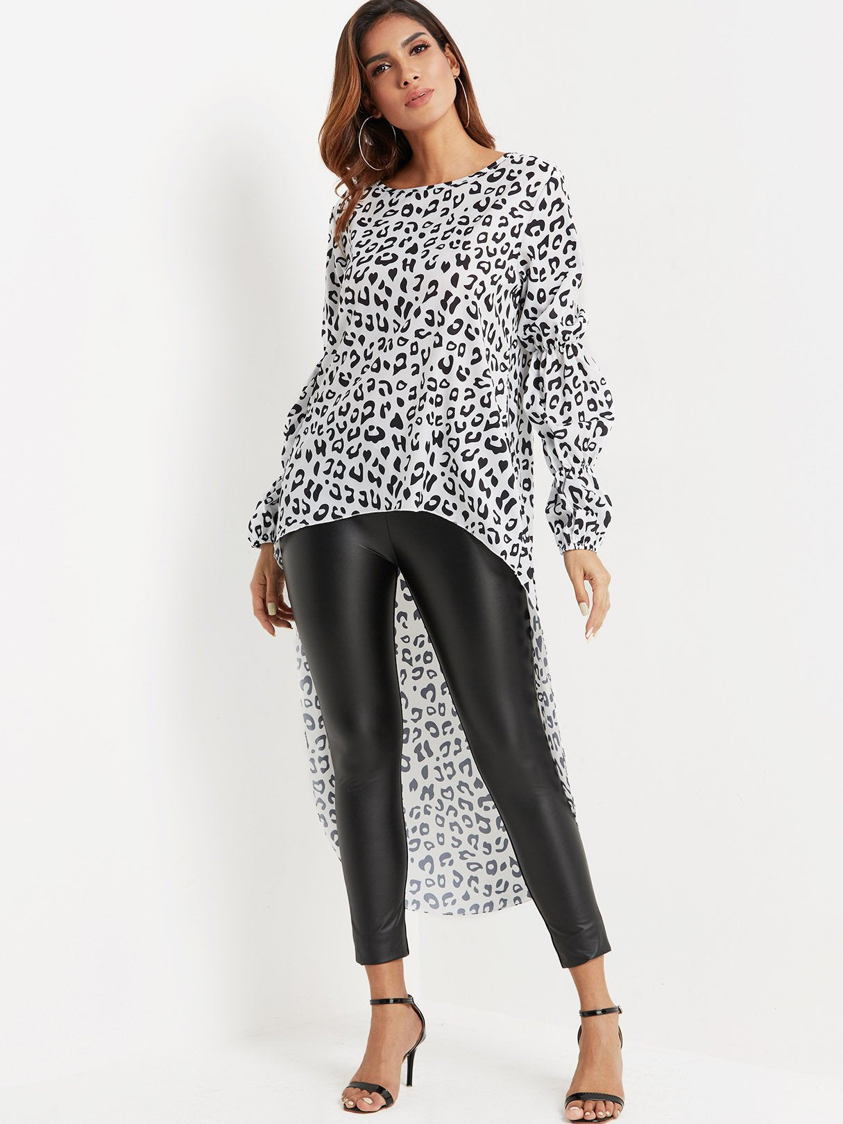 Round Neck Leopard Long Sleeve High-Low Hem Top