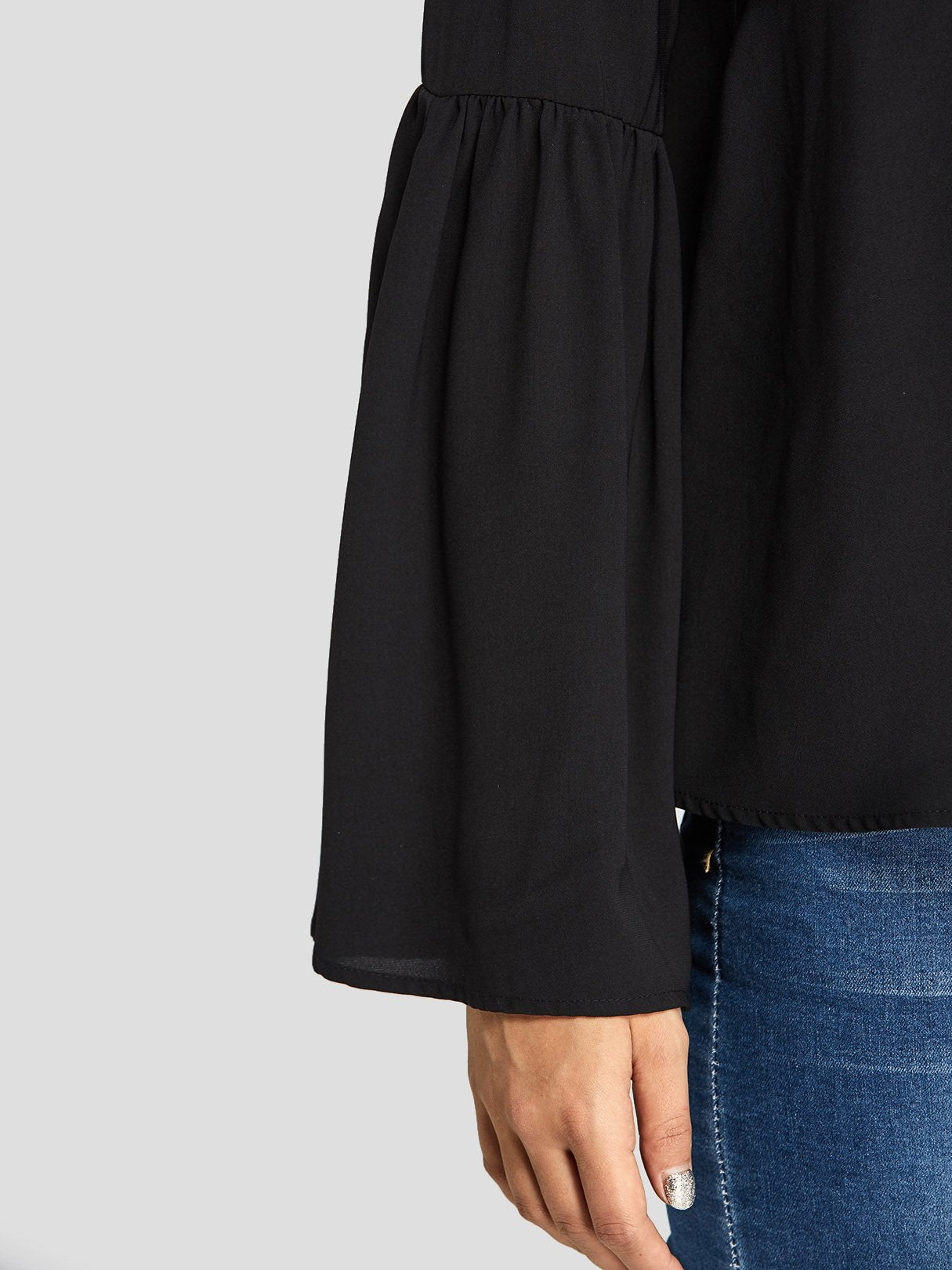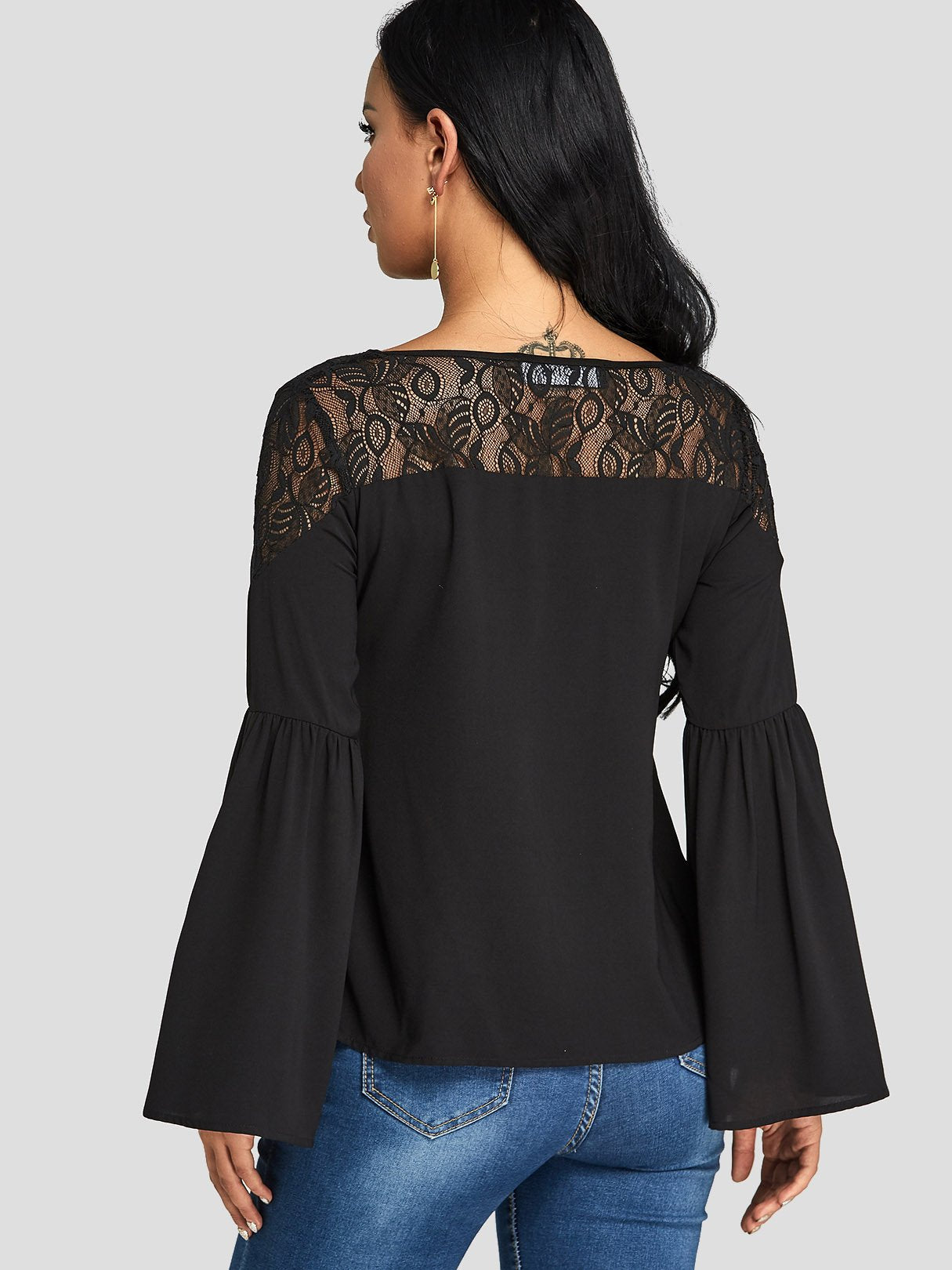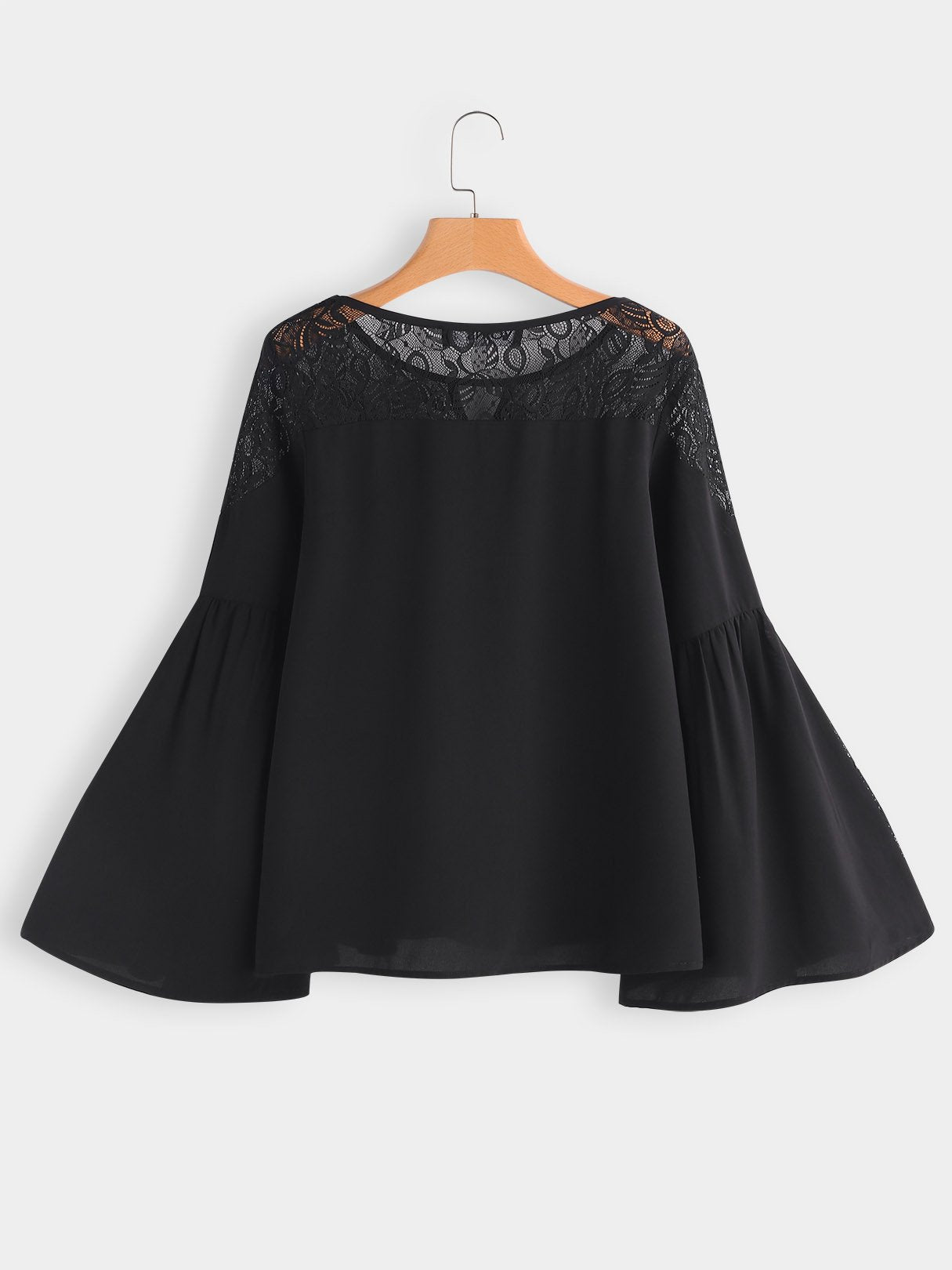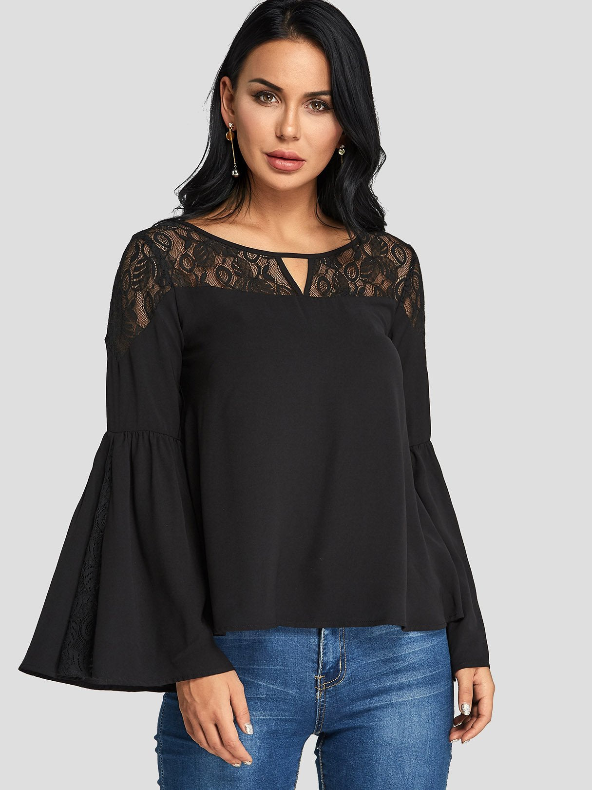 Round Neck Plain Lace Hollow Long Sleeve Black Blouses