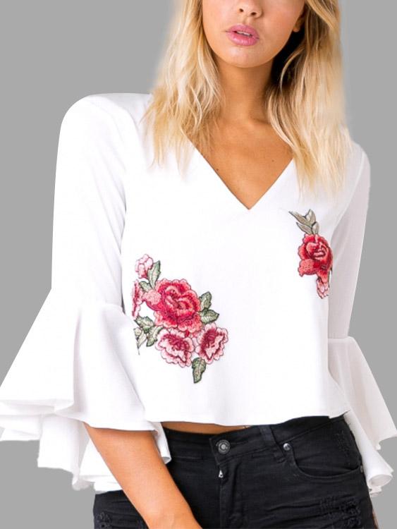 V-Neck Embroidered Cut Out 3/4 Sleeve White Top