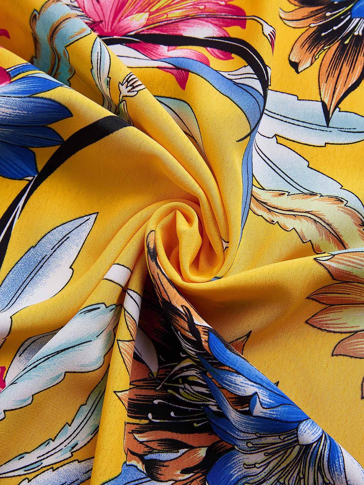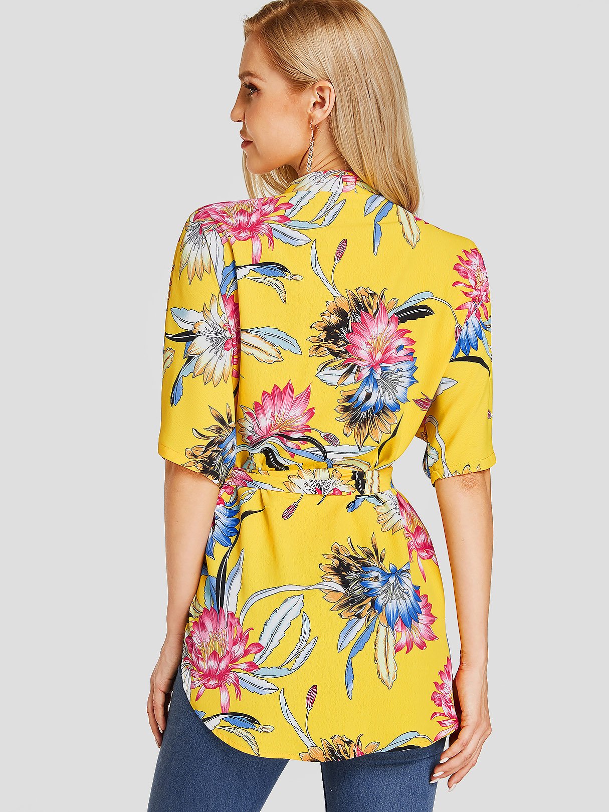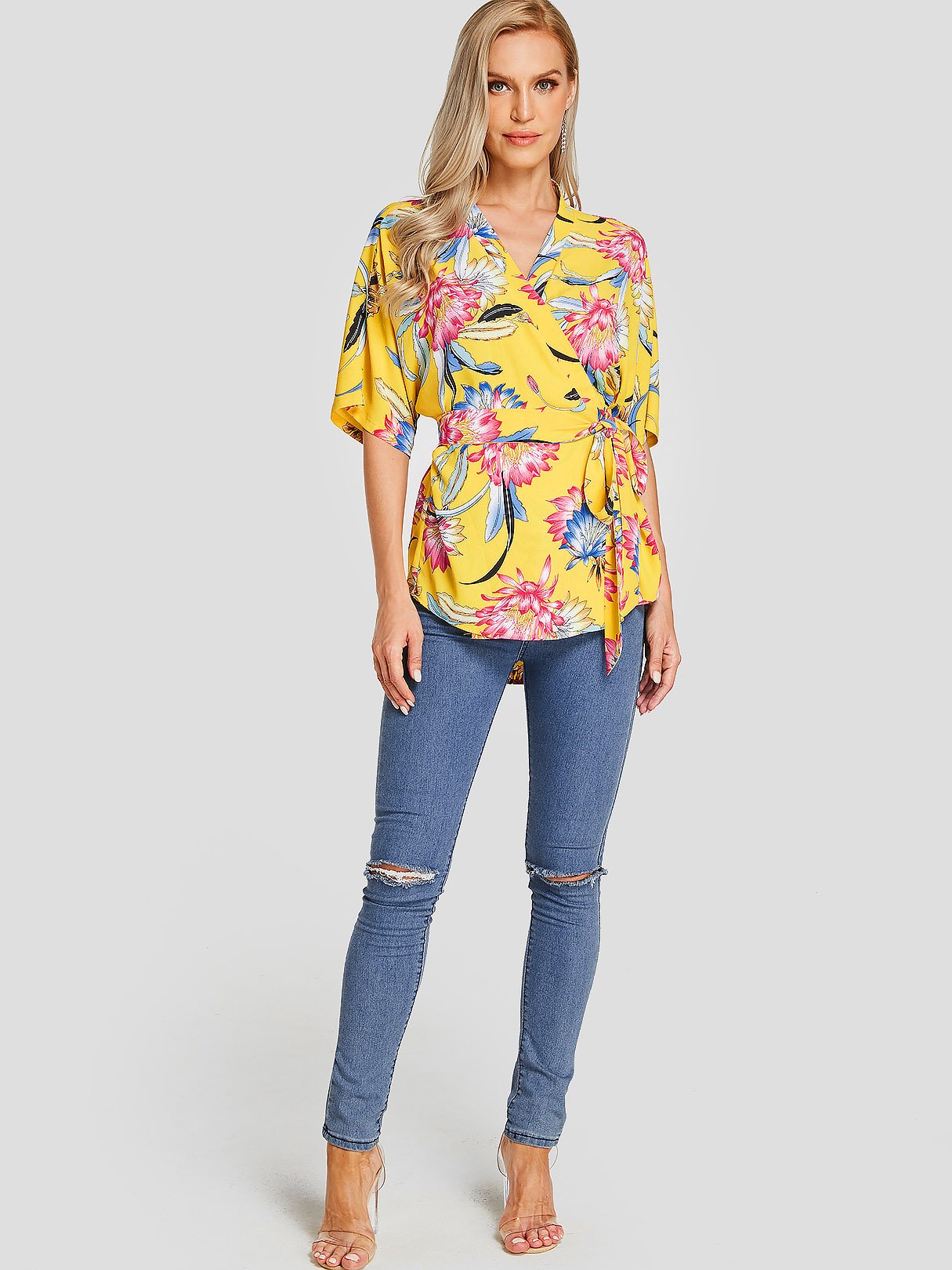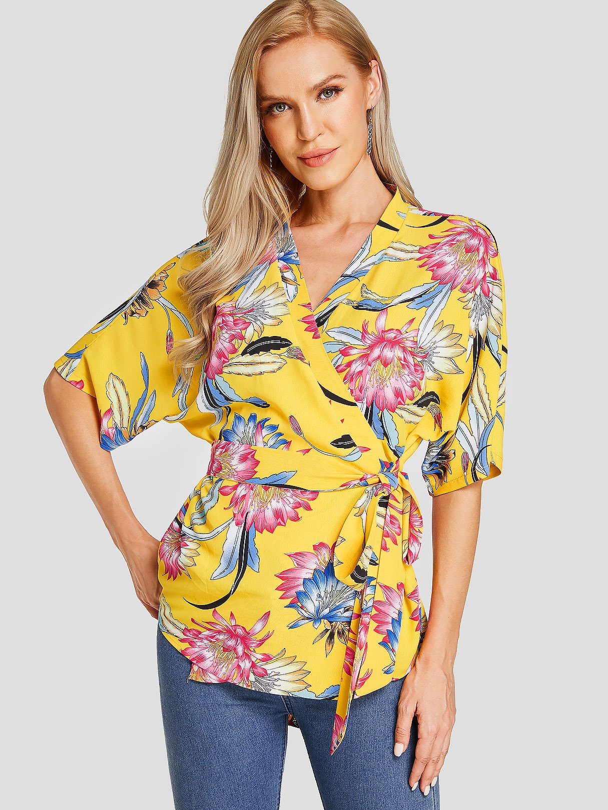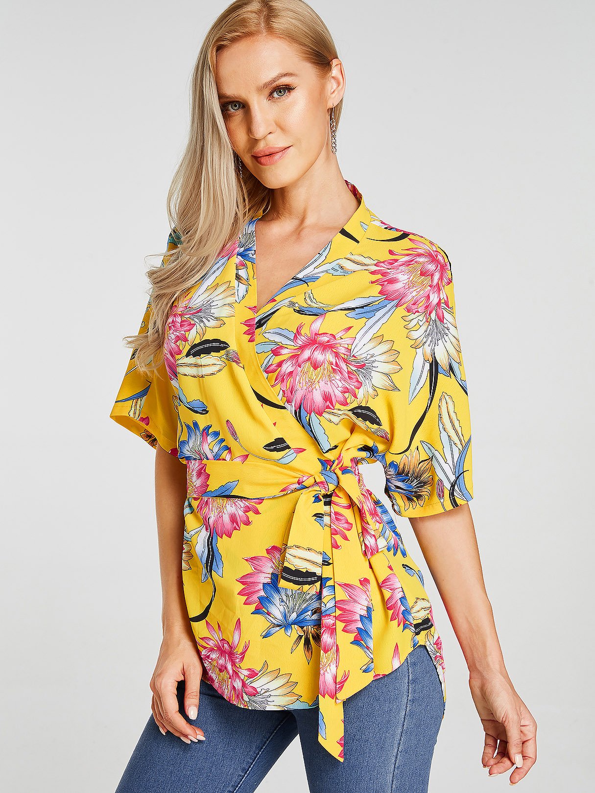 V-Neck Floral Print Self-Tie Half Sleeve Yellow Blouses