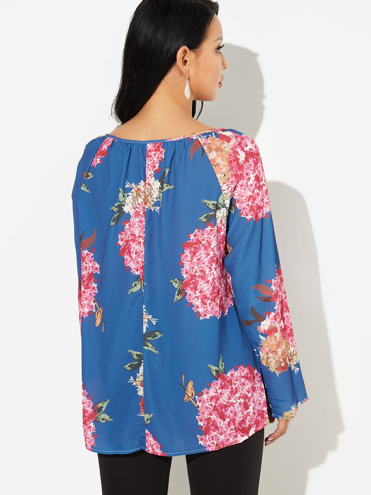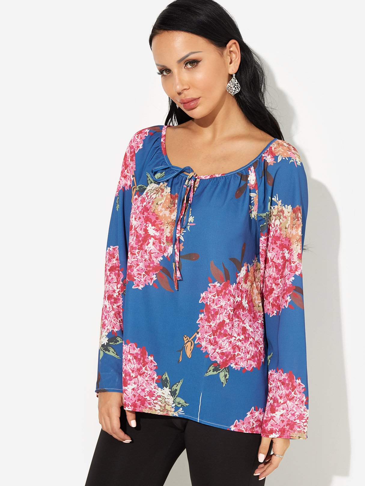 V-Neck Floral Print Self-Tie Long Sleeve Blue Blouses