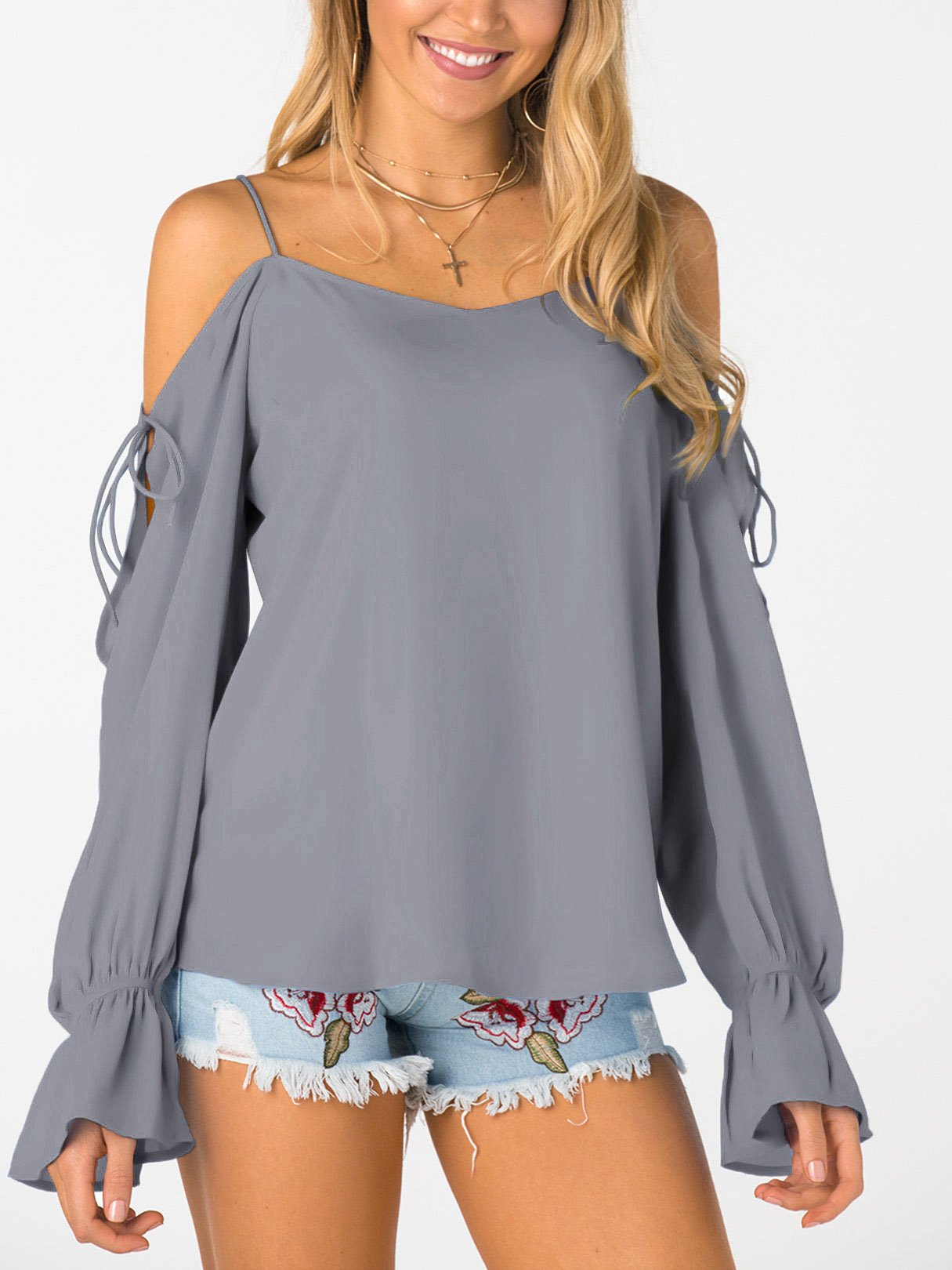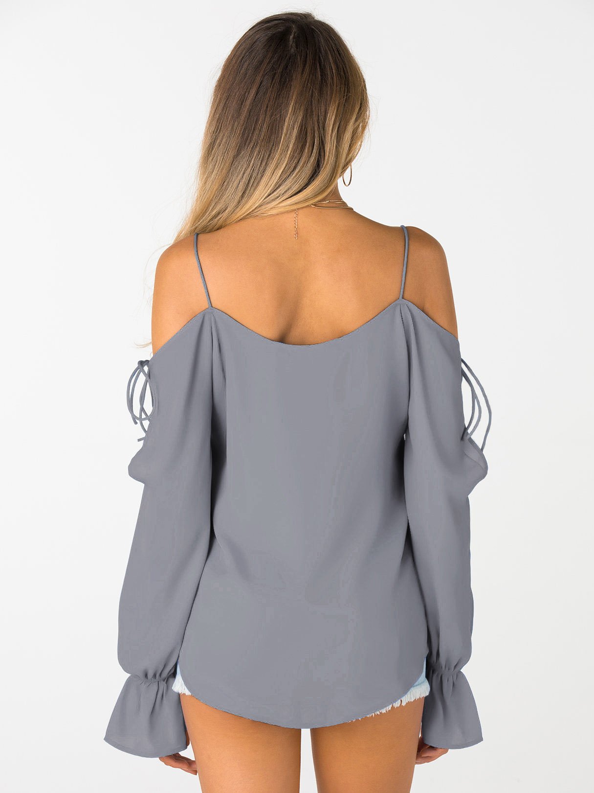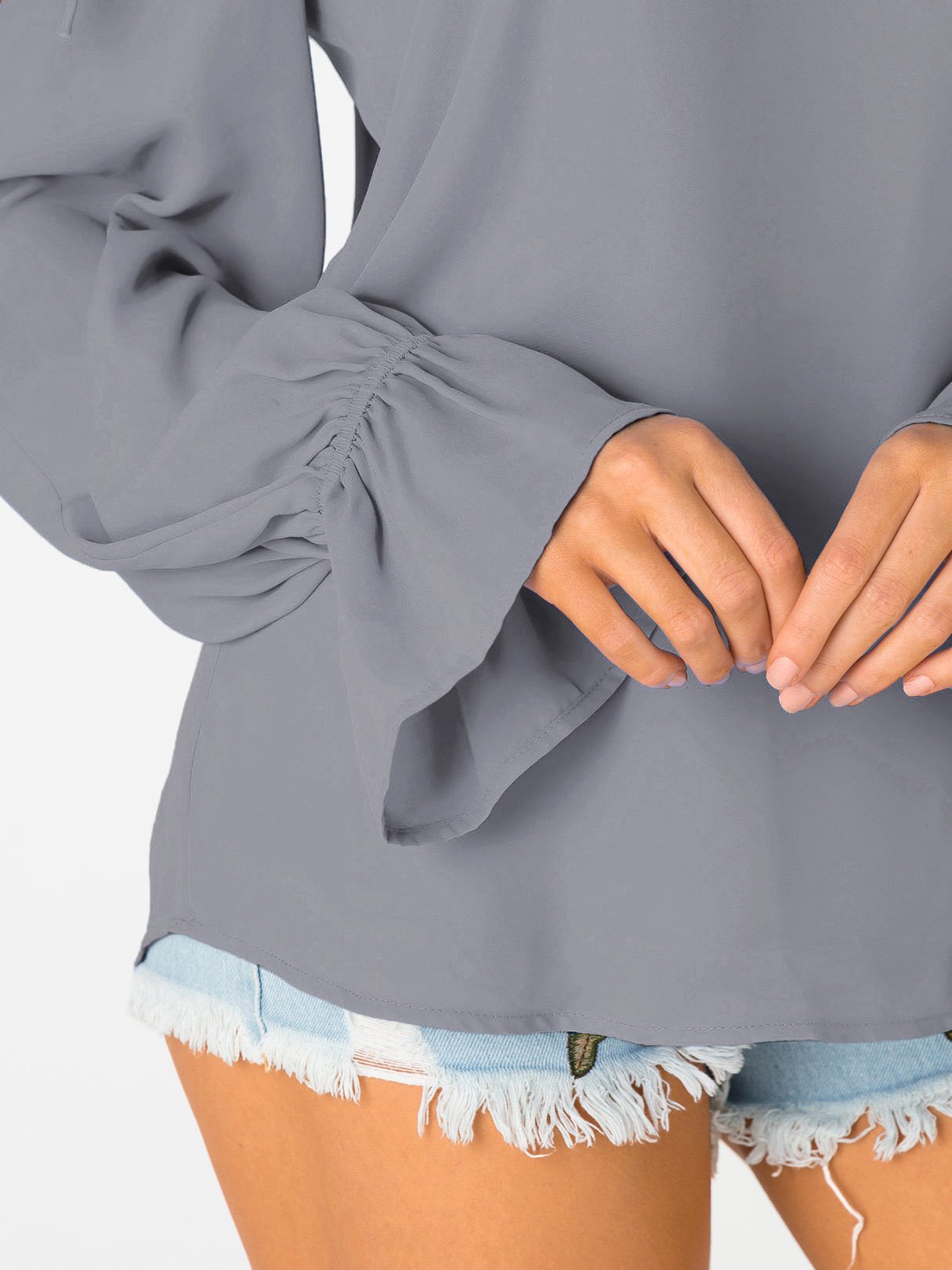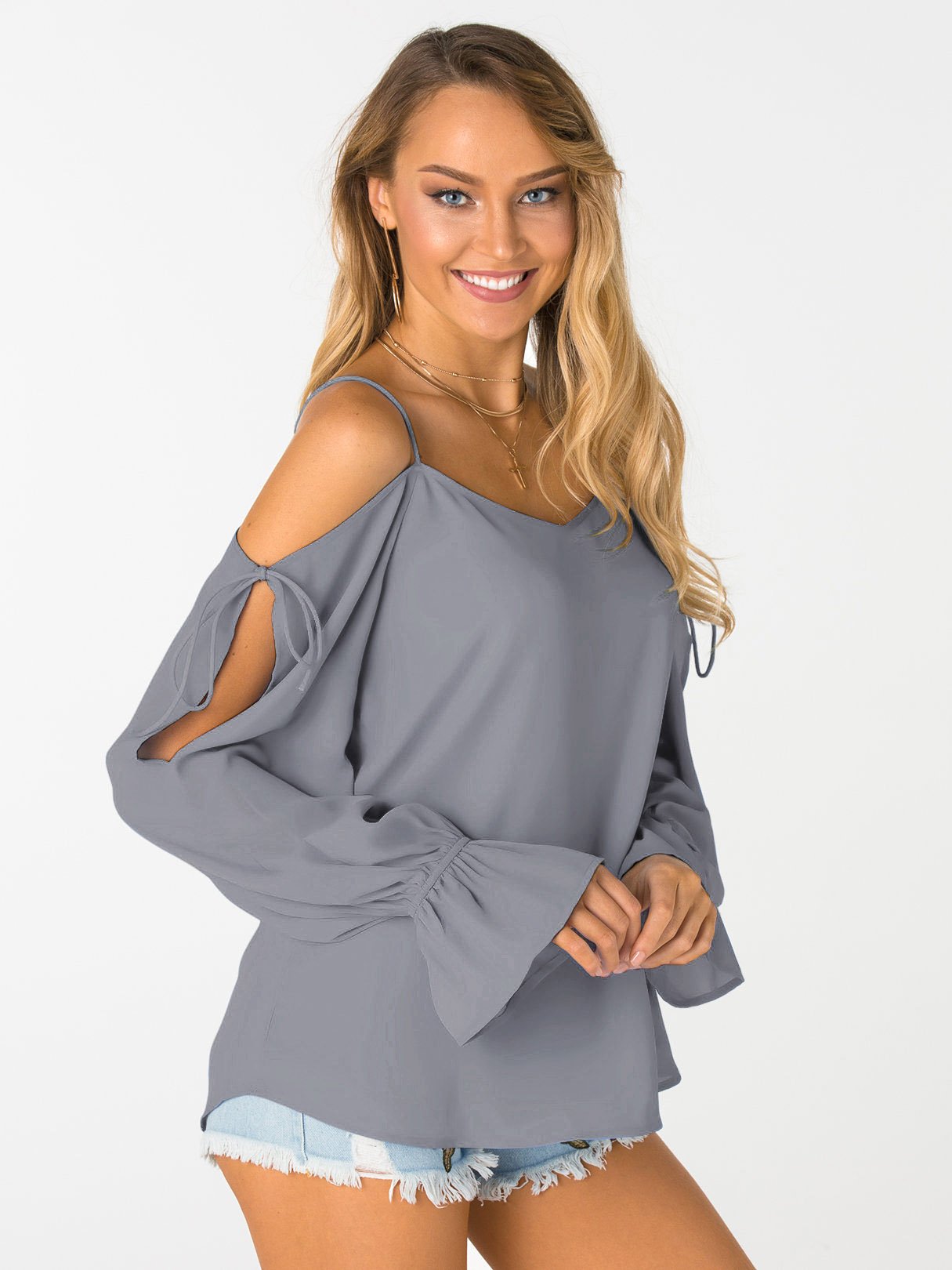 V-Neck Plain Lace-Up Long Sleeve Grey Blouses