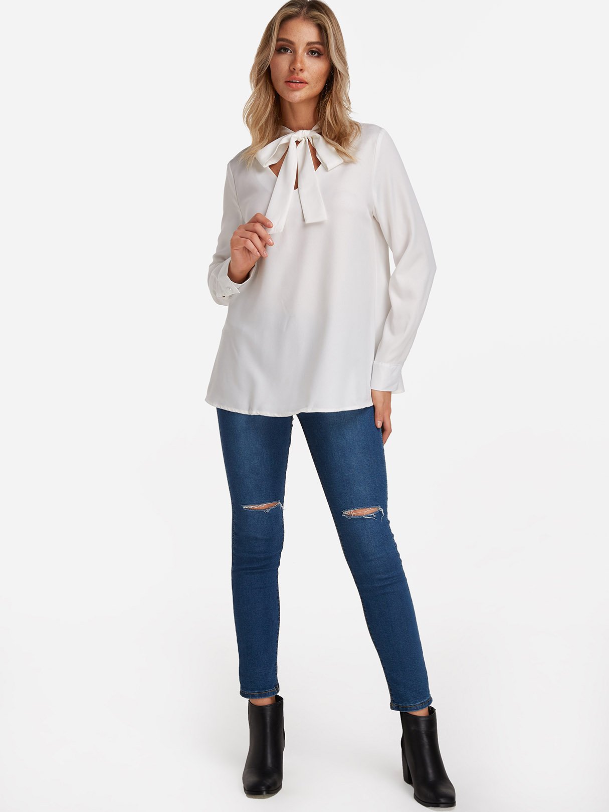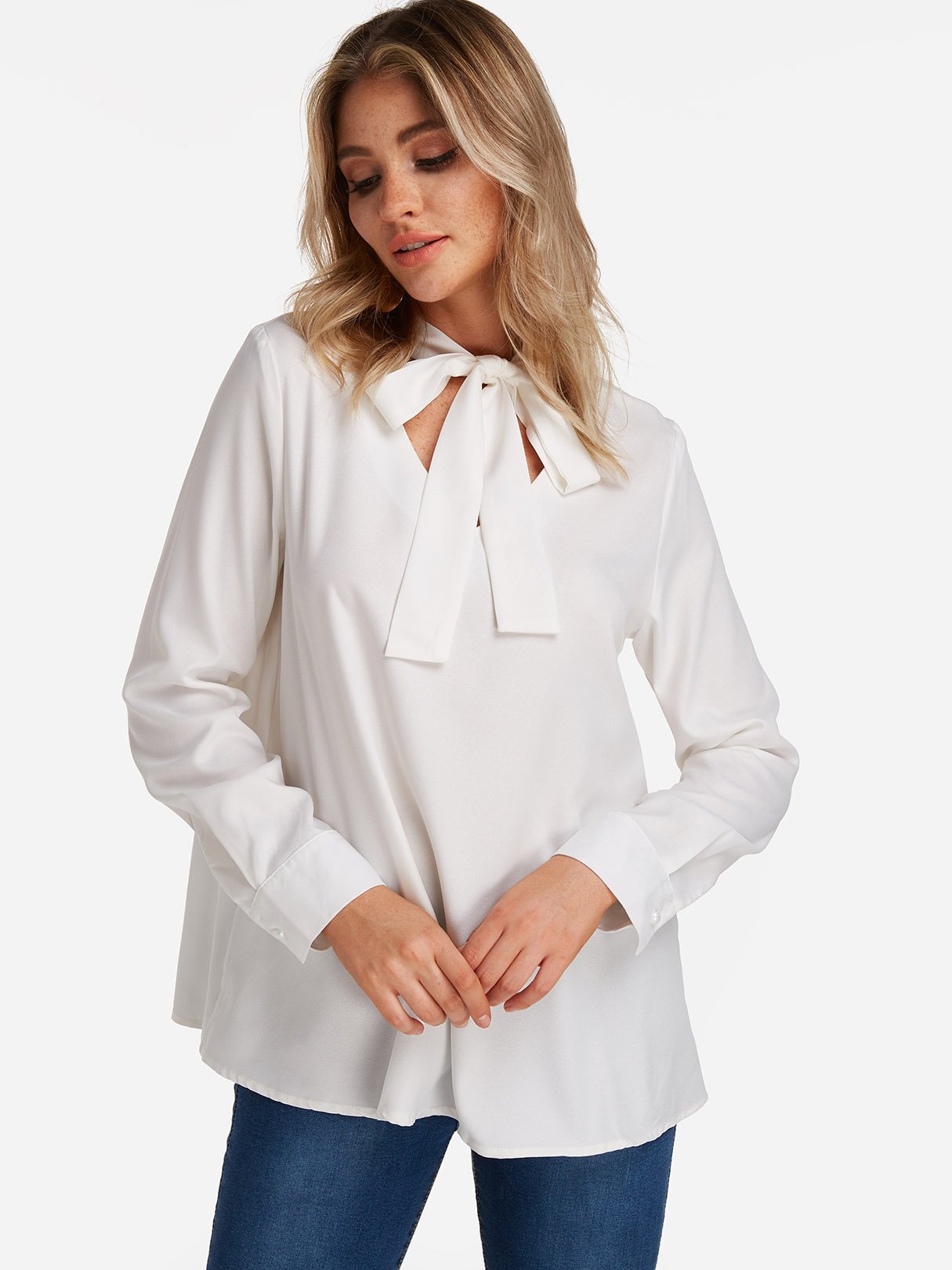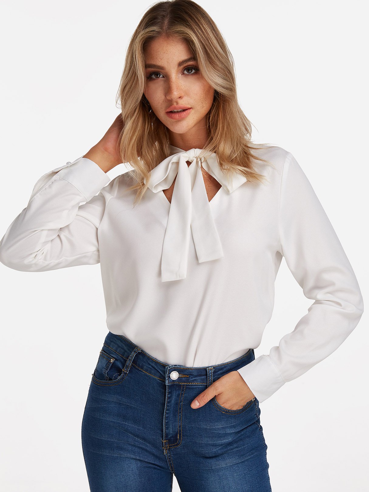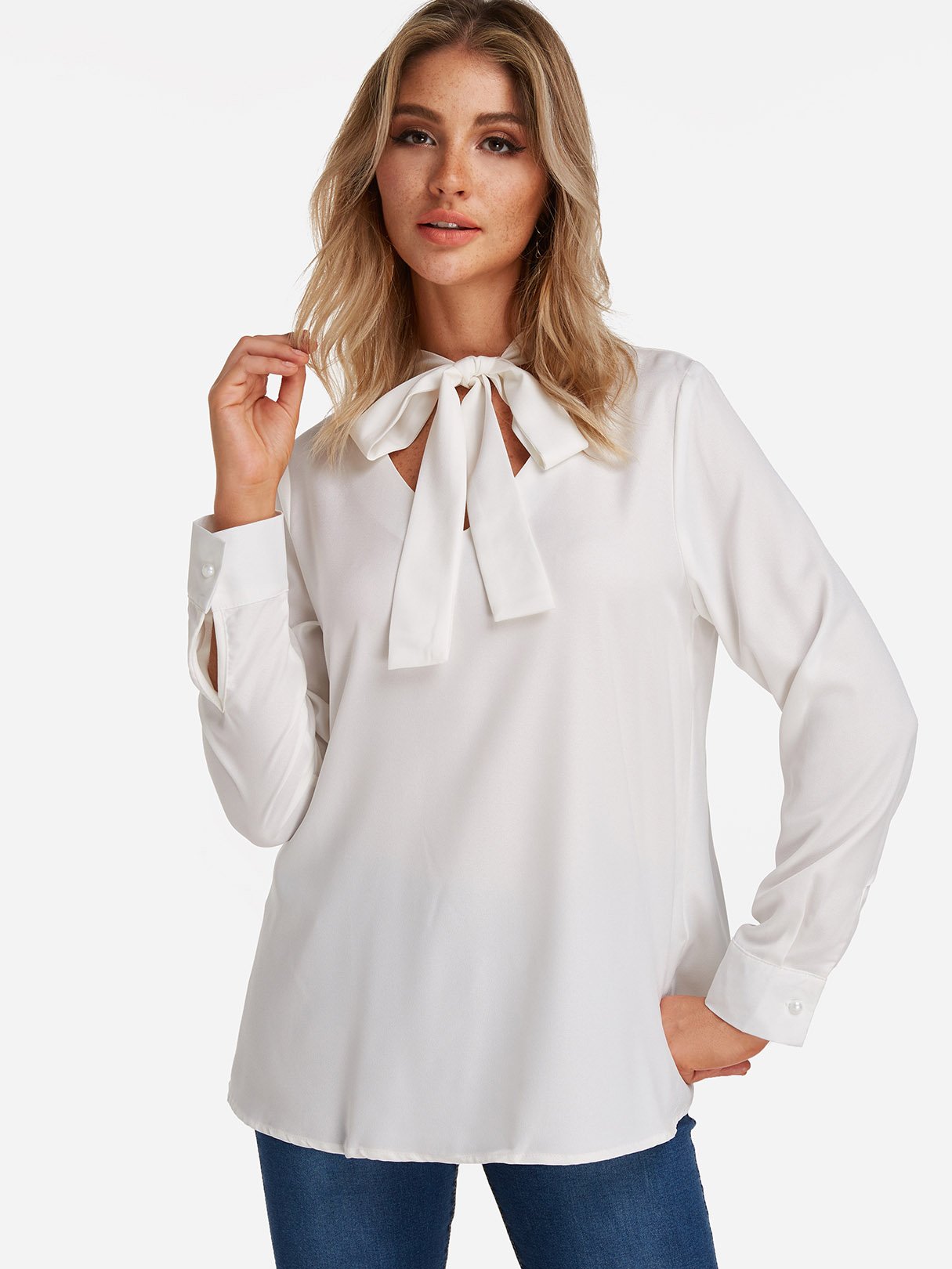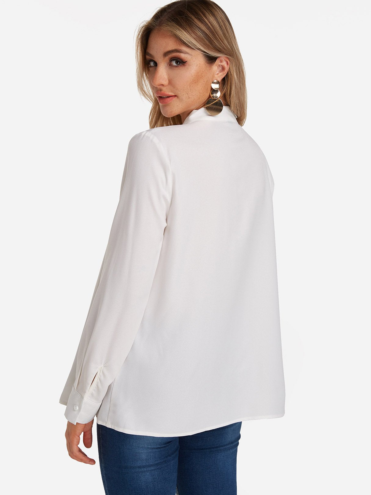 V-Neck Plain Lace-Up Long Sleeve White Blouses