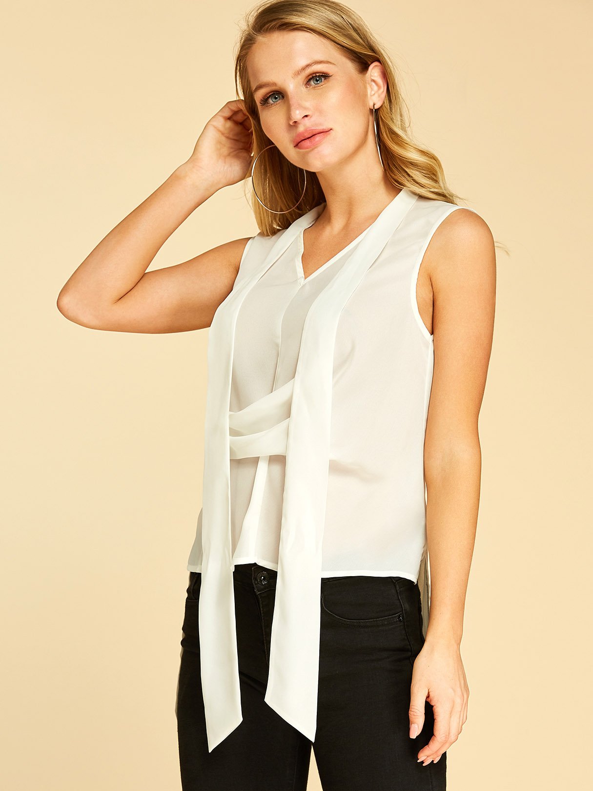 V-Neck Sleeveless White Blouses - White / S is backordered and will ship as soon as it is back in stock.