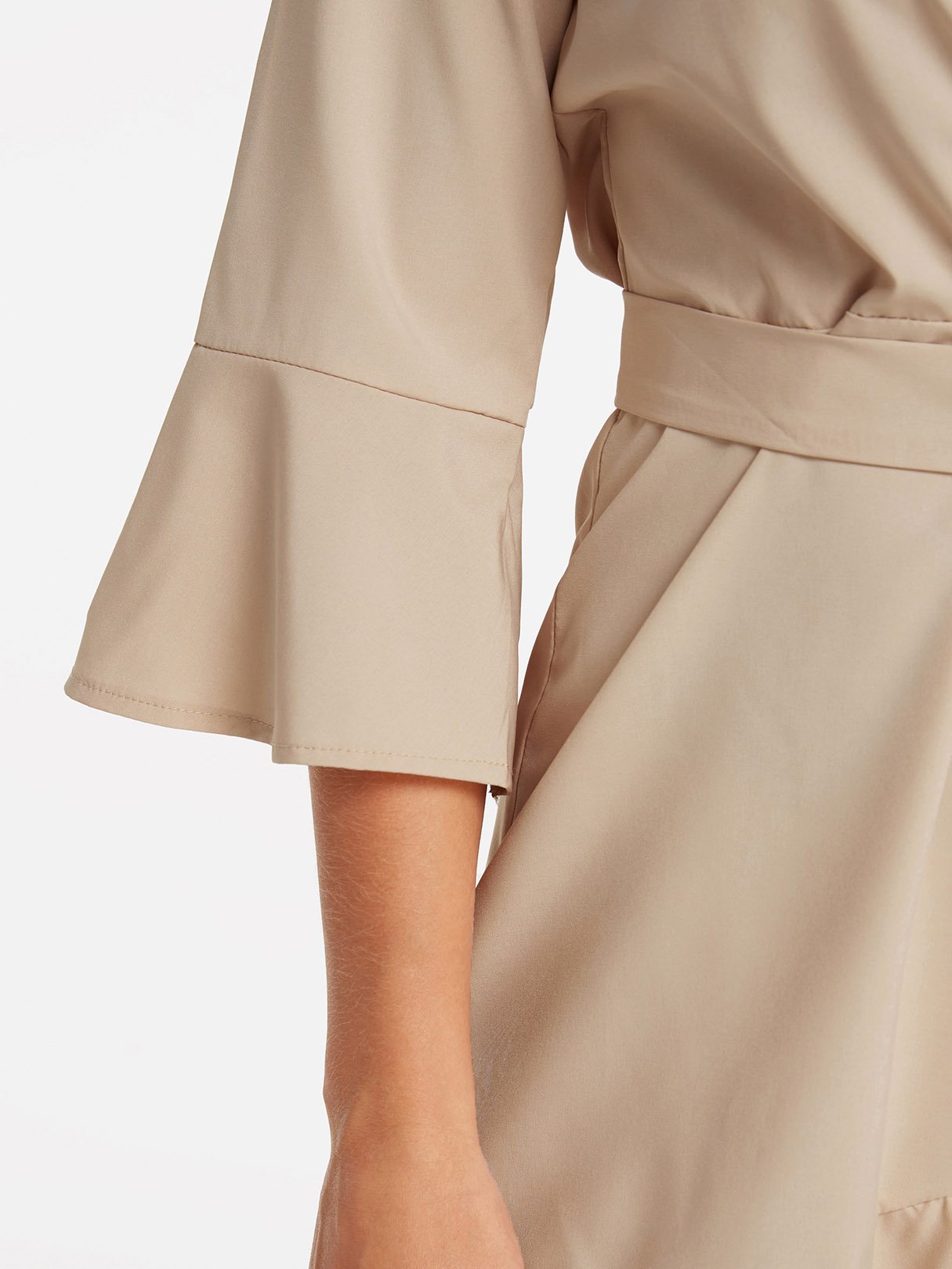 Apricot Deep V Neck 3/4 Sleeve Length Plain Crossed Front Self-Tie Flounced Hem Dresses