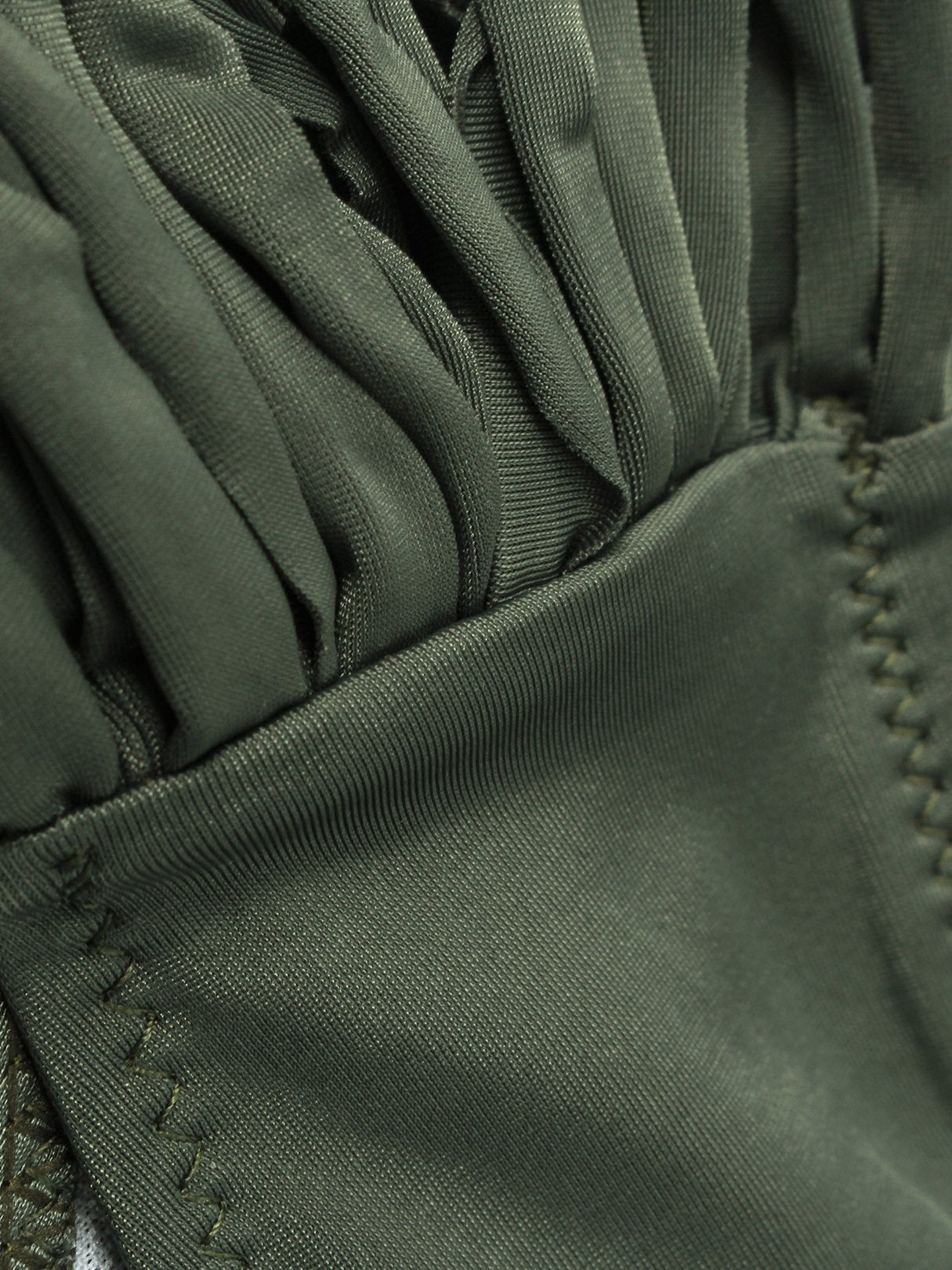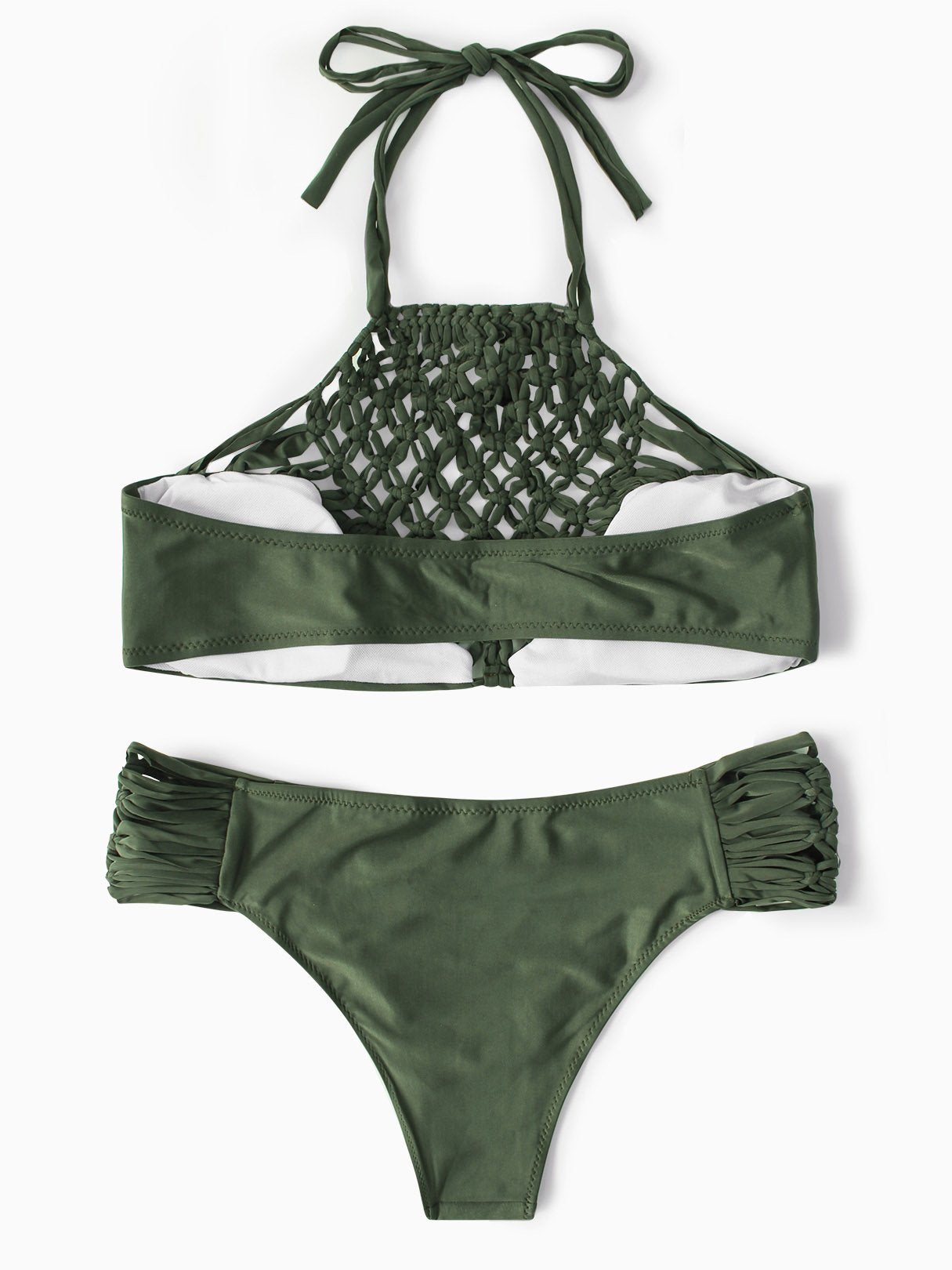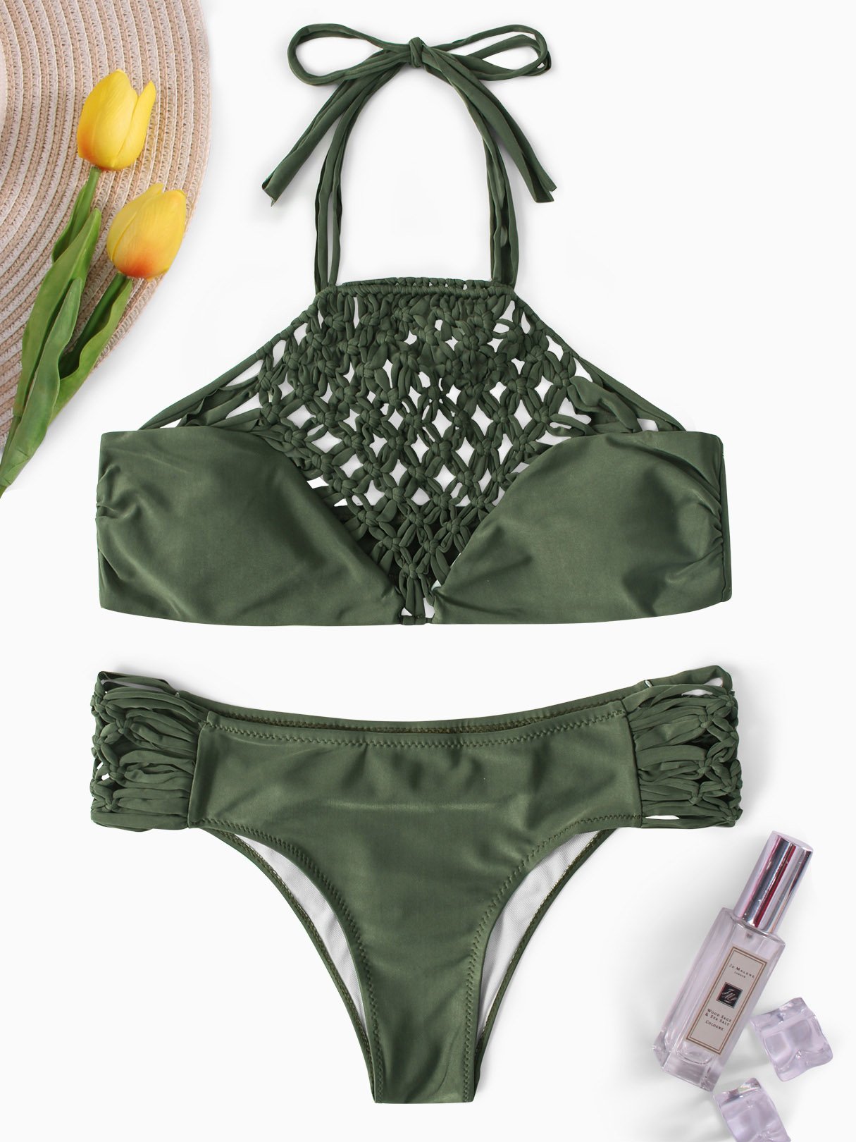 Army Green Halter Sleeveless Grid Lace-Up Tie-Up Bikinis