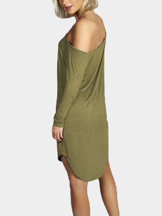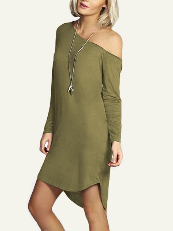 Army Green One Shoulder Long Sleeve Plain Curved Hem Mini Dress