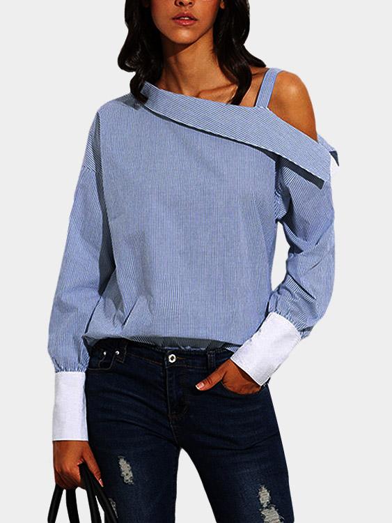 Asymmetrical One Shoulder Stripe Long Sleeve Blouses