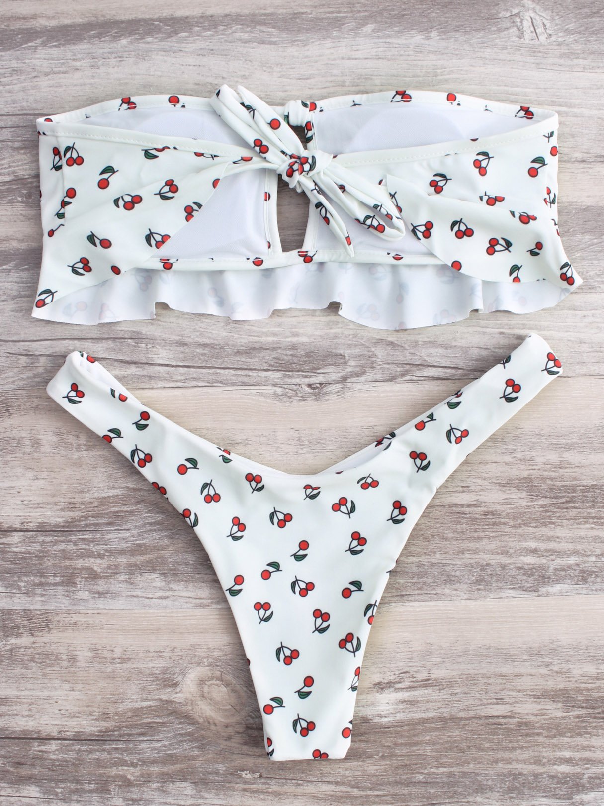 Bateau Floral Print Backless Hollow Self-Tie Sleeveless White Bikini Set