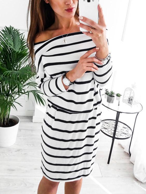 Material:Cotton,PolyesterNeckline:Asymmetrical,Off The ShoulderSeason:Spring,Summer,Autumn,WinterSleeves:Long SleevesPattern:StripeStyle:Casual Style,Basic StyleDetail:Side PocketsLength:MidiFit:Regular Fit