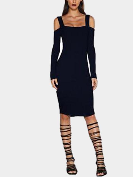 Black Bateau Long Sleeve Plain Backless Cut Out Midi Dress