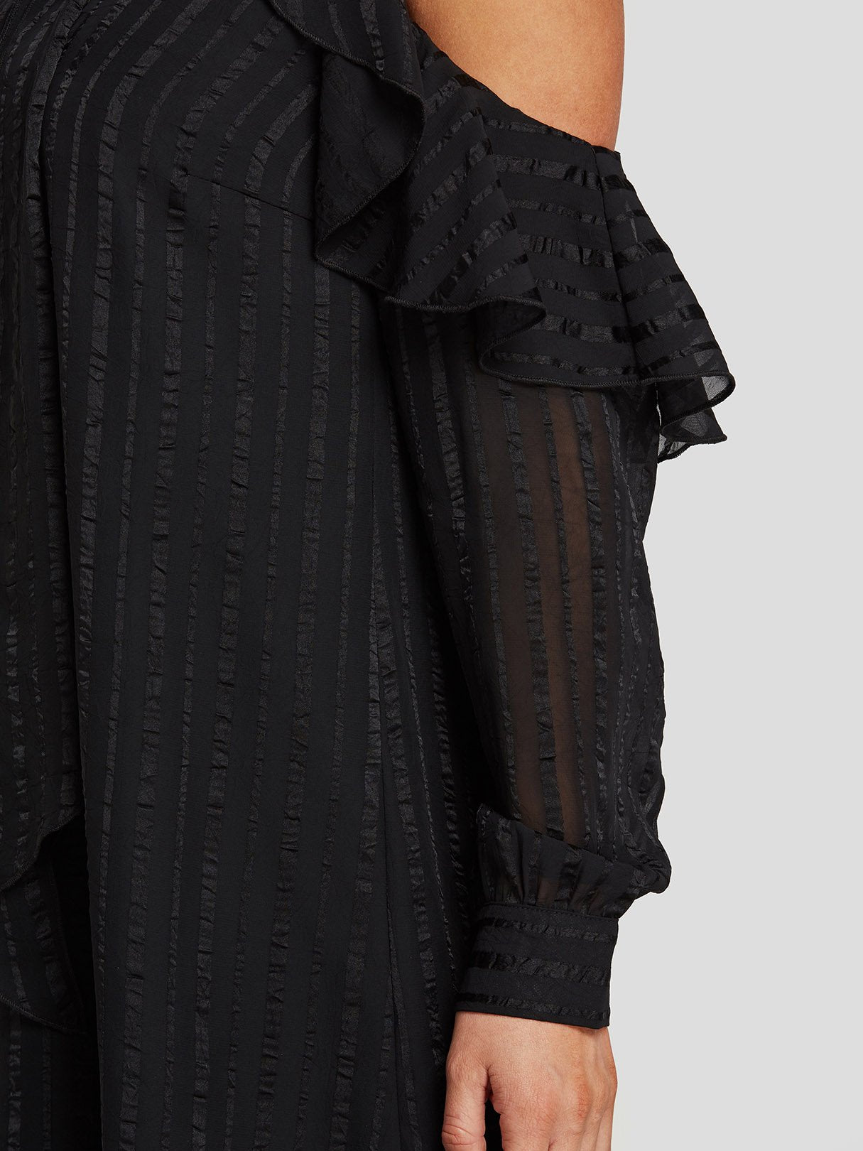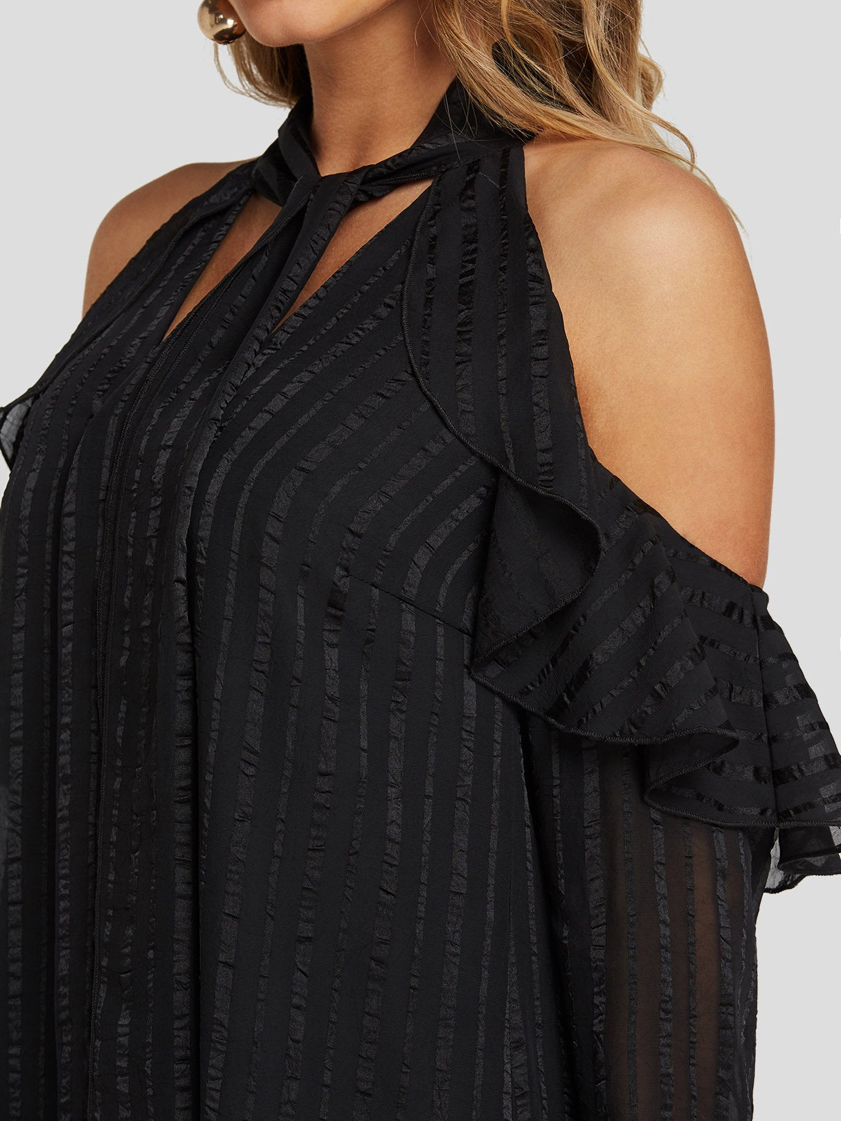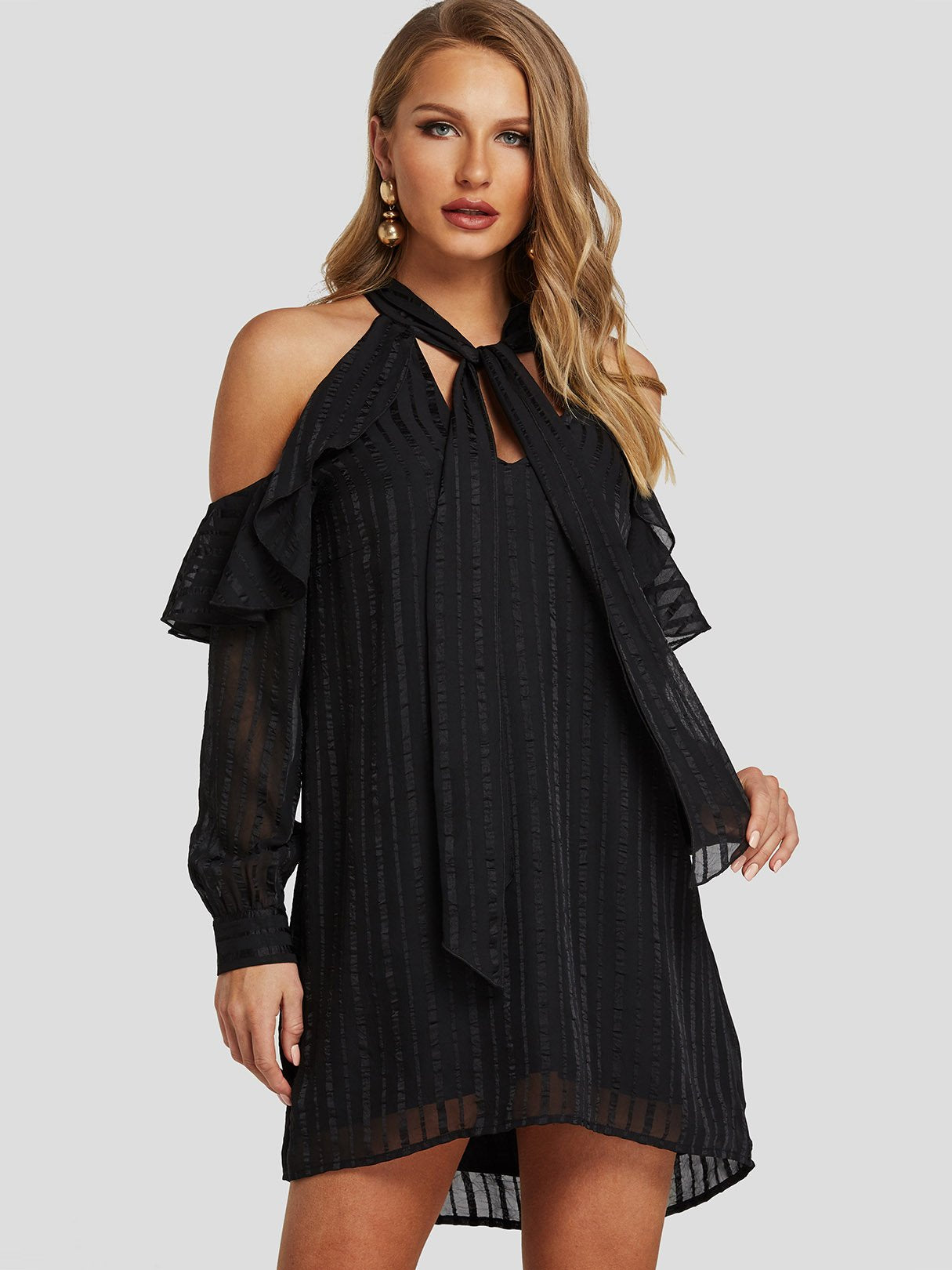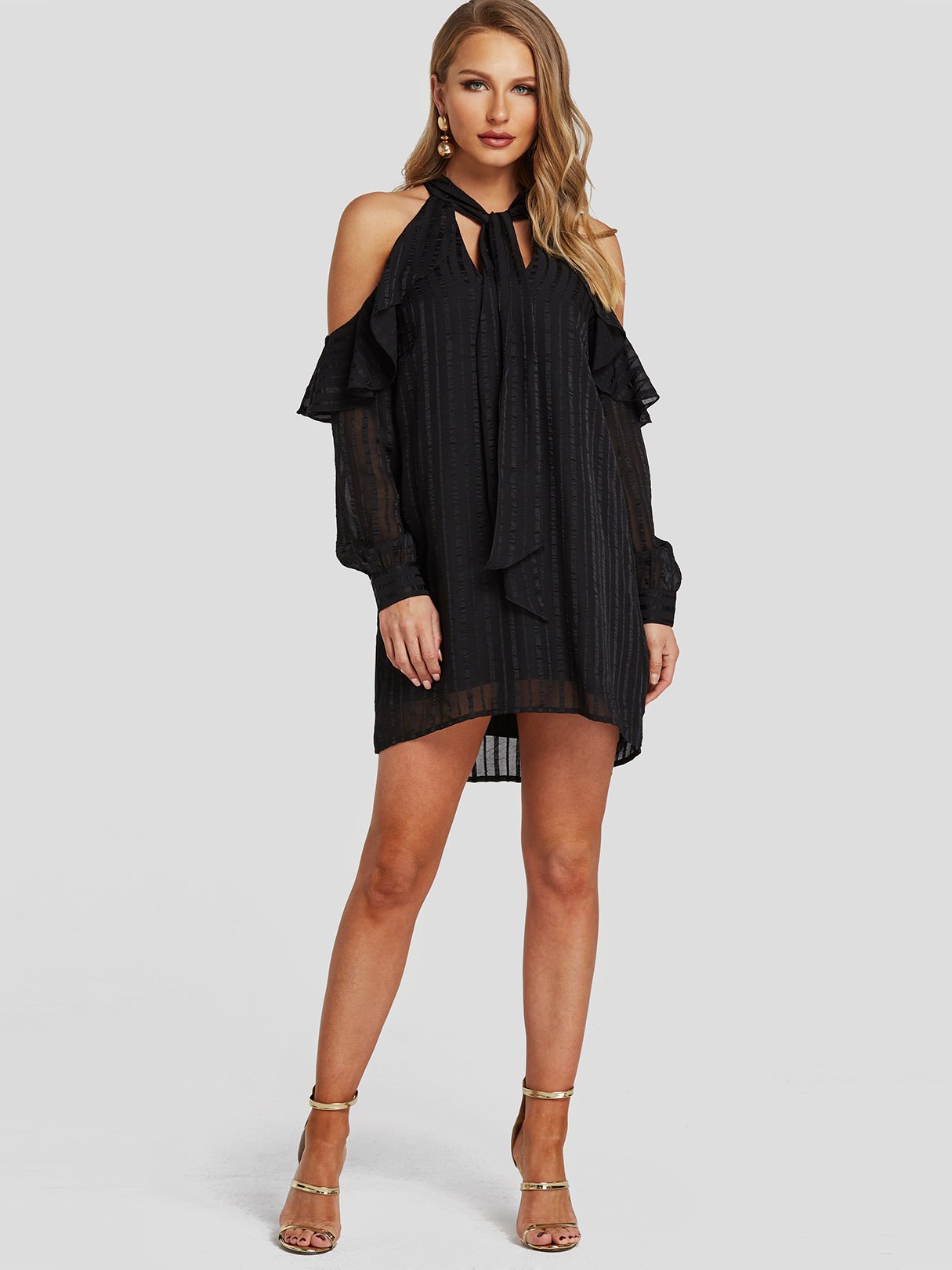 Black Cold Shoulder Long Sleeve Tiered Self-Tie Mini Dresses