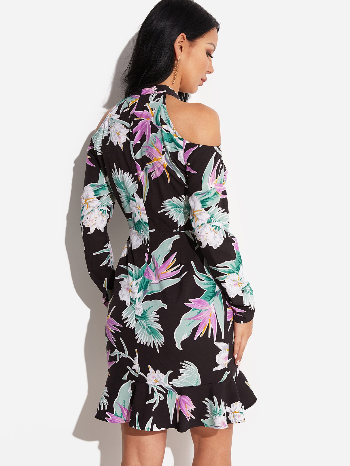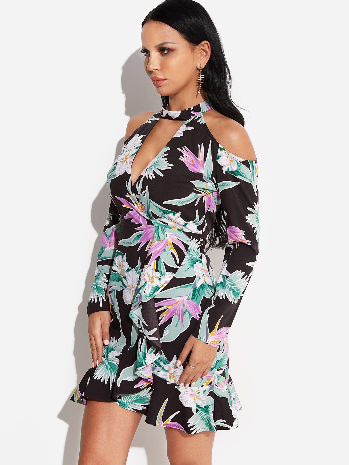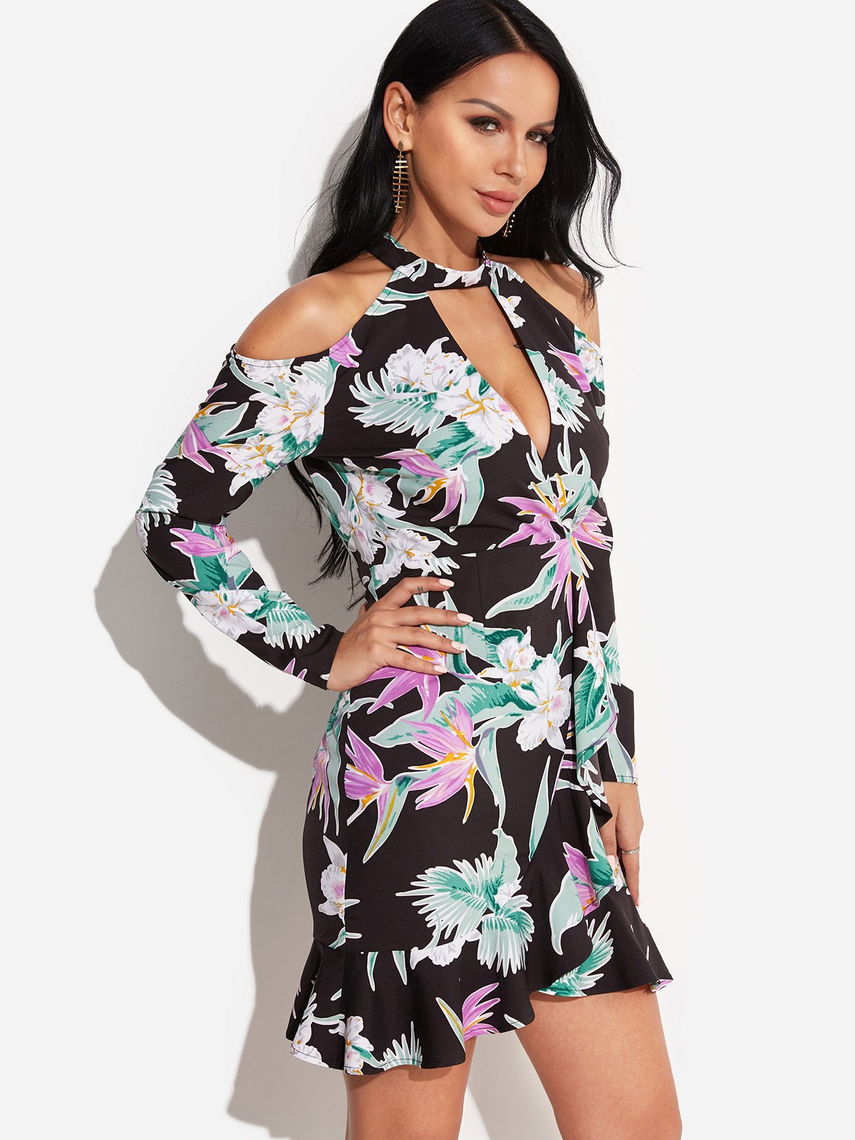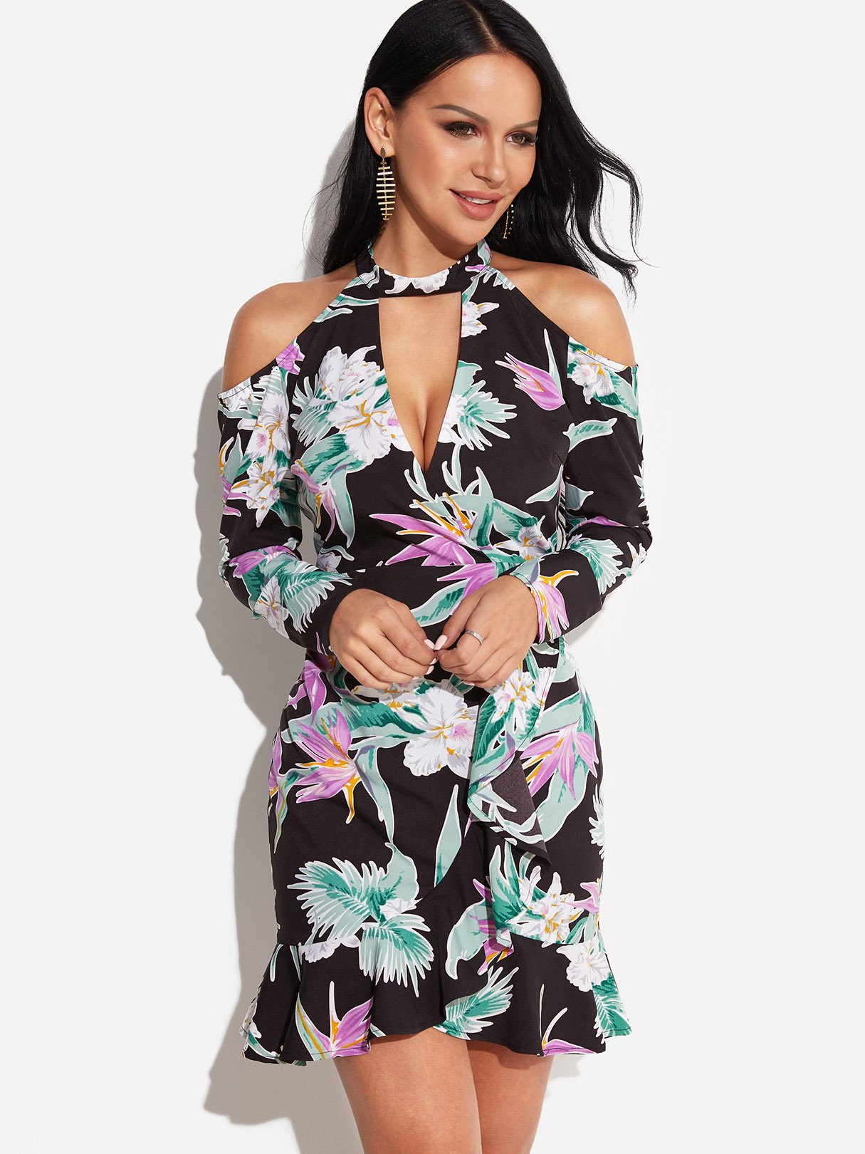 Black Crew Neck Cold Shoulder Long Sleeve Cut Out Dresses