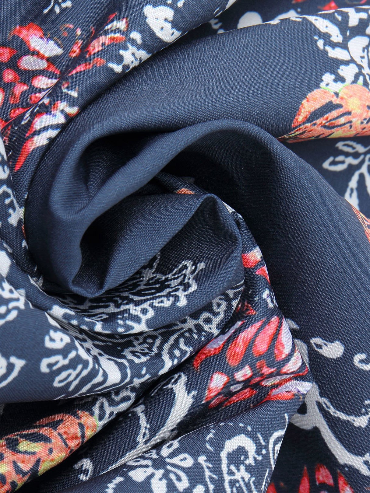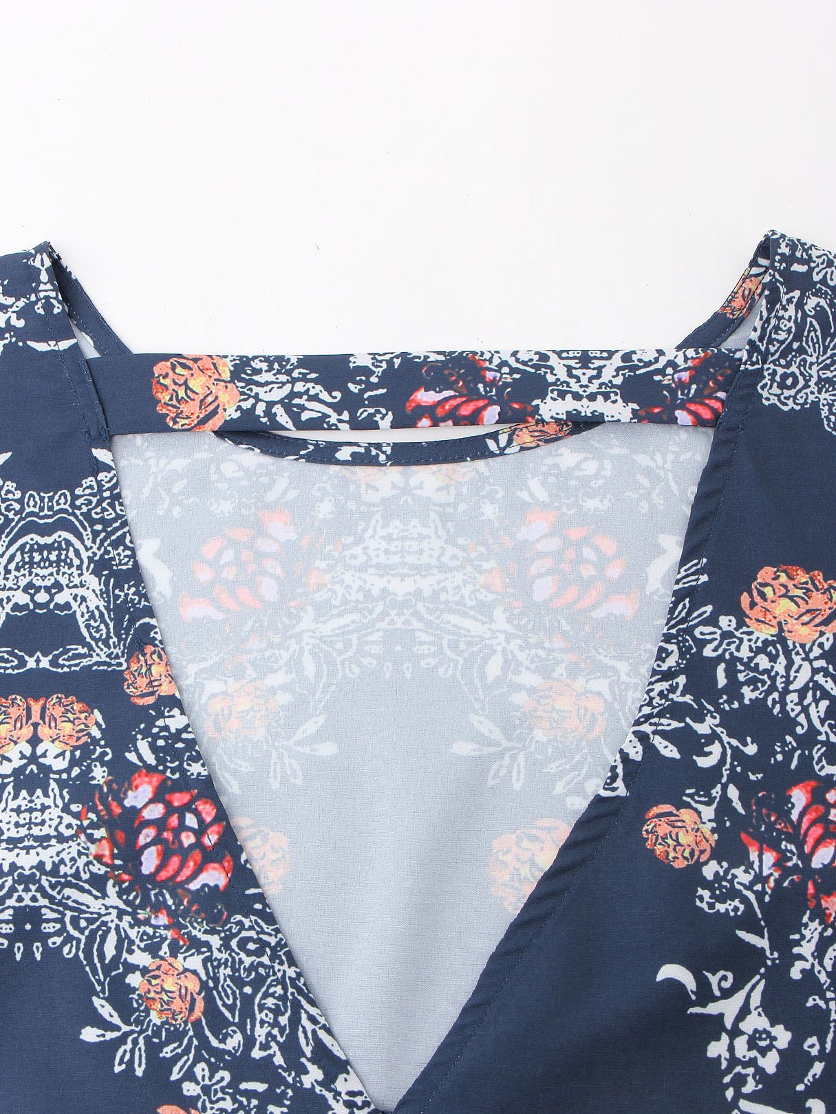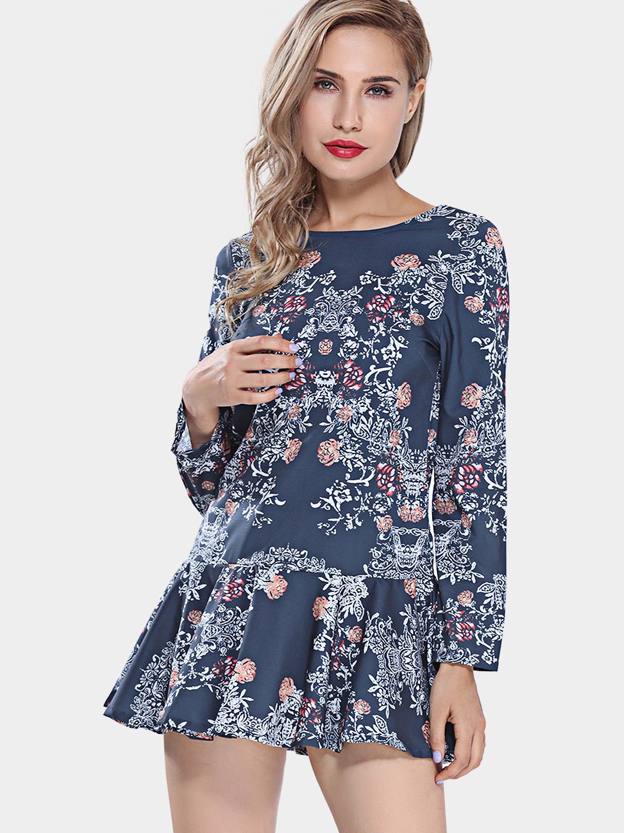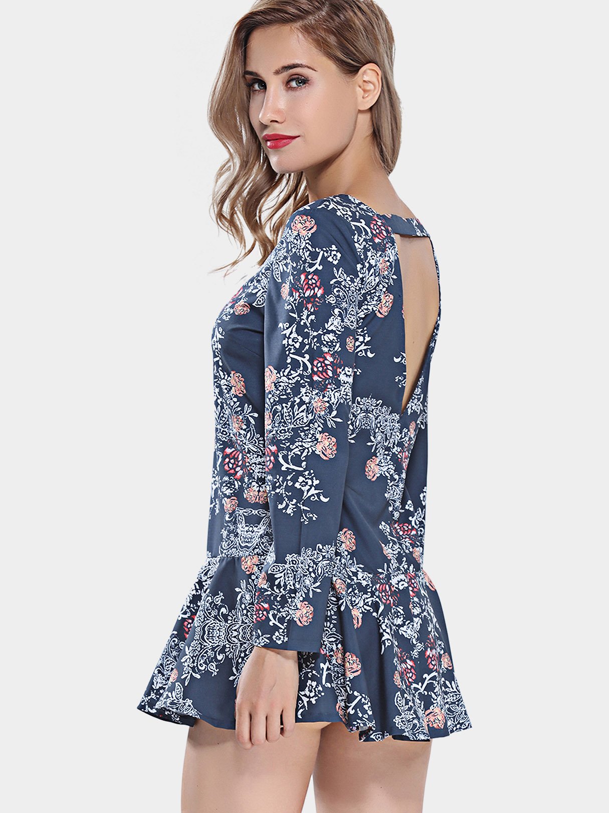 Black Crew Neck Long Sleeve Floral Print Cut Out Flounced Hem Dresses