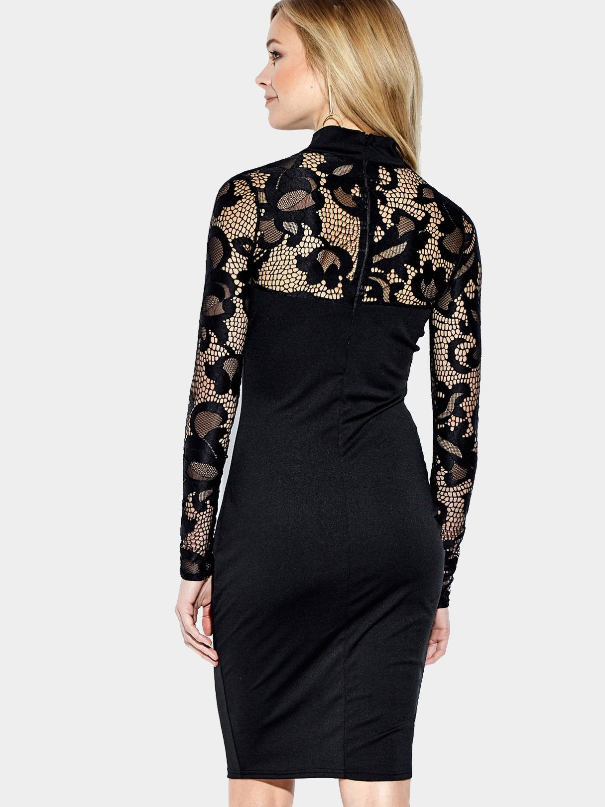 Black Crew Neck Long Sleeve Plain Lace Dresses
