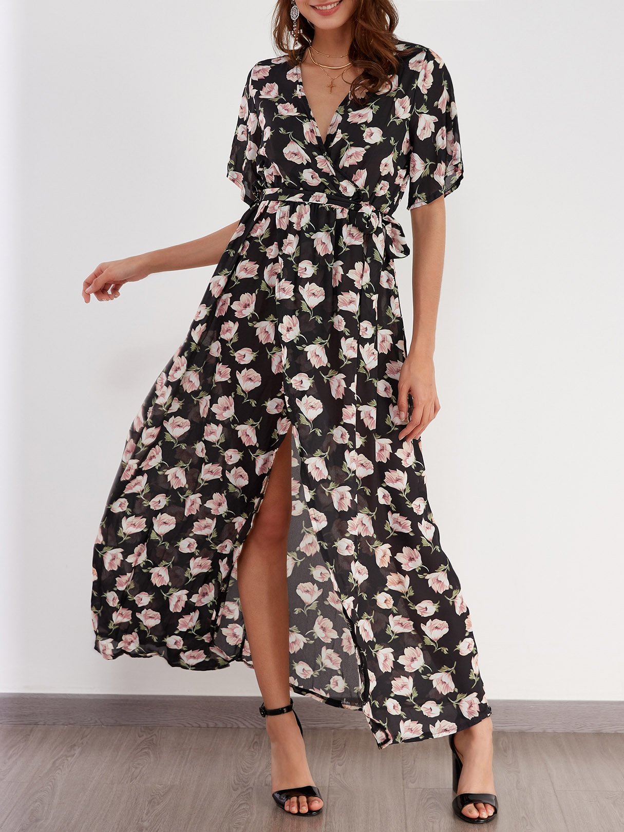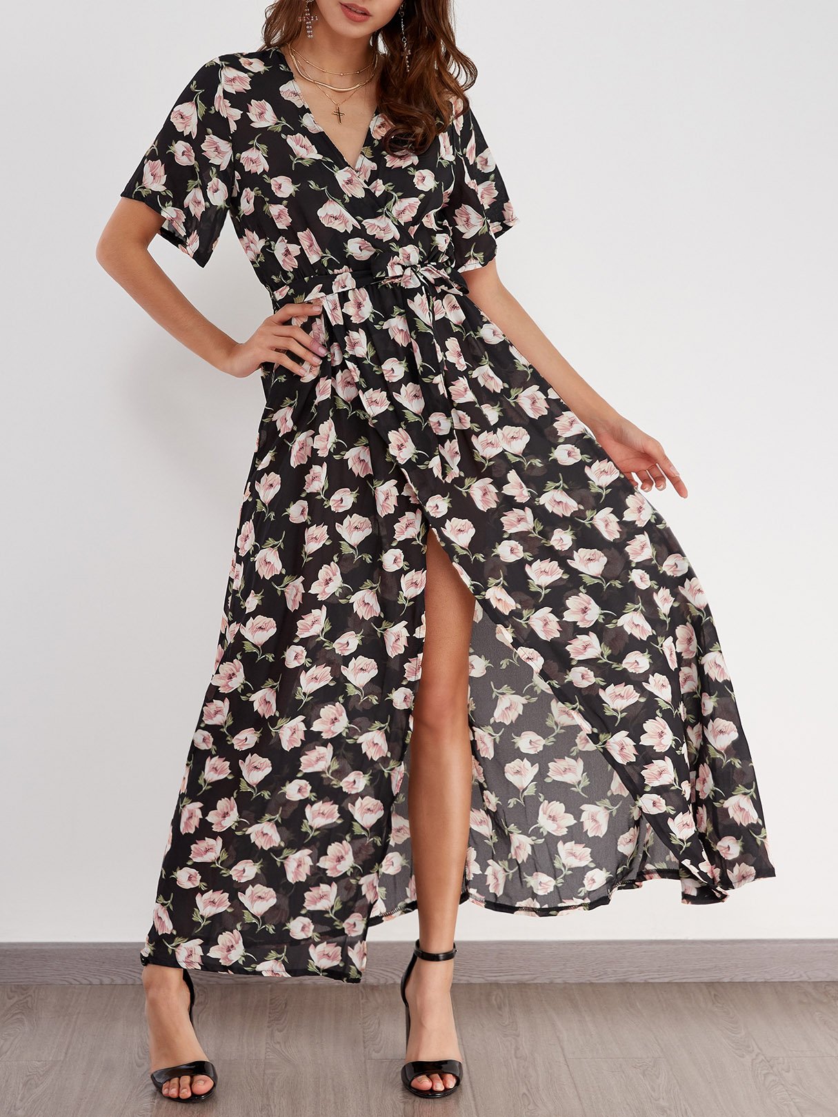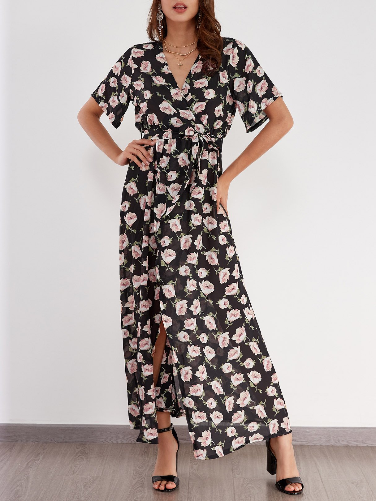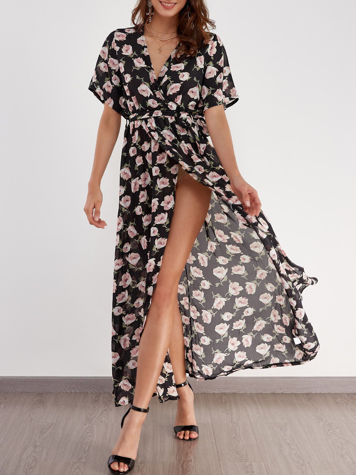 Material:PolyesterNeckline:Deep V NeckSeason:SummerSleeves:Short SleevesPattern:Floral PrintDetail:Slit DesignWaist Design:High-WaistedHem Design:Slit HemLength:MaxiFit:Regular Fit