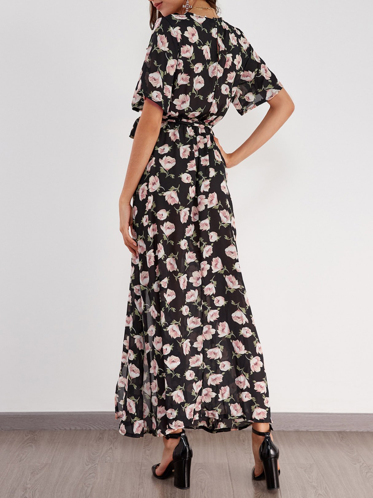 Black Deep V Neck Floral Print Short Sleeve Slit Hem Dresses - Black / S is backordered and will ship as soon as it is back in stock.