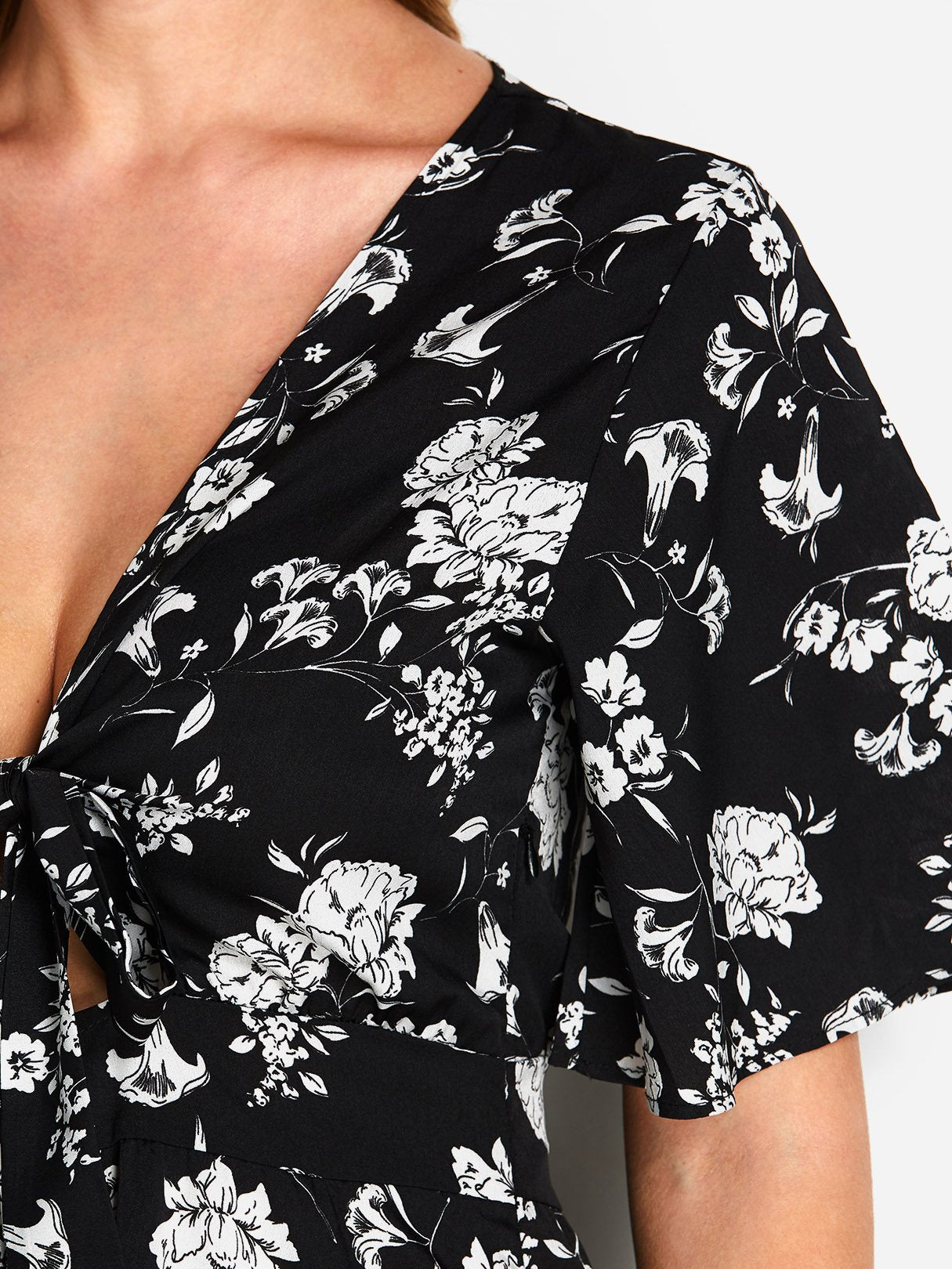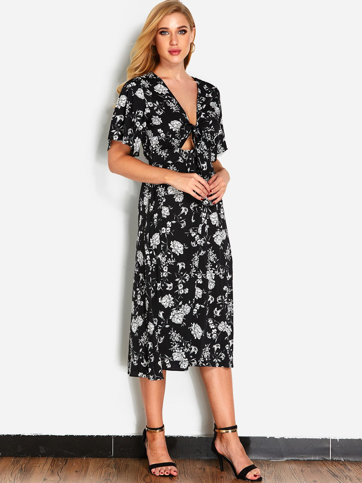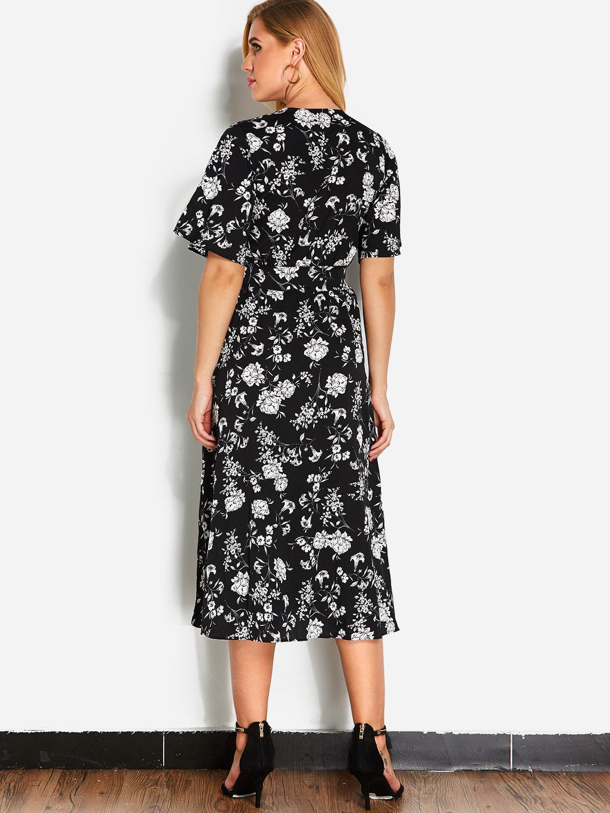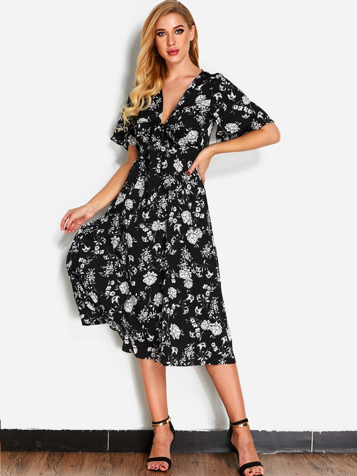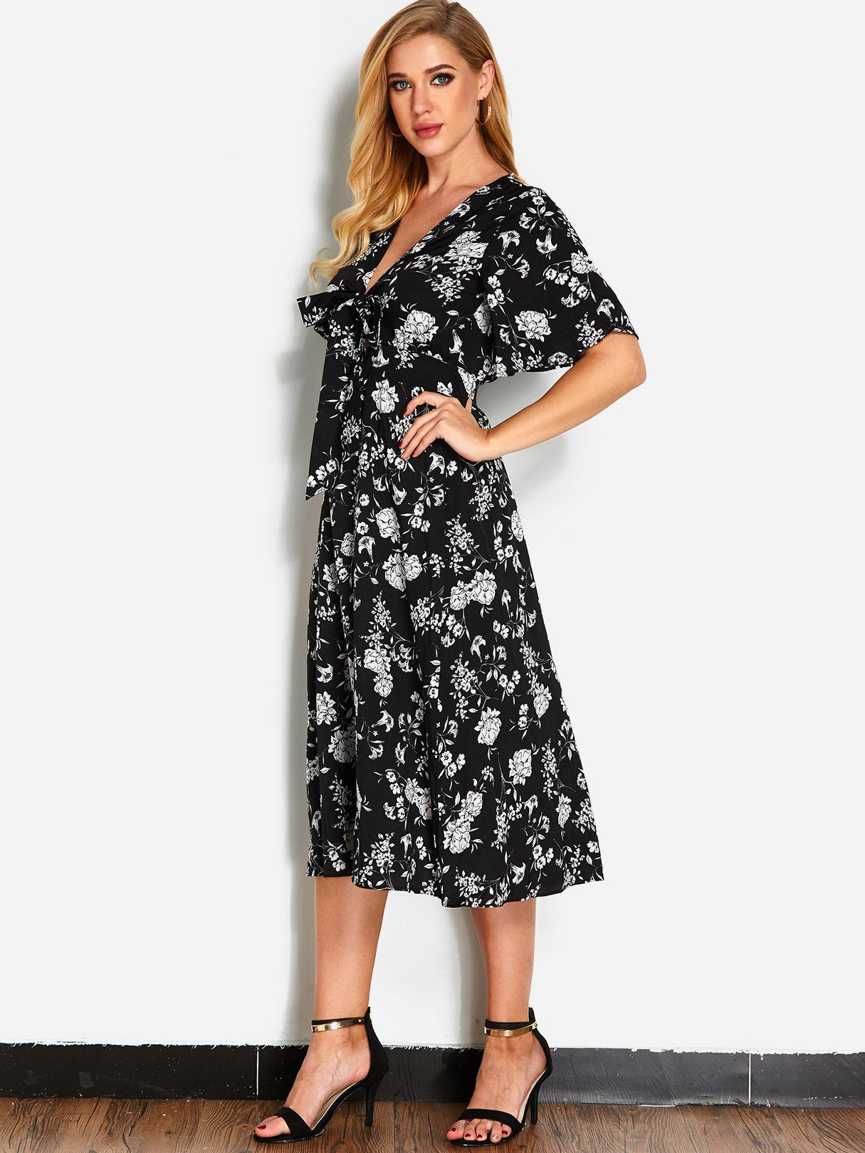 Black Deep V Neck Half Sleeve Floral Print Dresses - Black / S is backordered and will ship as soon as it is back in stock.