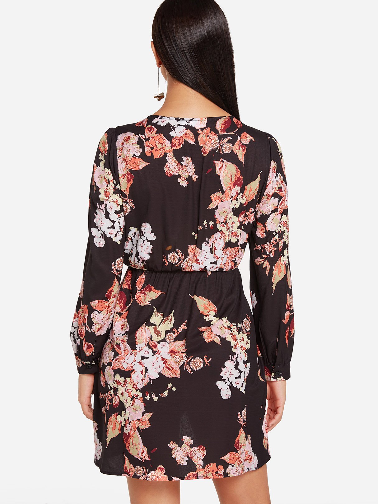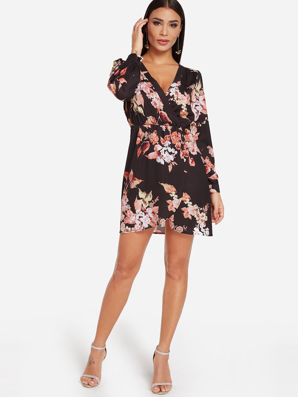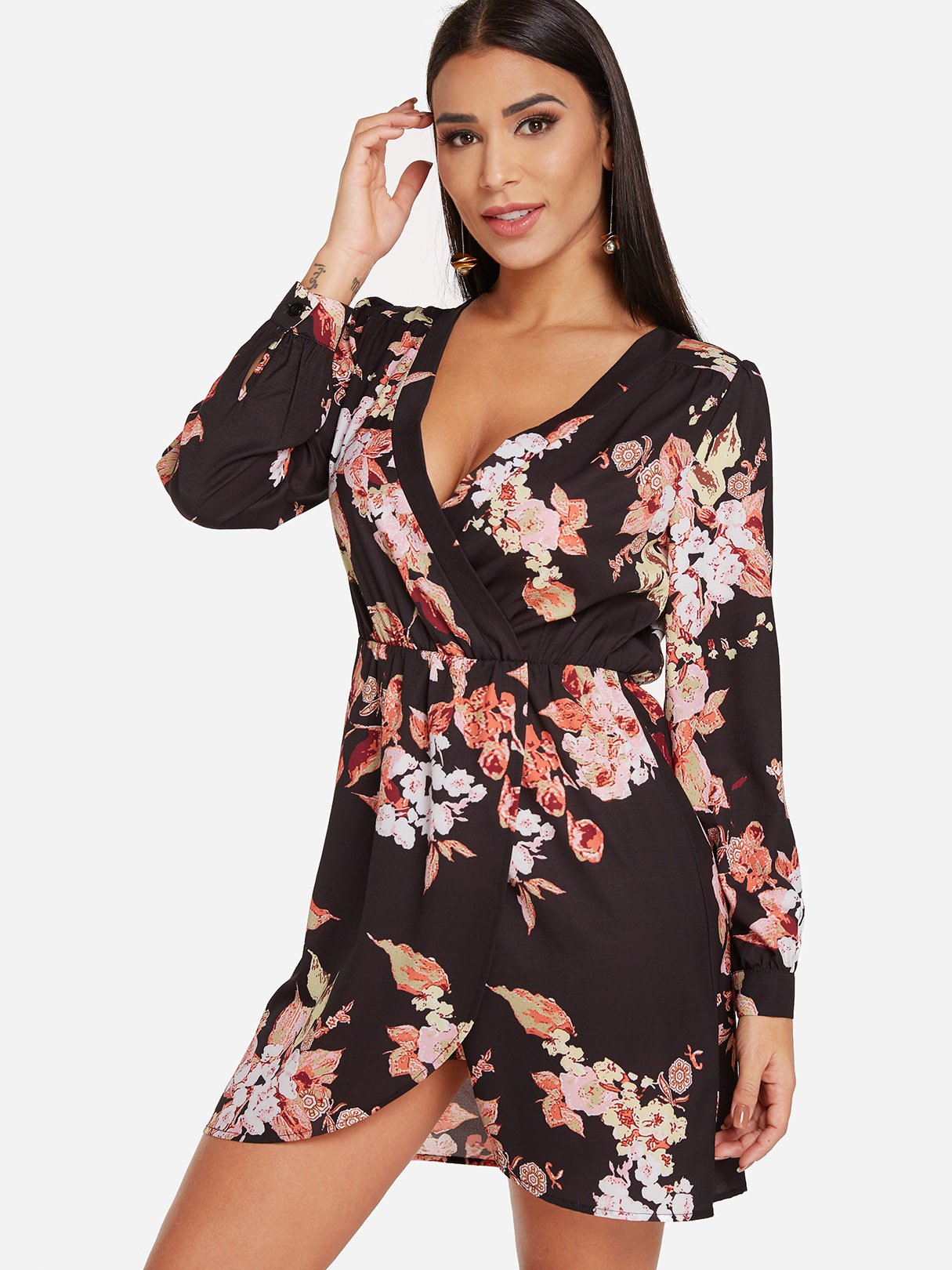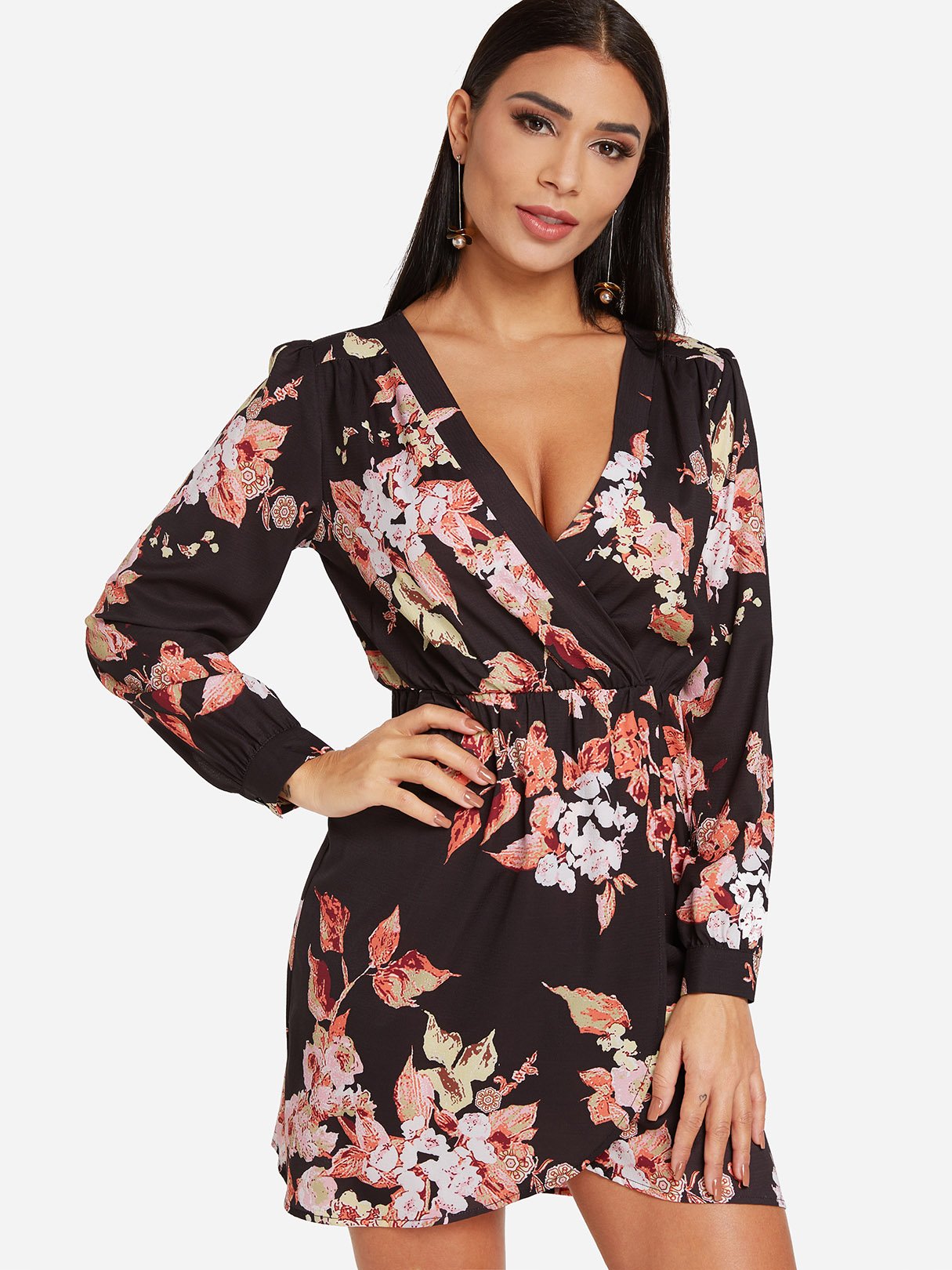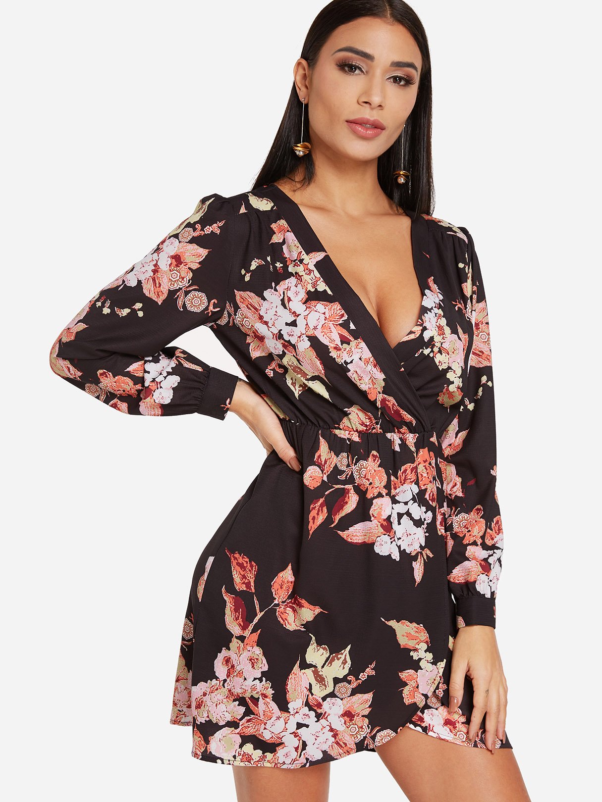Material:PolyesterNeckline:Deep V NeckSeason:Autumn,WinterSleeves:Long SleevesPattern:Floral PrintStyle:Casual Style,Sexy StyleDetail:Crossed Front Design,Slit DesignWaist Design:Stretch WaistbandHem Design:Slit HemLength:MiniFit:Regular Fit