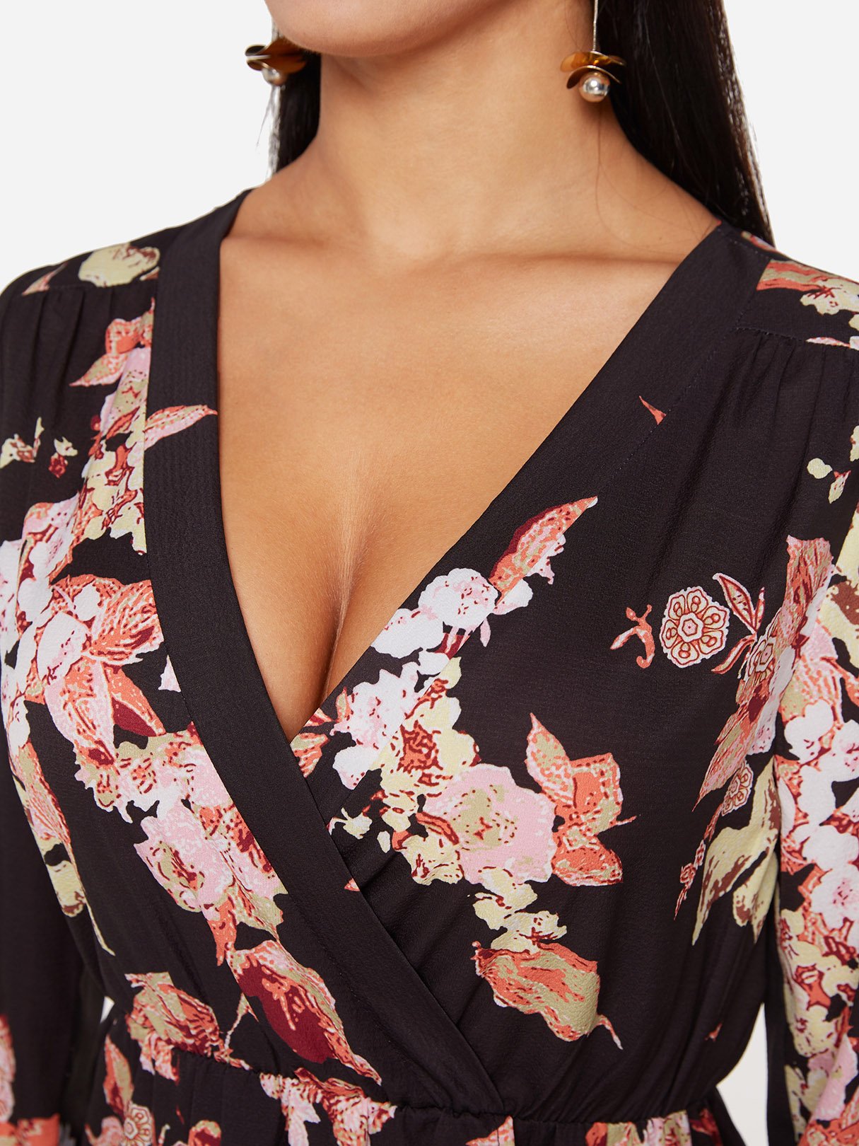 Black Deep V Neck Long Sleeve Floral Print Crossed Front Slit Hem Dresses - Black / S is backordered and will ship as soon as it is back in stock.