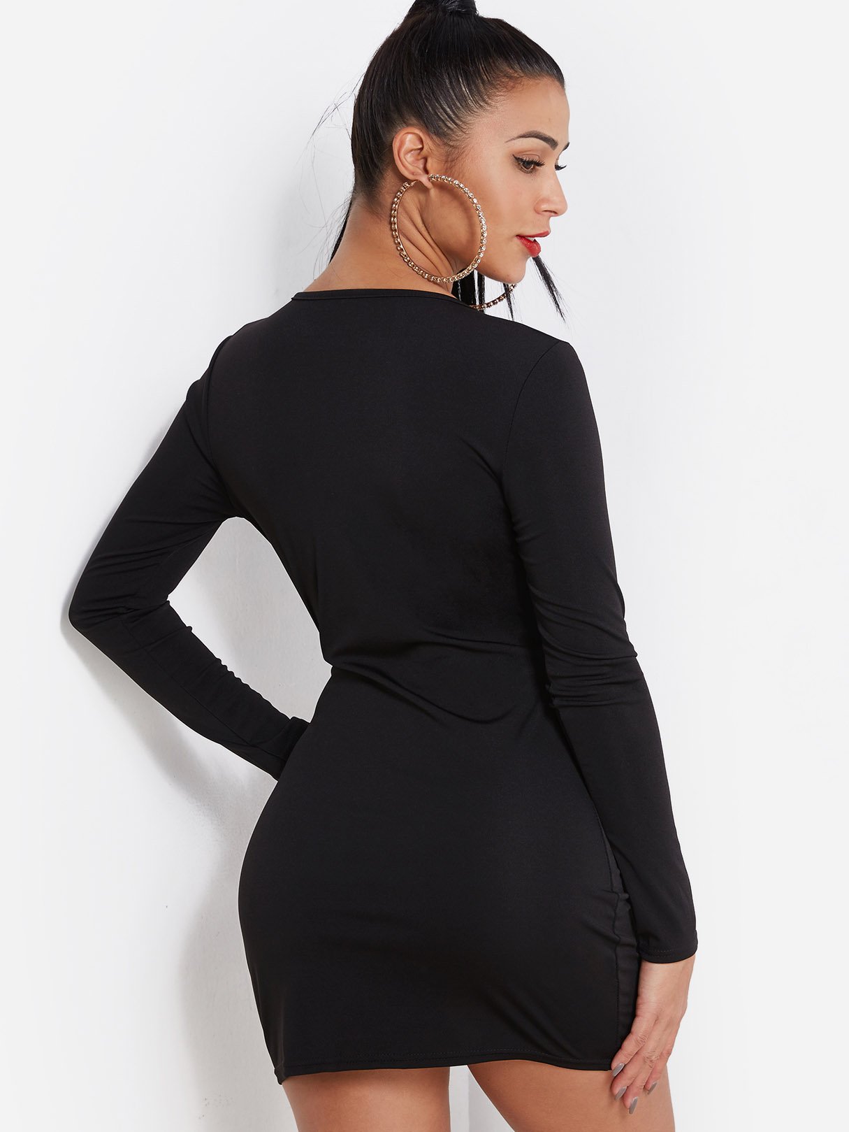 Black Deep V Neck Long Sleeve Letter Bodycon Dresses - Black / S is backordered and will ship as soon as it is back in stock.