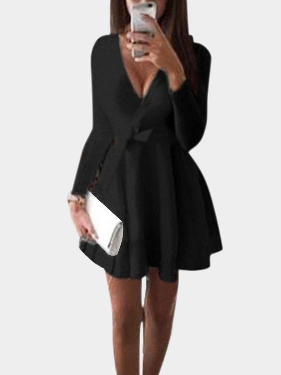 Material:PolyesterNeckline:V-Neck,Deep V NeckSeason:Spring,Autumn,WinterSleeves:Long SleevesPattern:PlainStyle:Sexy Style,Little Black DressWaist Design:Tight WaistHem Design:Ruffle HemLength:MiniFit:Regular Fit