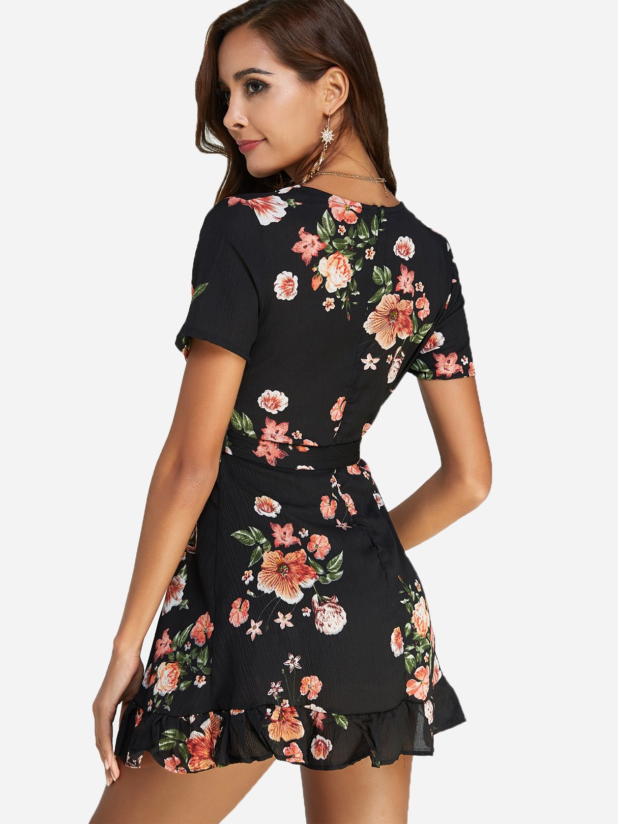 Black Deep V Neck Short Sleeve Floral Print Zip Back Belt Wrap Flounced Hem Mini Dresses - Black / S is backordered and will ship as soon as it is back in stock.