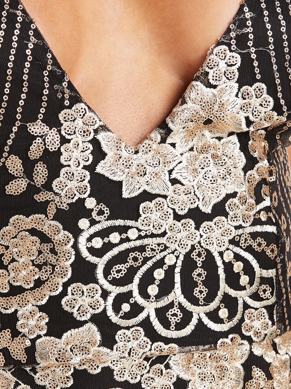 Black Deep V Neck Sleeveless Embroidered Backless Lace-Up Sequins Embellished Spaghetti Strap Flounced Hem Mini Dresses