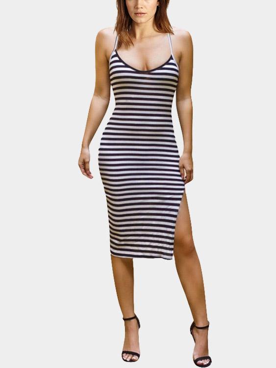 Black Halter Sleeveless Stripe Backless Slit Hem Dresses