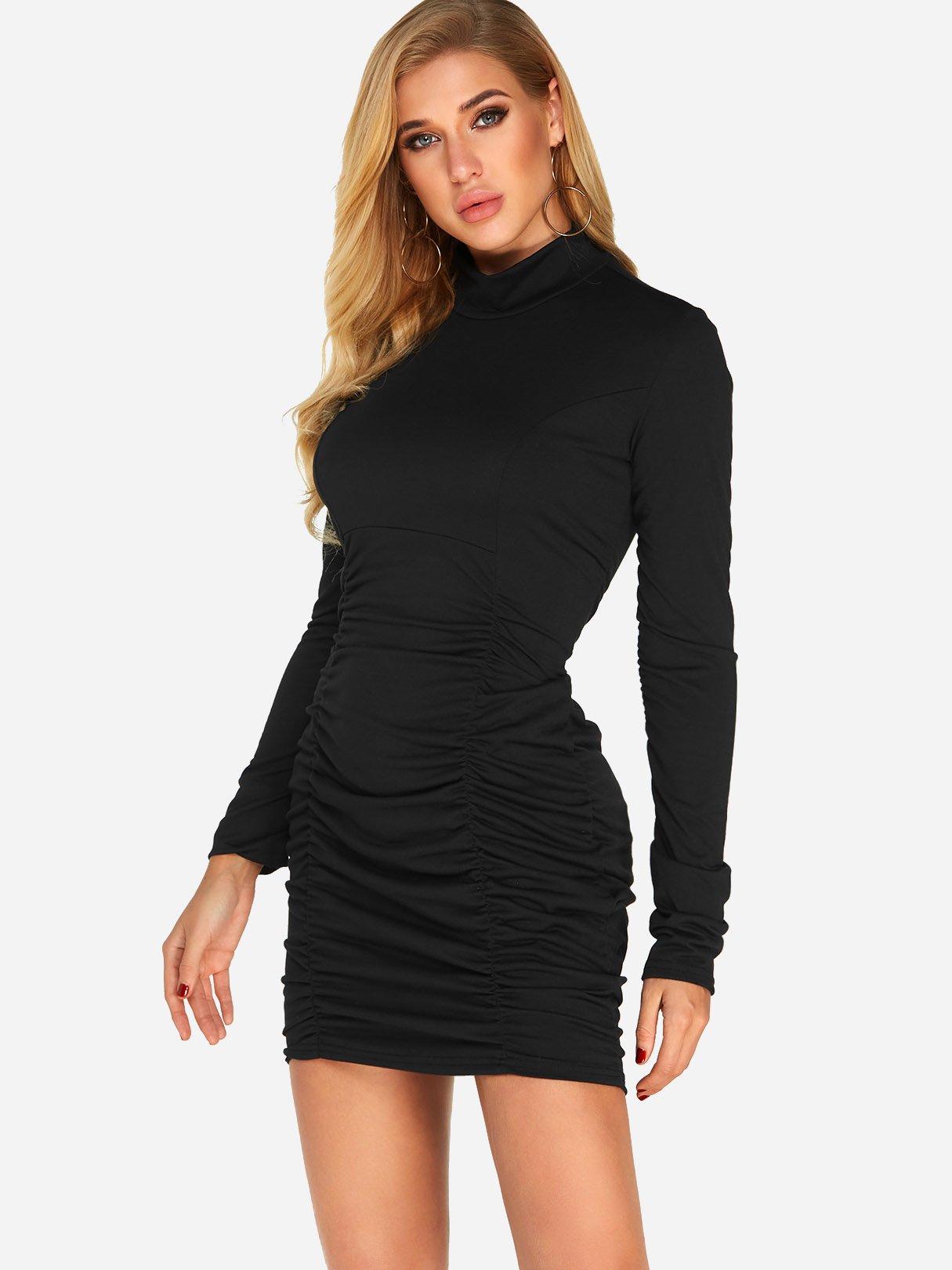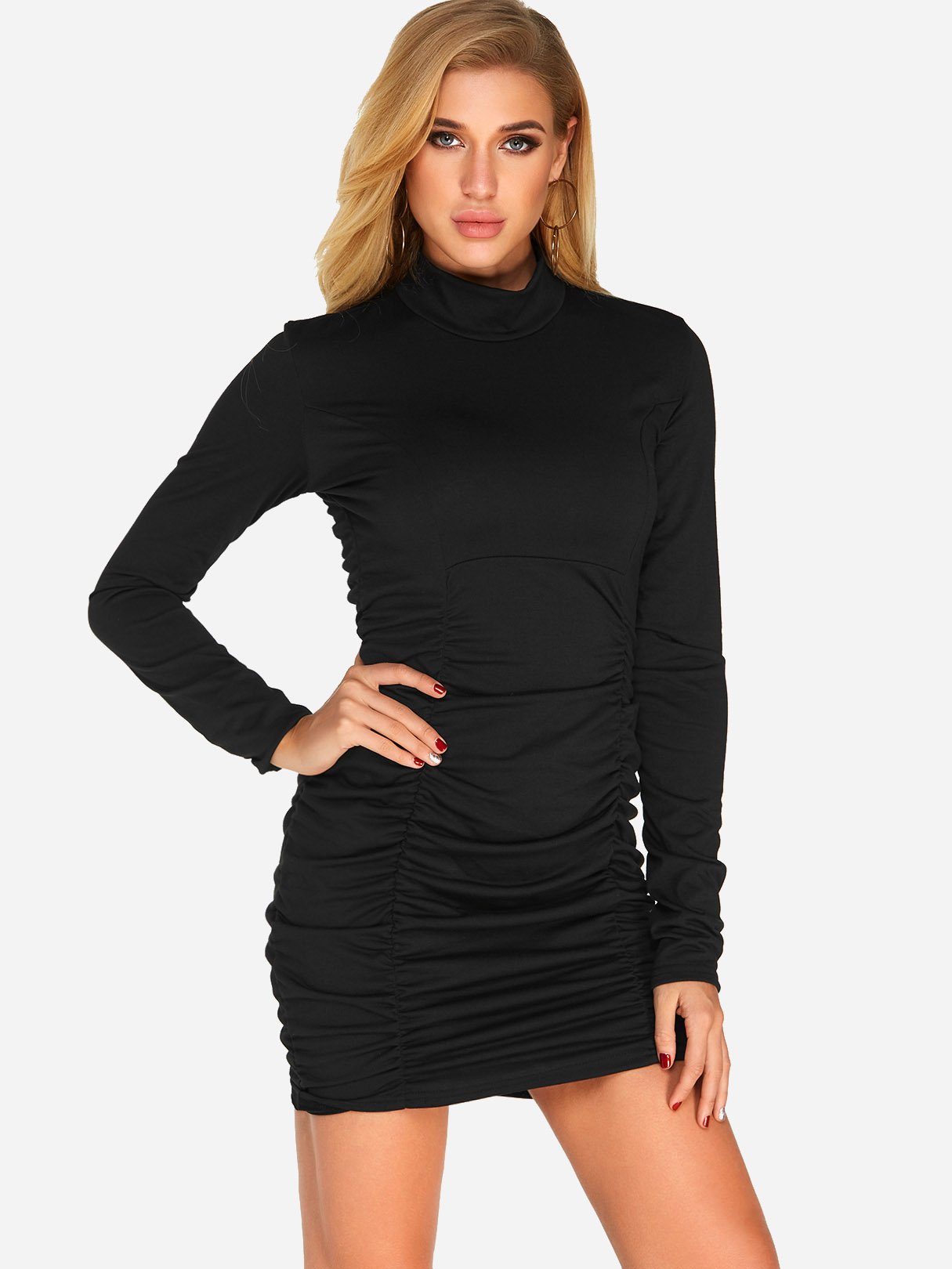 Black High Neck Long Sleeve Plain Pleated Mini Dress