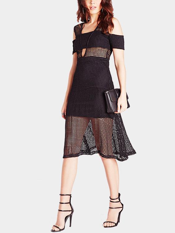 Black Hollow Out Cold Shoulder Layed Midi Dress