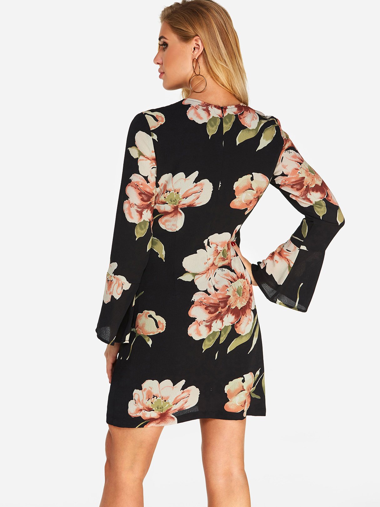 Material:PolyesterNeckline:Round NeckSeason:Autumn,WinterSleeves:Long SleevesPattern:Floral PrintLength:MiniFit:Loose FitSleeves Type:Bell Sleeves