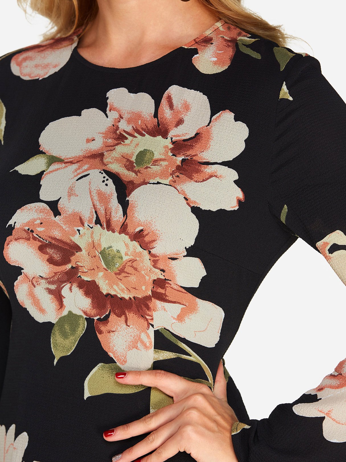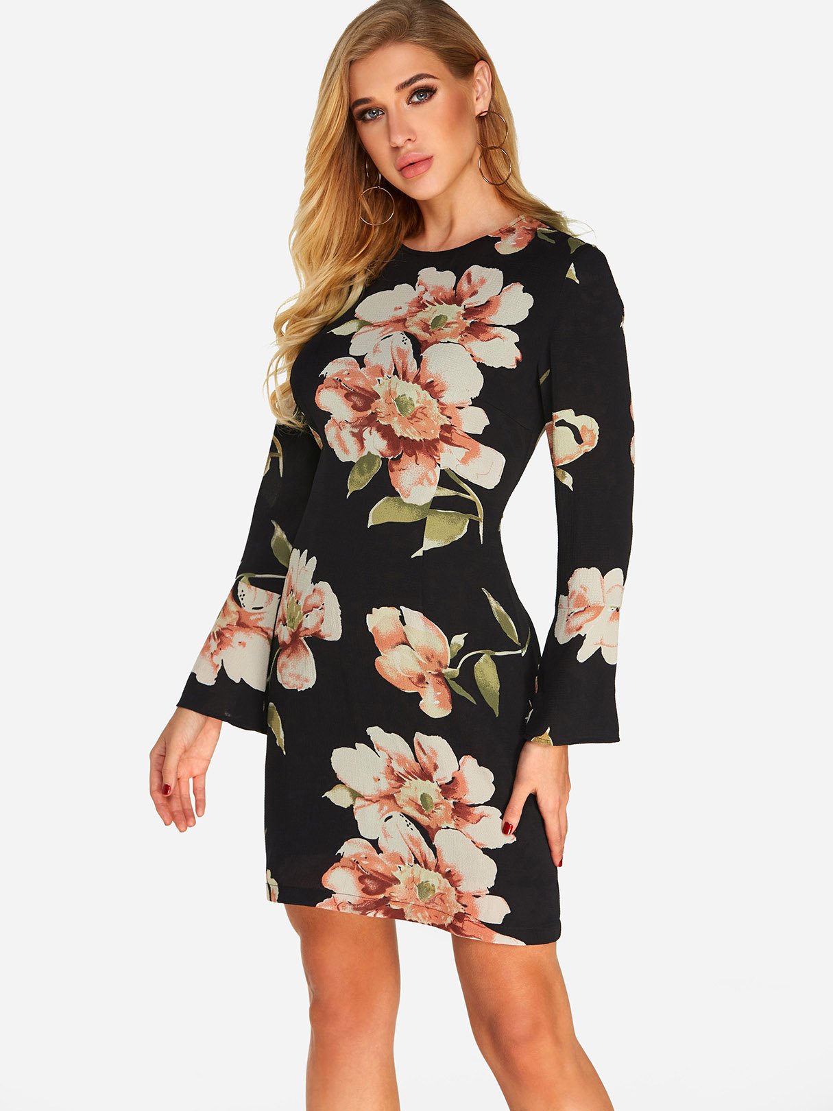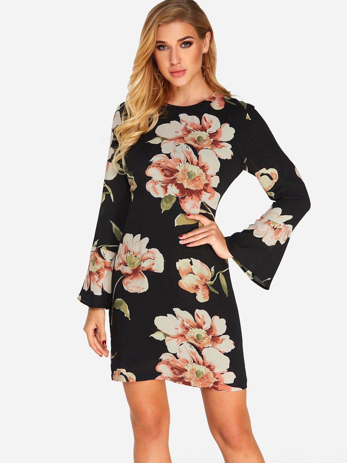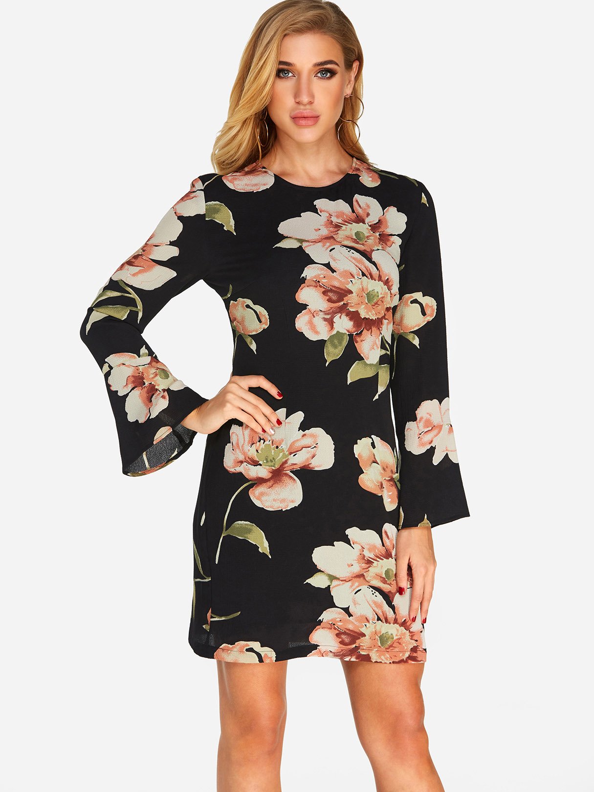 Black Long Sleeve Round Neck Floral Print Fashion Mini Dress - Black / S is backordered and will ship as soon as it is back in stock.