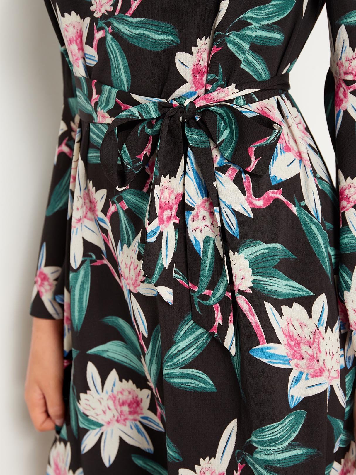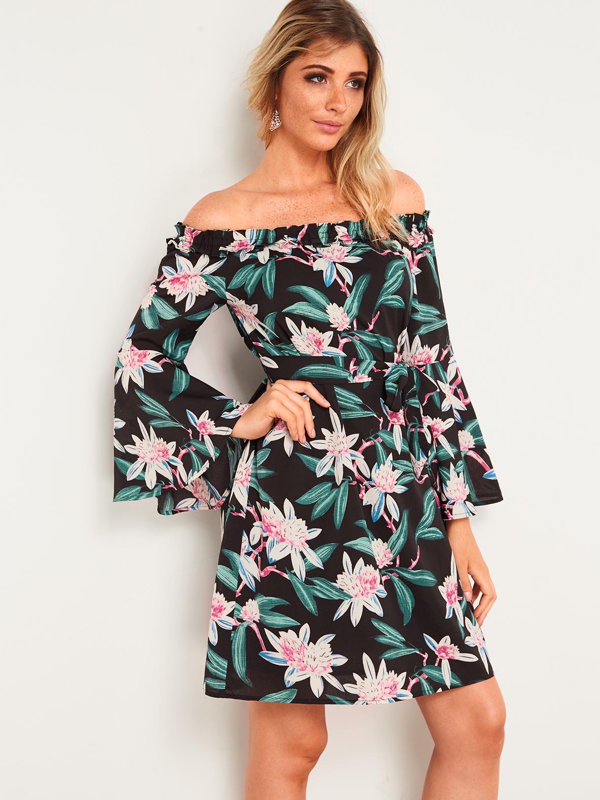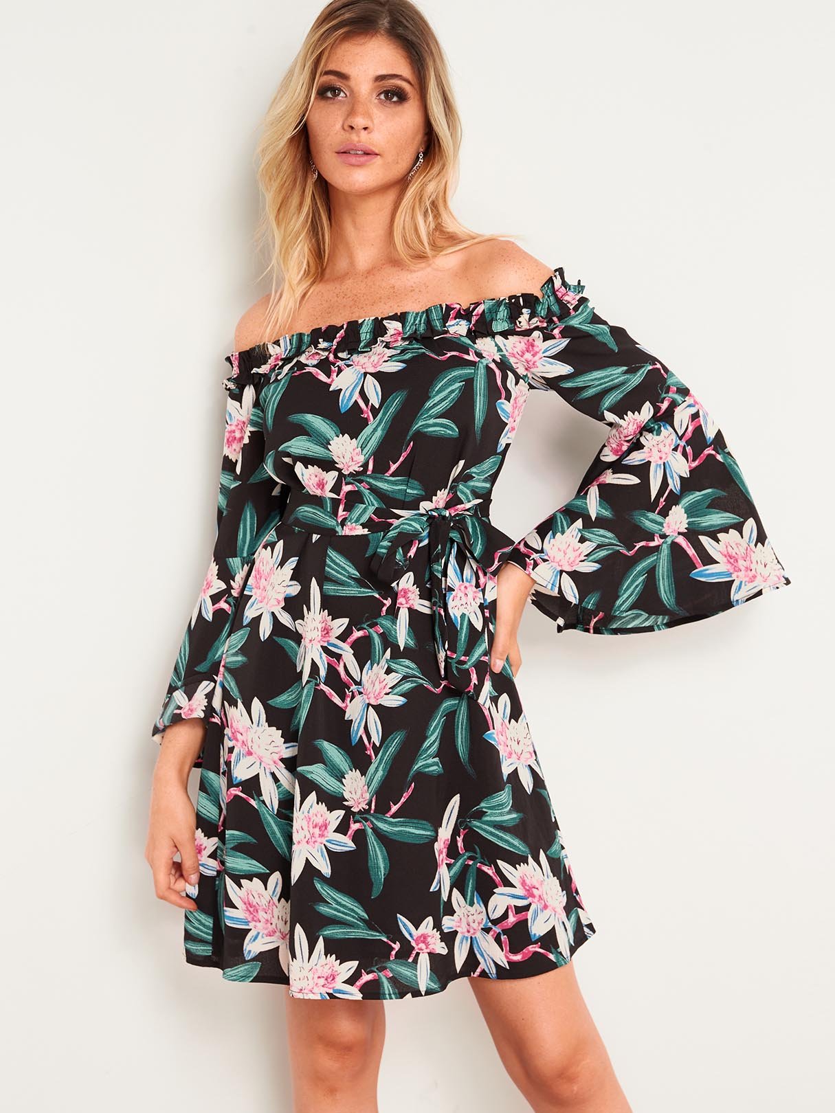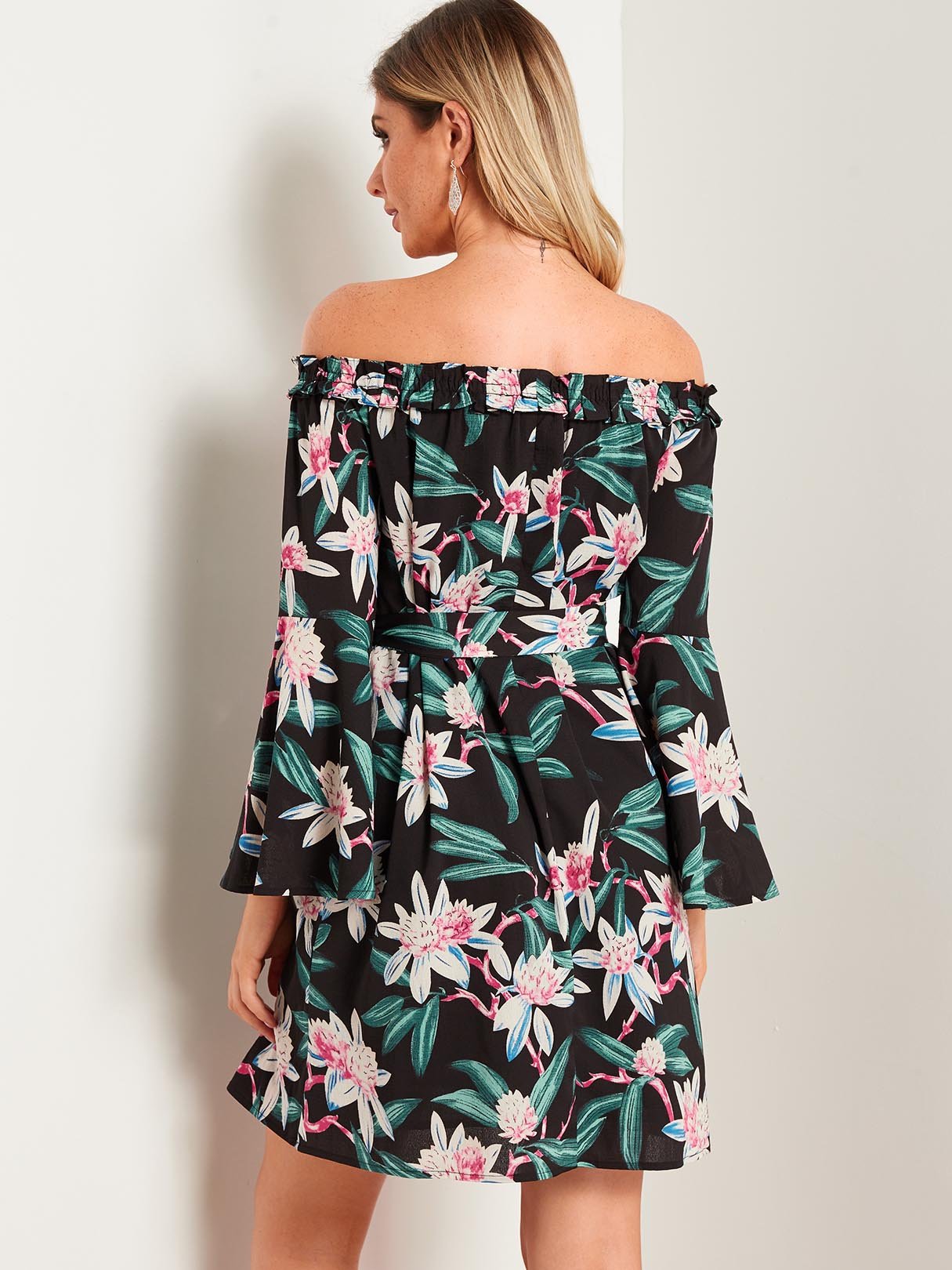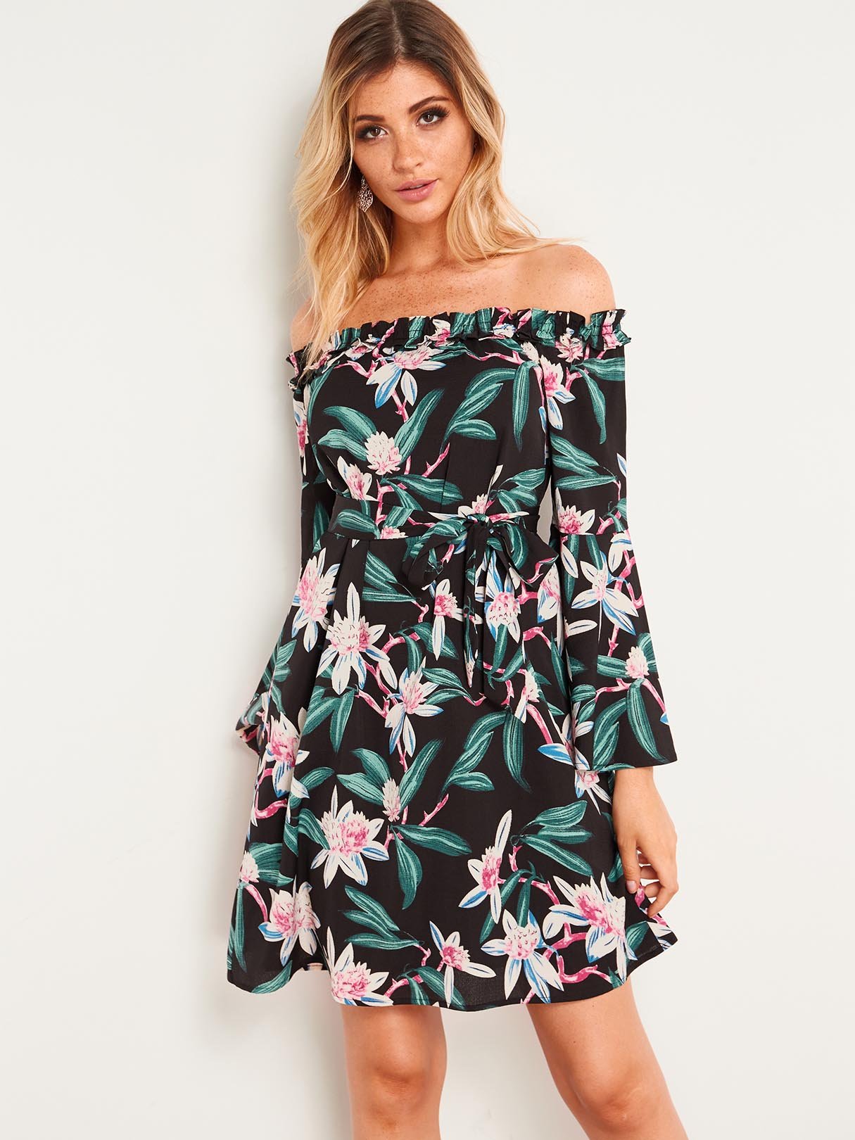 Black Off The Shoulder Long Sleeve Floral Print Lace-Up Dress