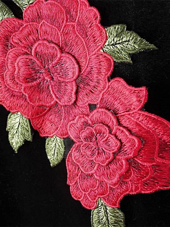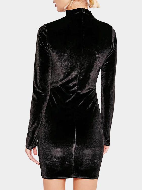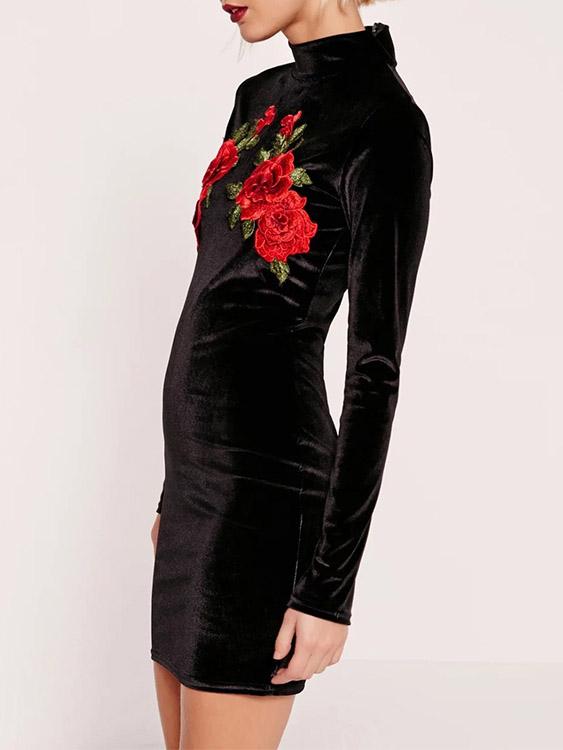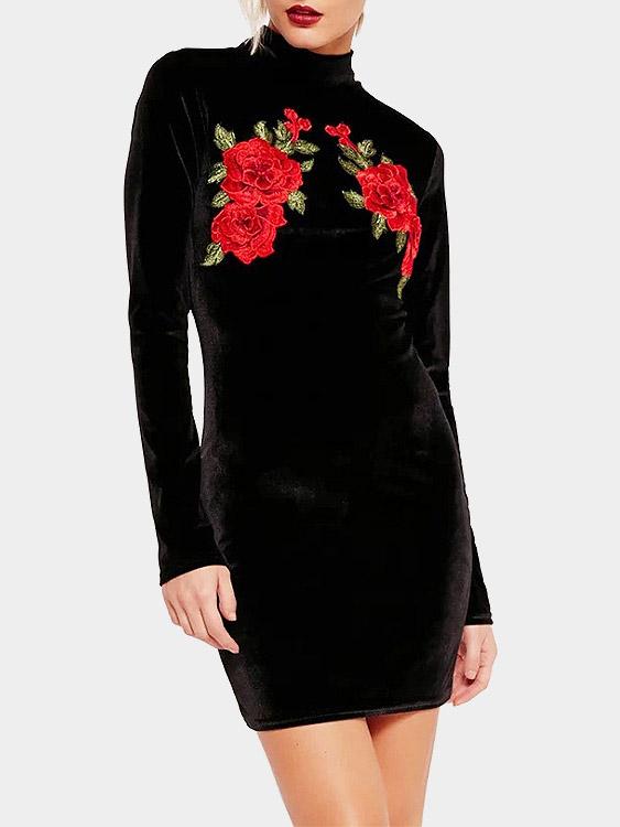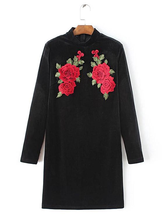 Black Perkins Collar Long Sleeve Embroidered Zip Back Dresses